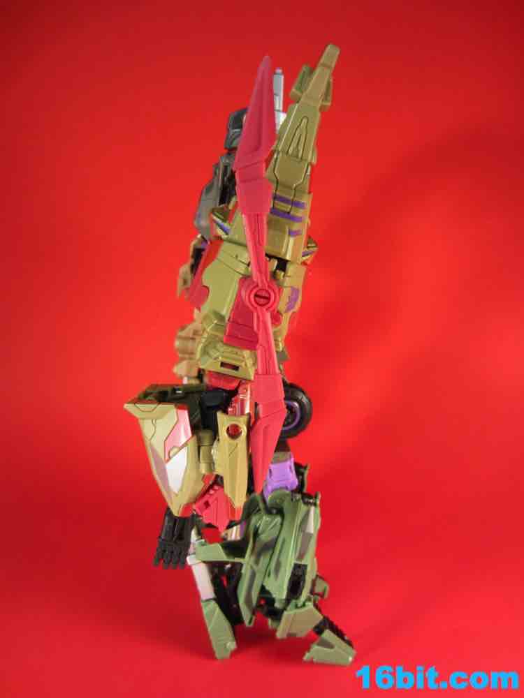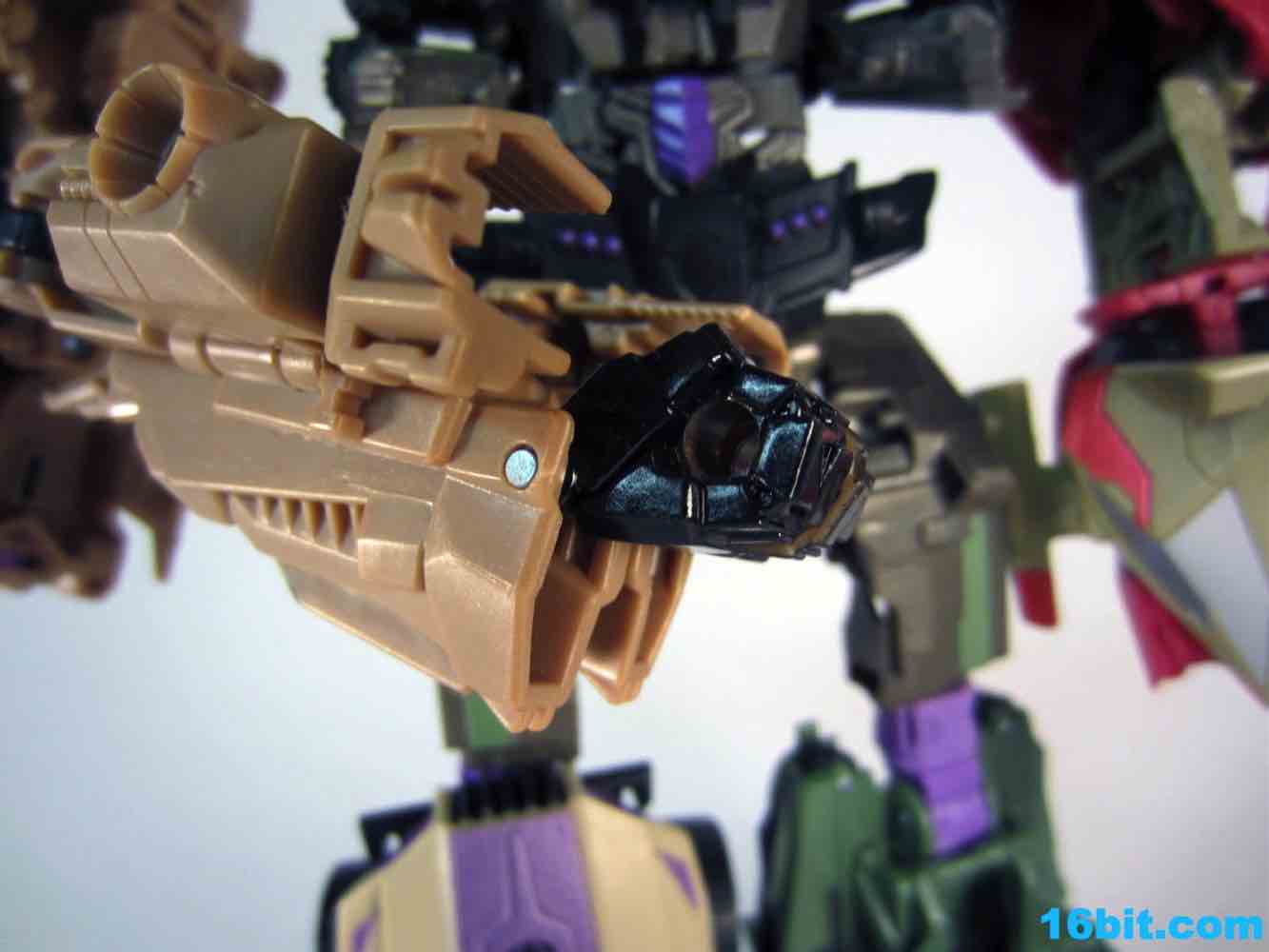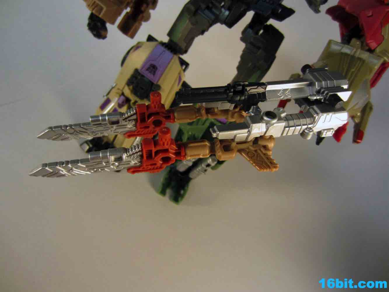 Now, this is where I get confused. The individually-packaged retail Onslaught seems to be colored more closely to the game than the one in this set, but the four toys making up the limbs in this set are pretty darned close to the games, minus some pink/purple paint details. The figure has a pretty solid individual vehicle mode, a very good "torso" mode, and a so-so robot mode. He looks OK standing on a shelf, but I don't find him too fun to play with. His weapon is a decent update of the original, and forms the central hub for the combined mode's mega-weapon. Which, uh, looks pretty dumb, I gotta say. You can also store Bruticus' weapon on the combined Bruticus' back, which looks pretty swell and is how the toy was packaged.