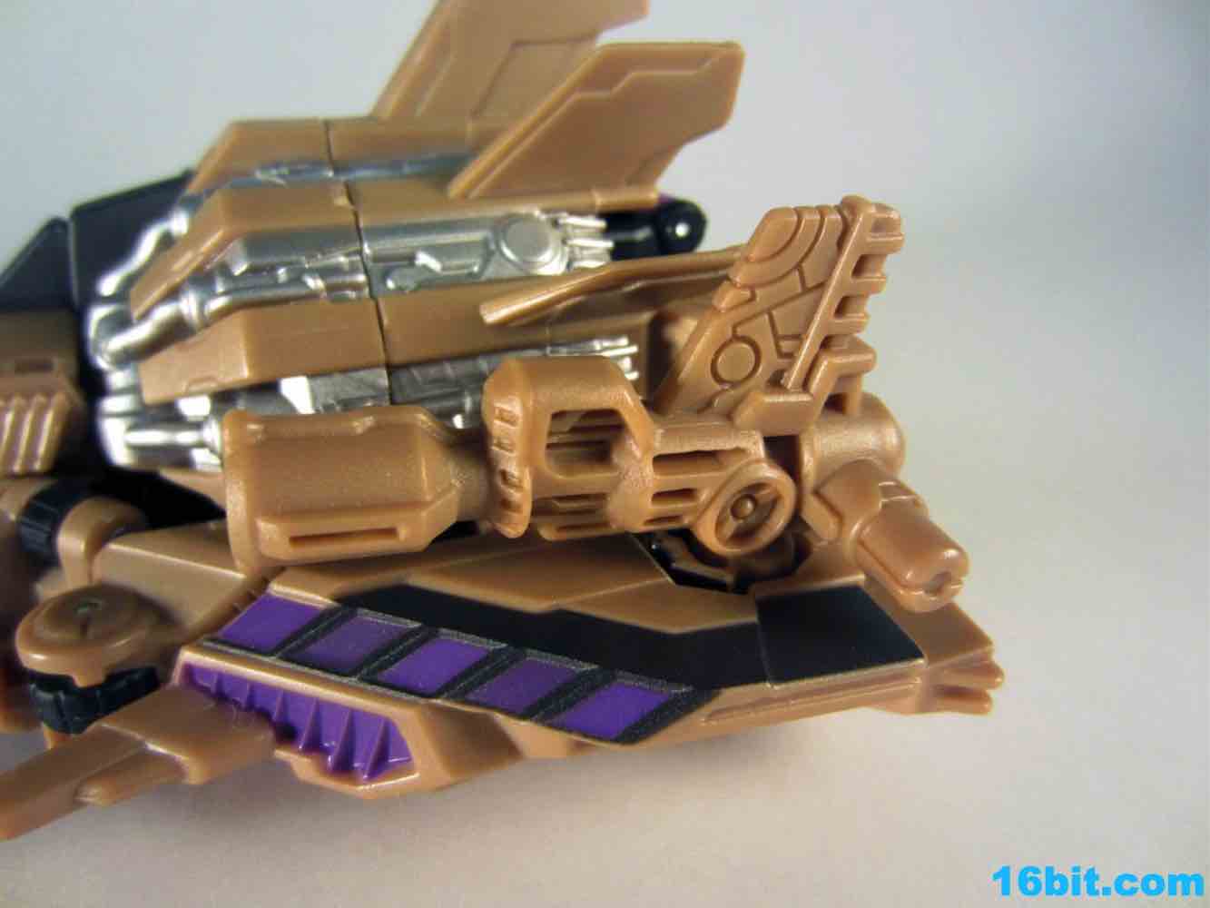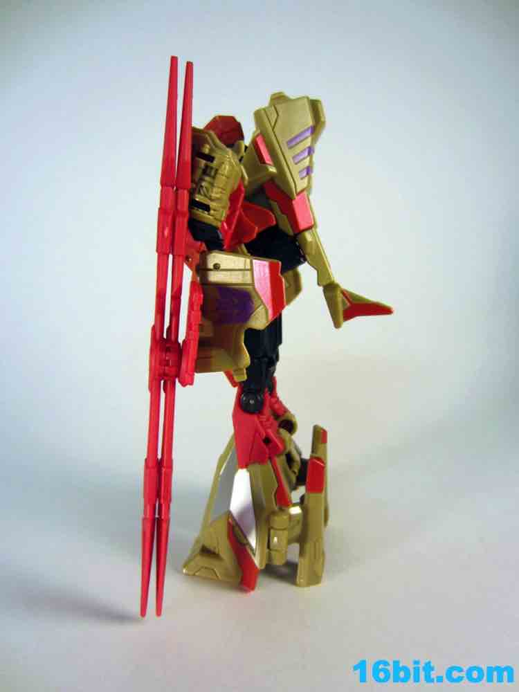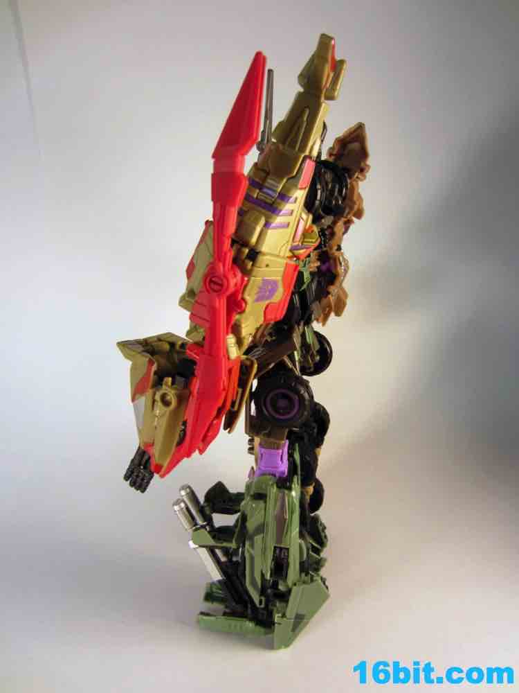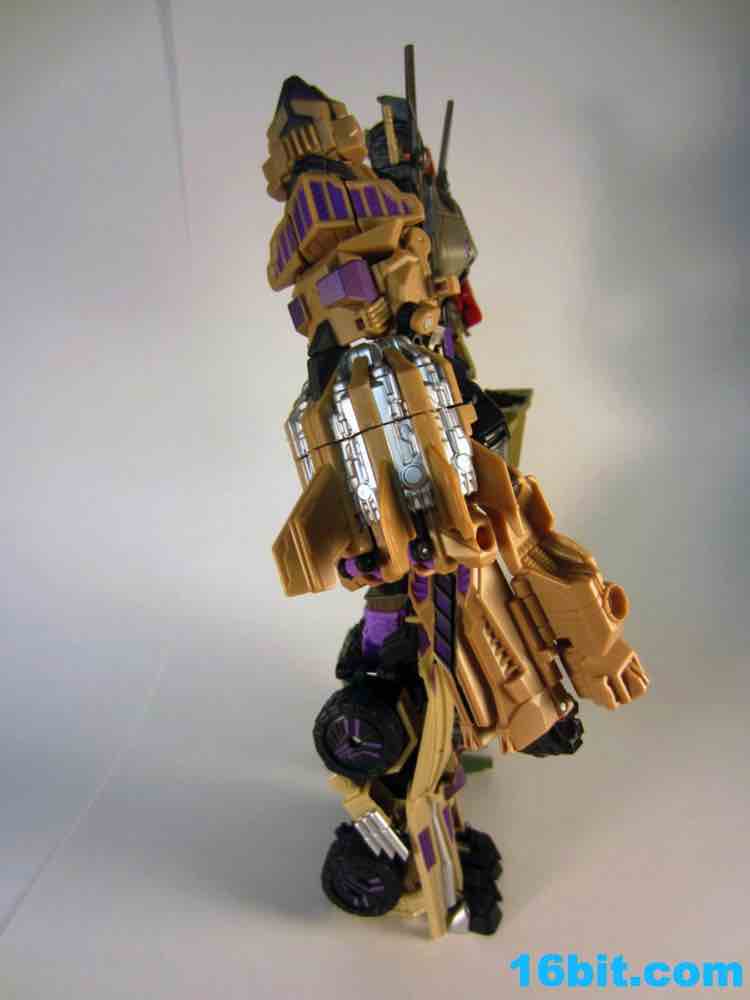 Now, this is where I get confused. The individually-packaged retail Onslaught seems to be colored more closely to the game than the one in this set, but the four toys making up the limbs in this set are pretty darned close to the games, minus some pink/purple paint details. The figure has a pretty solid individual vehicle mode, a very good "torso" mode, and a so-so robot mode. He looks OK standing on a shelf, but I don't find him too fun to play with. His weapon is a decent update of the original, and forms the central hub for the combined mode's mega-weapon. Which, uh, looks pretty dumb, I gotta say. You can also store Bruticus' weapon on the combined Bruticus' back, which looks pretty swell and is how the toy was packaged.