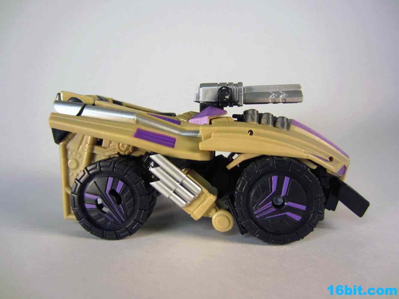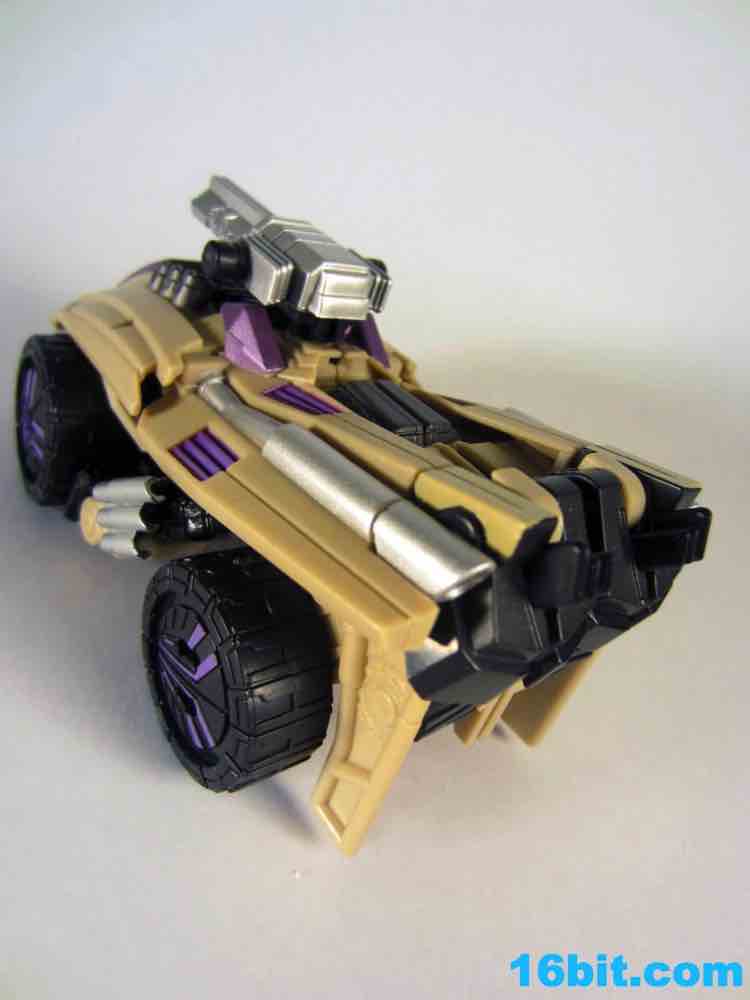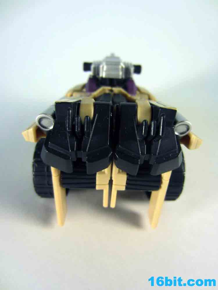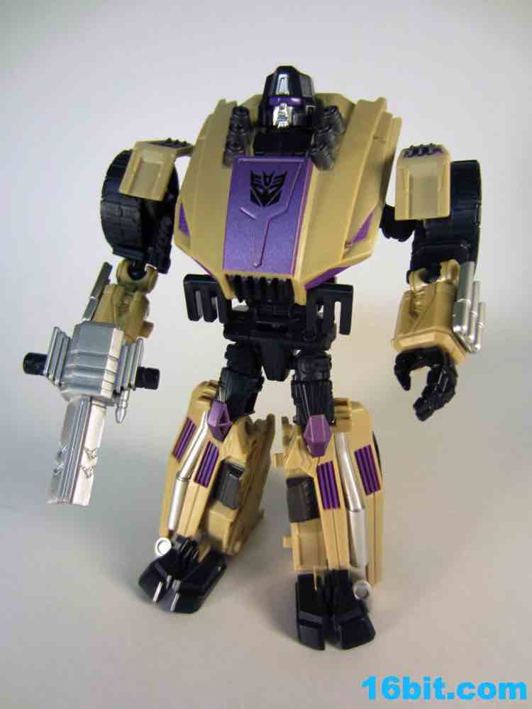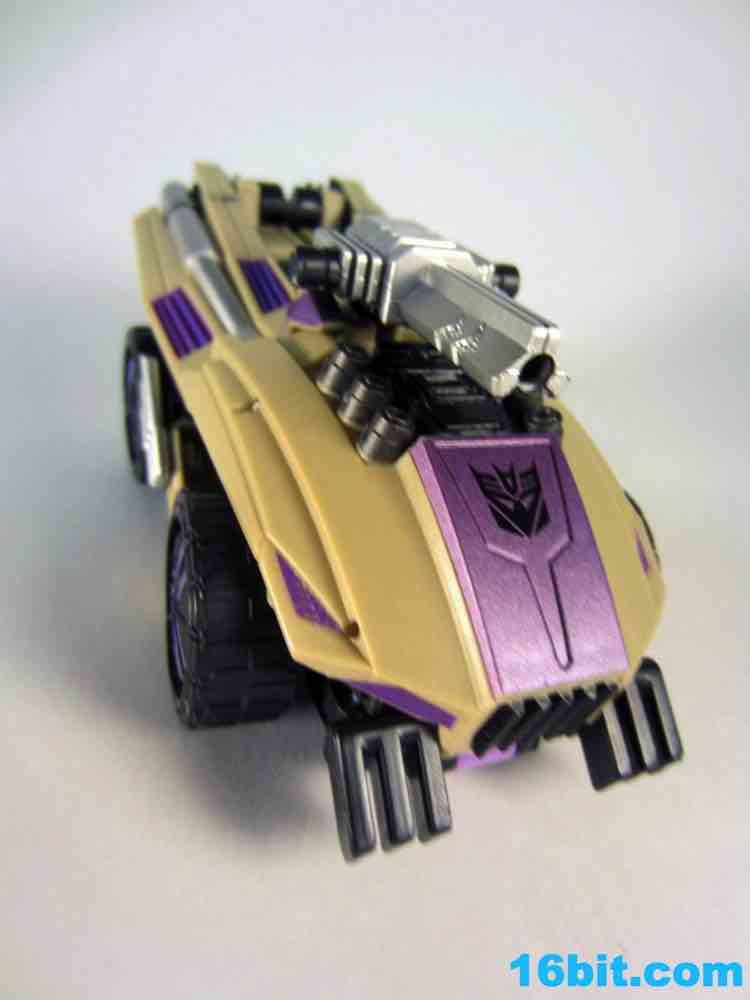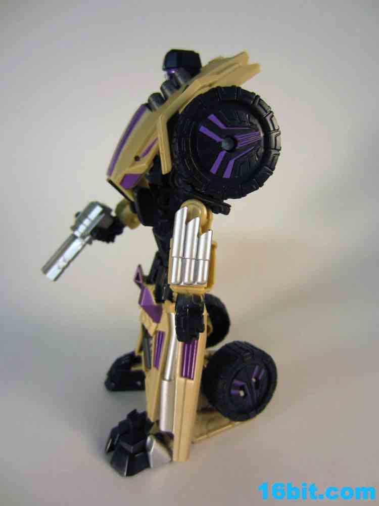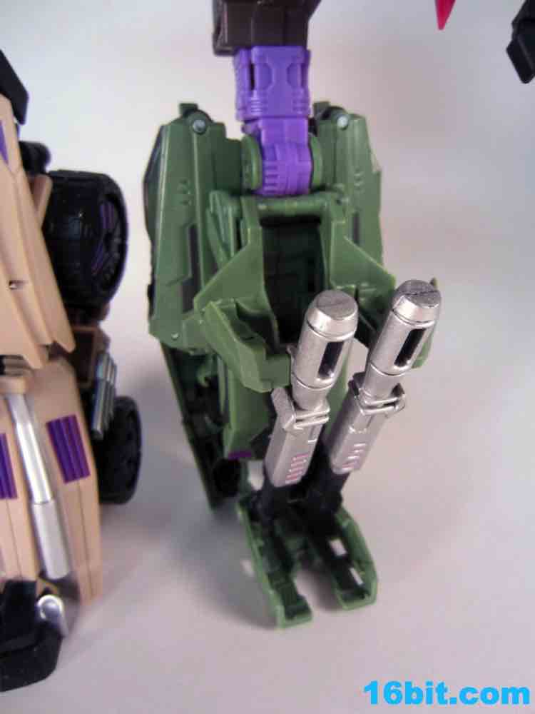 The most compelling design in the set is probably also the largest, with Swindle. Of the entire Combaticon squad, he seems to get the most love in the fiction, and from fans. The tan version looks great here, but there's a yellow version sold individually which looks good and a bright red G2-inspired version which is also great. The "leg mode" feels like you flipped a couple of panels and stood the vehicle mode up on its backside. It's pretty easy to pull off, and there are some nifty Hot Rod-esque pipes on Swindle's robot mode forearms. A black Decepticon logo rests on a purple stripe on the vehicle's hood, and the wheels have some nice purple markings on the hubcaps. He has a sizable black blaster painted silver, and I like it. Easily, it's the best weapon in the set.