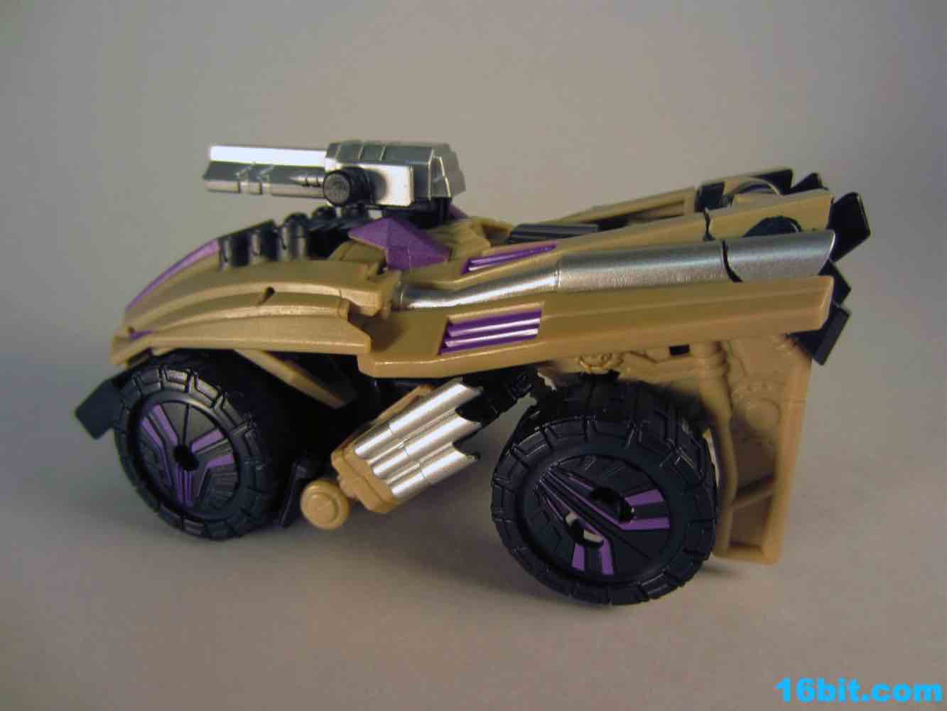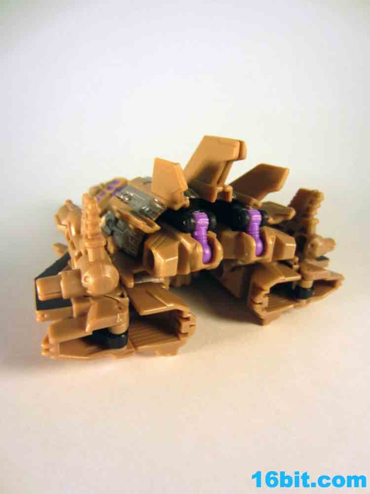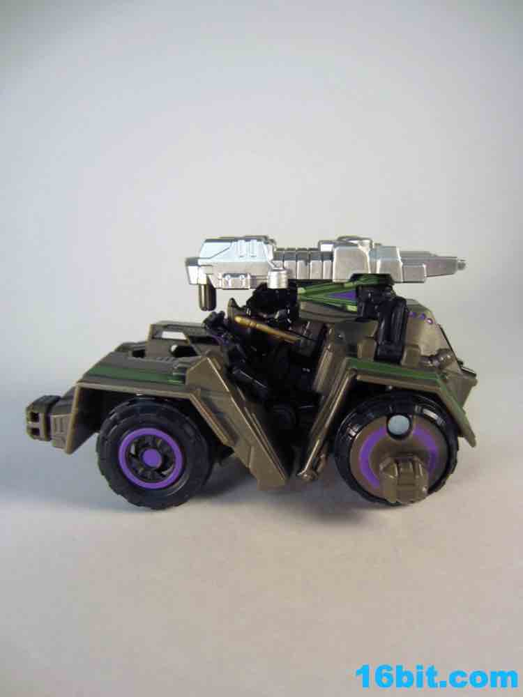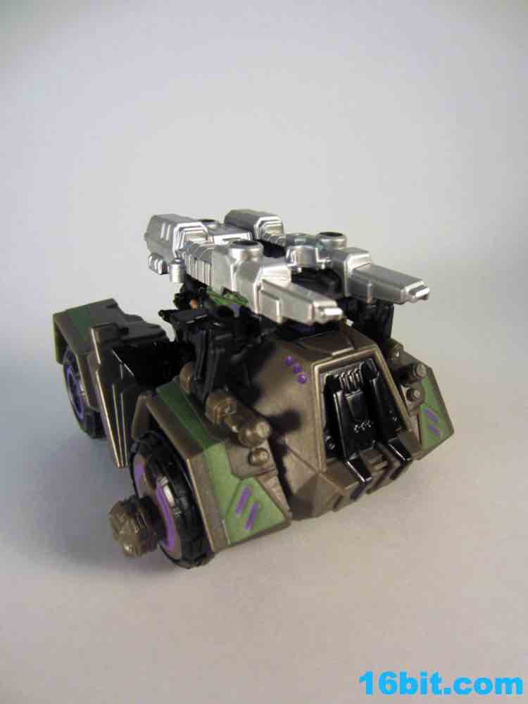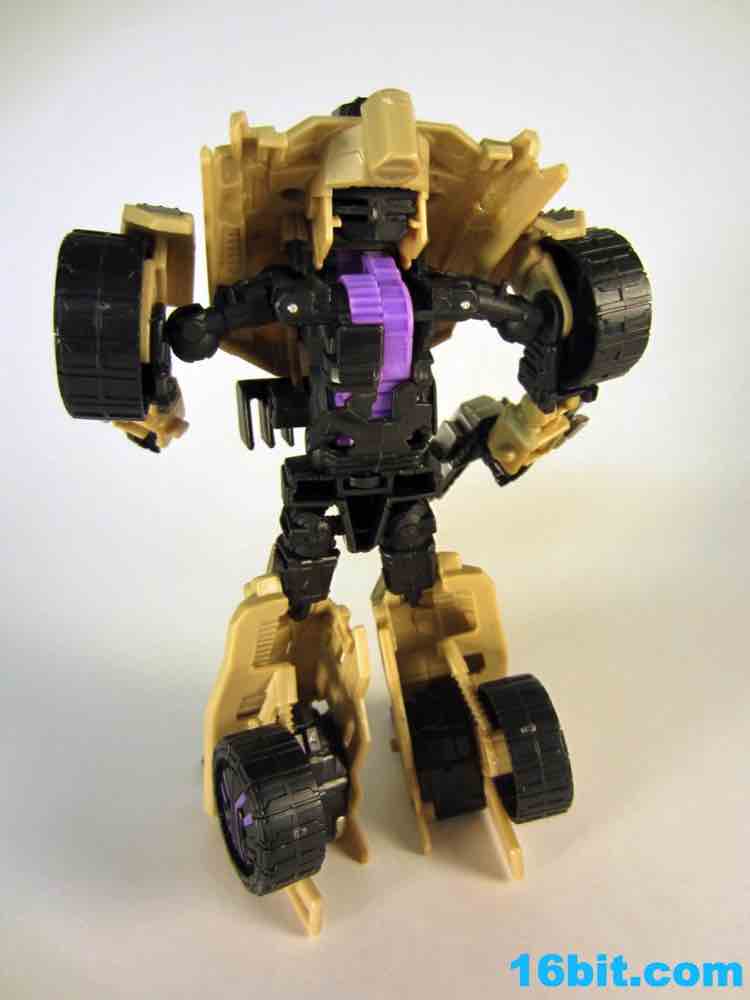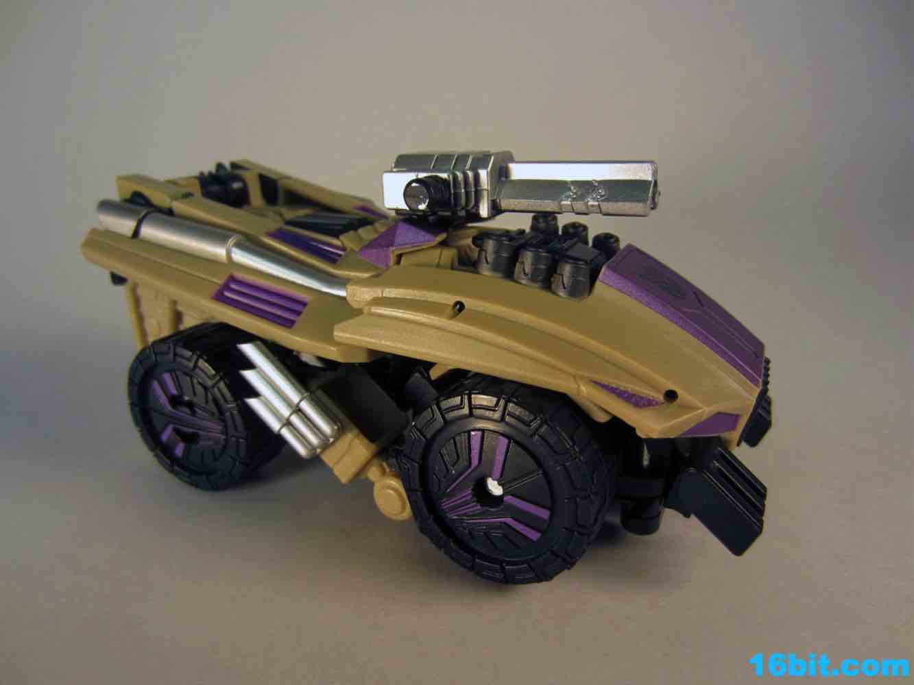 The most compelling design in the set is probably also the largest, with Swindle. Of the entire Combaticon squad, he seems to get the most love in the fiction, and from fans. The tan version looks great here, but there's a yellow version sold individually which looks good and a bright red G2-inspired version which is also great. The "leg mode" feels like you flipped a couple of panels and stood the vehicle mode up on its backside. It's pretty easy to pull off, and there are some nifty Hot Rod-esque pipes on Swindle's robot mode forearms. A black Decepticon logo rests on a purple stripe on the vehicle's hood, and the wheels have some nice purple markings on the hubcaps. He has a sizable black blaster painted silver, and I like it. Easily, it's the best weapon in the set.