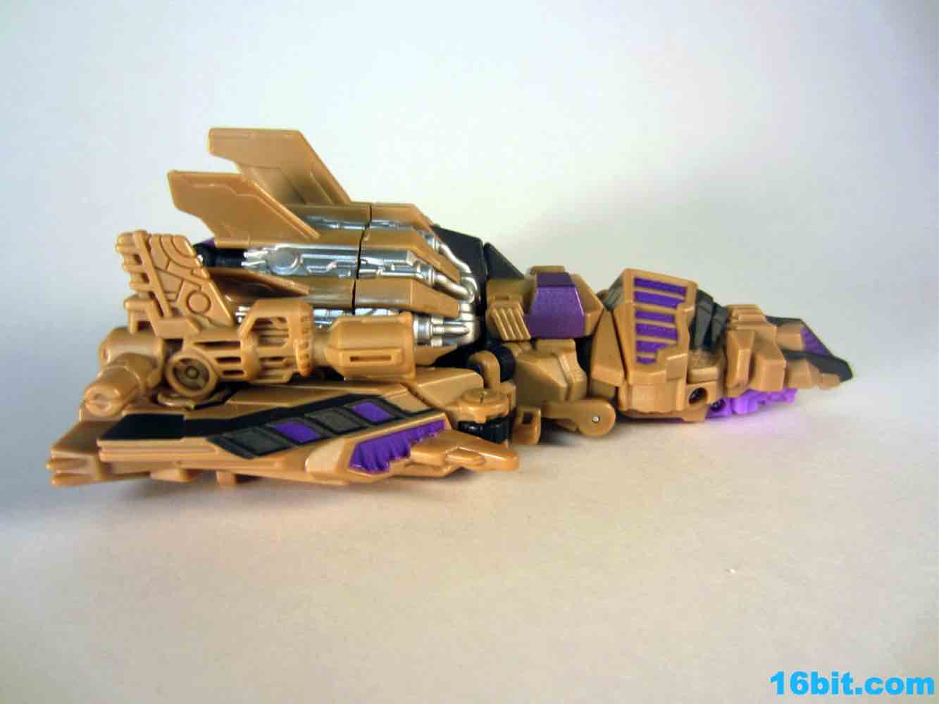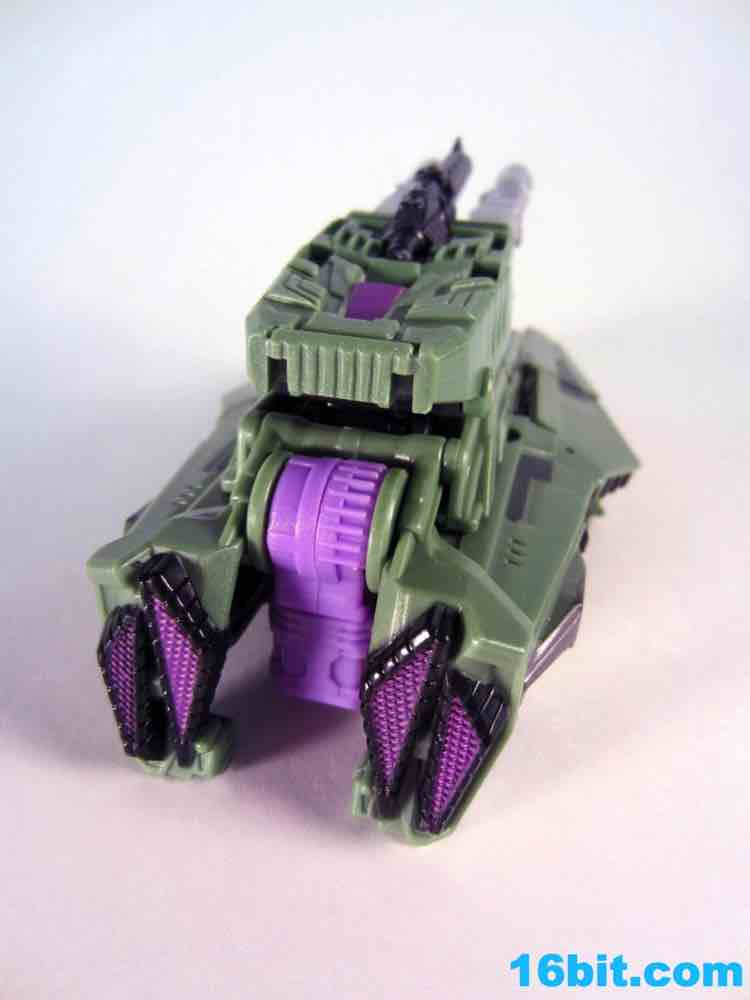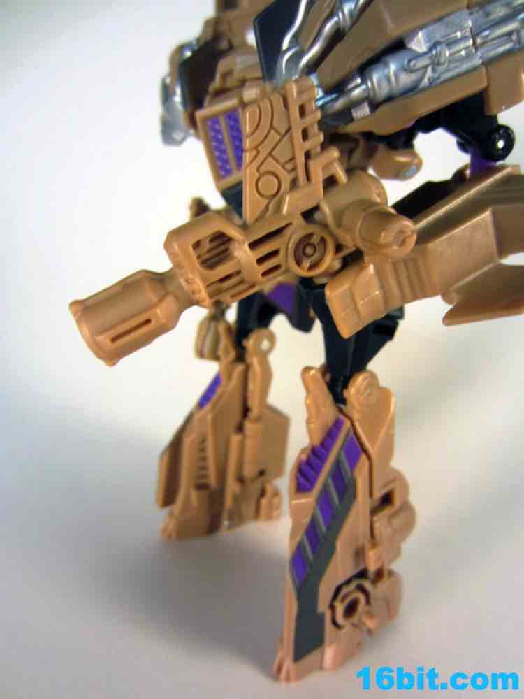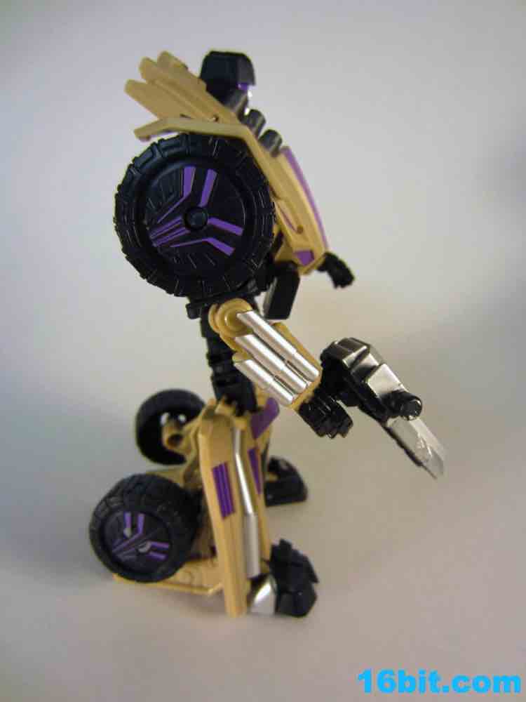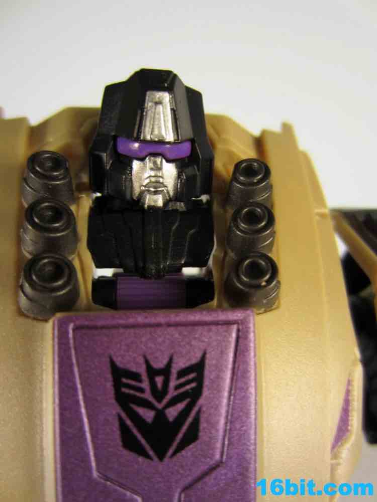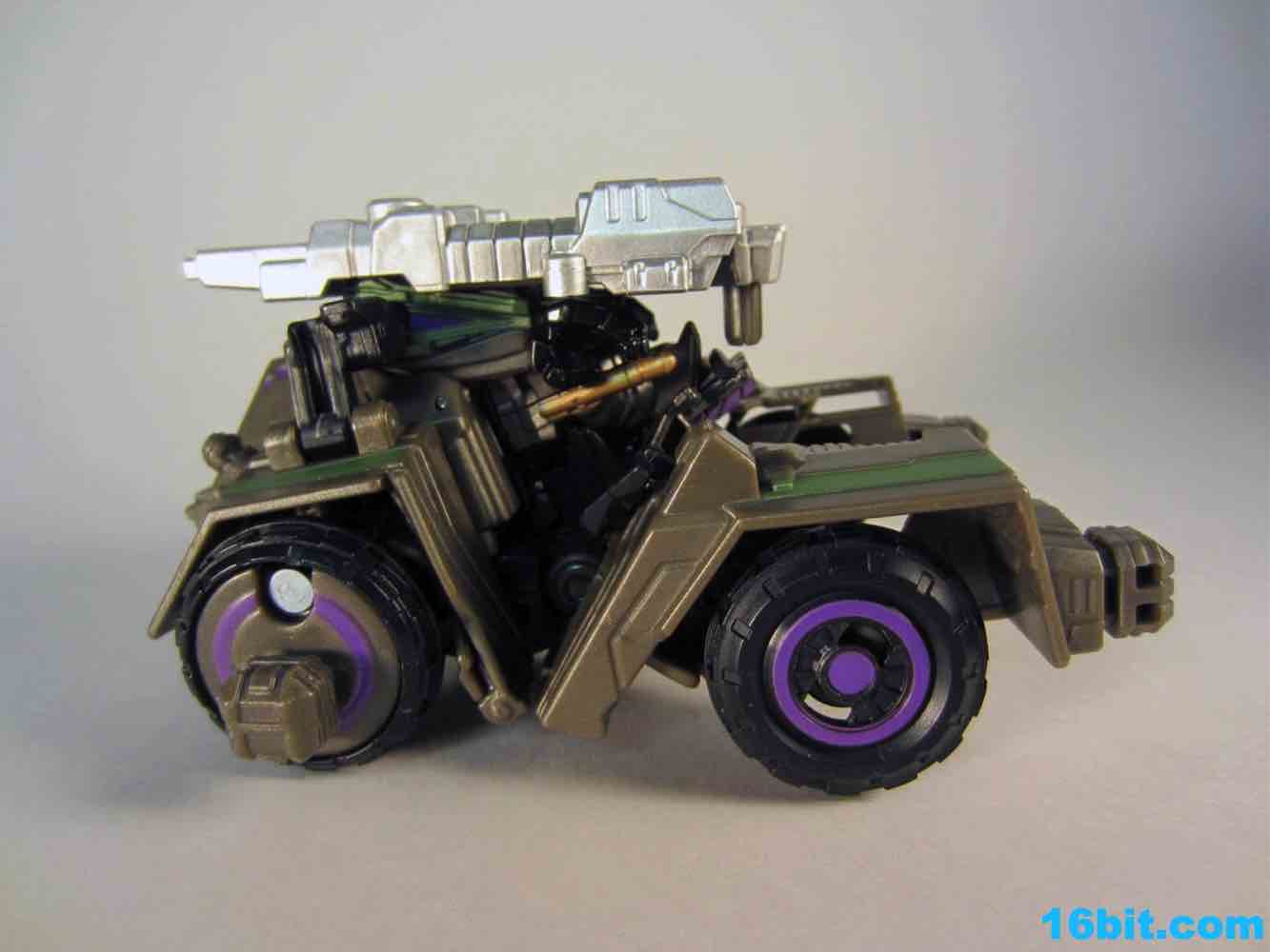 The most compelling design in the set is probably also the largest, with Swindle. Of the entire Combaticon squad, he seems to get the most love in the fiction, and from fans. The tan version looks great here, but there's a yellow version sold individually which looks good and a bright red G2-inspired version which is also great. The "leg mode" feels like you flipped a couple of panels and stood the vehicle mode up on its backside. It's pretty easy to pull off, and there are some nifty Hot Rod-esque pipes on Swindle's robot mode forearms. A black Decepticon logo rests on a purple stripe on the vehicle's hood, and the wheels have some nice purple markings on the hubcaps. He has a sizable black blaster painted silver, and I like it. Easily, it's the best weapon in the set.