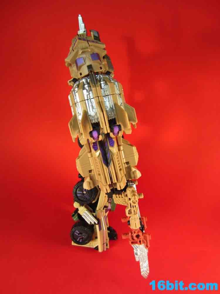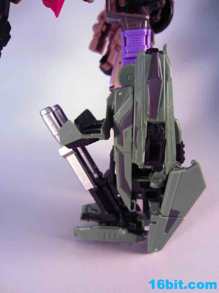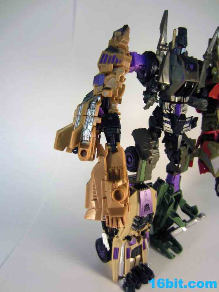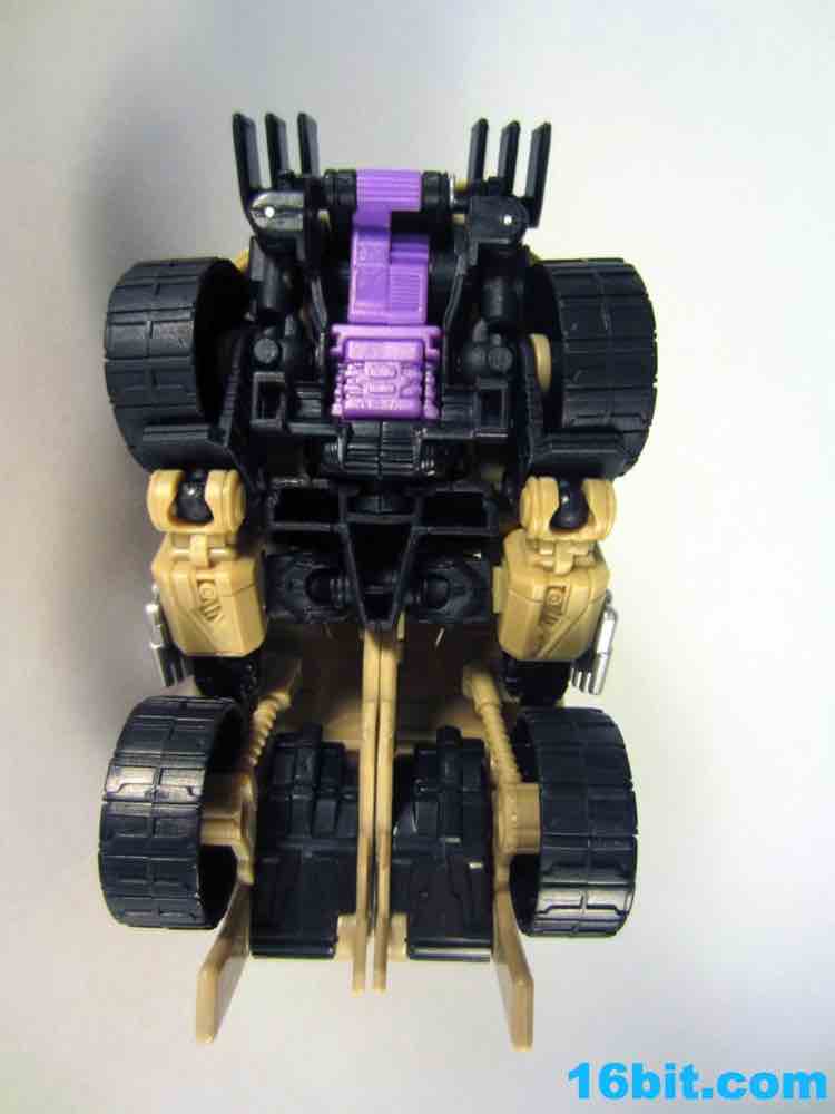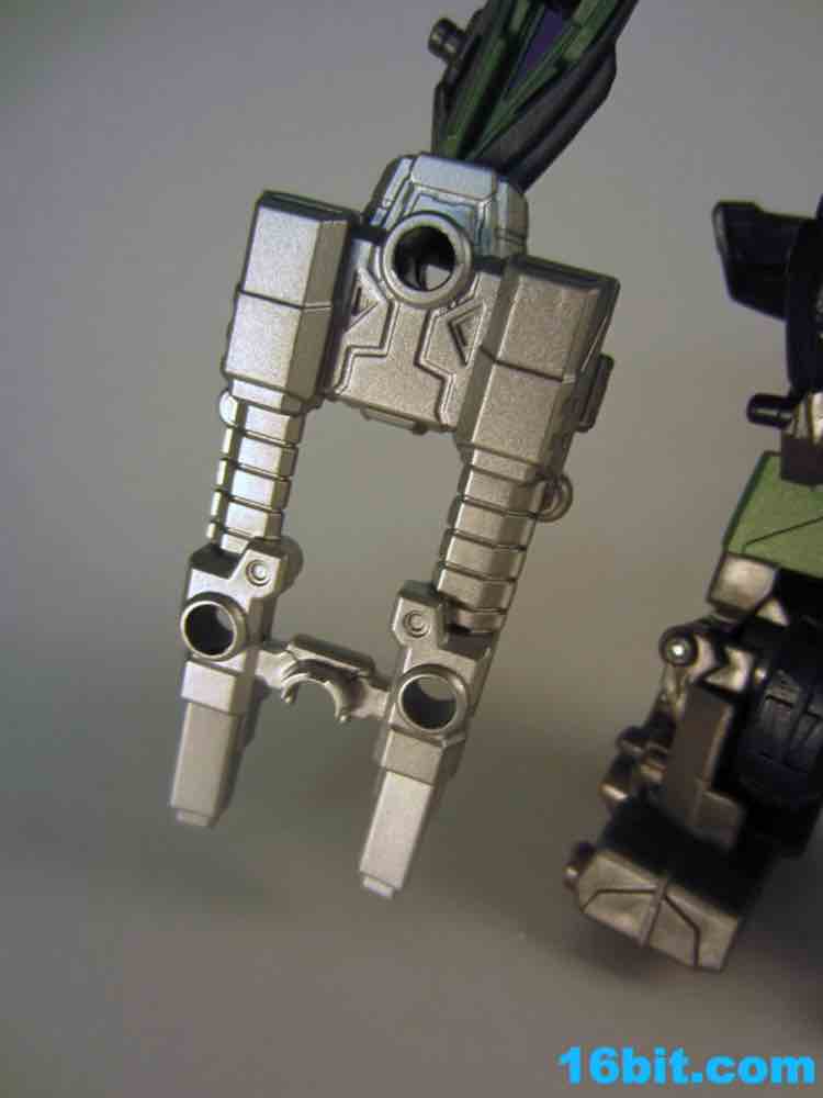 The combined robot is big and nasty, with large limbs and a small head for Bruticus which is part of Onslaught. The giant robot has jointed shoulders, hips, knees, and elbows plus other moving bits which work to varying degrees of success. The combined hands are designed to have moving thumbs, so each limb can be a right or a left hand. Nice! I'm impressed how they managed to get more movement in some limbs, like Vortex in arm mode. It makes use of the figure's robot mode articulation to add to the giant robot mode, the waist joint becomes a swivel in the elbow, plus the legs allow the arm to bend a little. The Blast Off arm is sort of wonky, huge, but at least it's interesting to look at. Swindle as a leg just looks like a vehicle on its back, while Vortex unfolds into a very different-looking mode with guns and panels branching out to make a better limb mode.