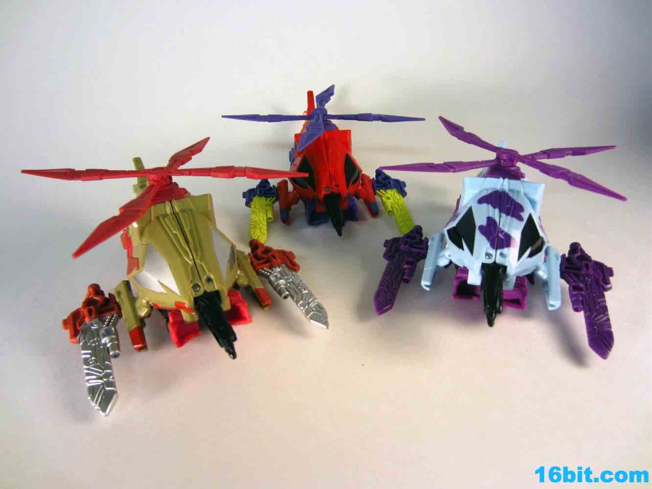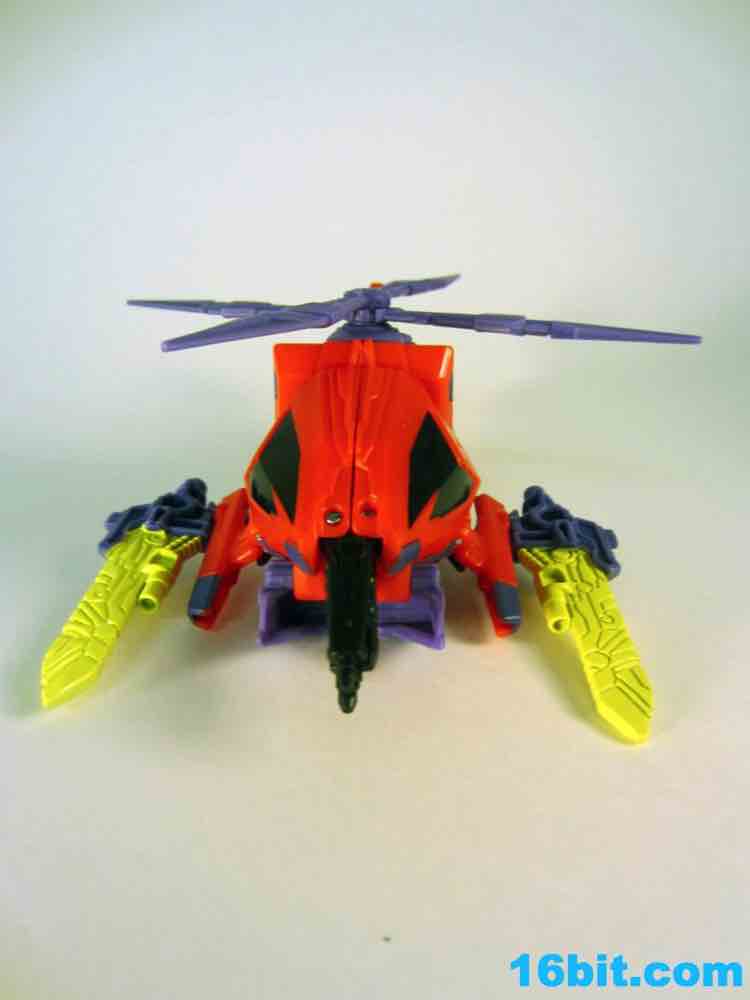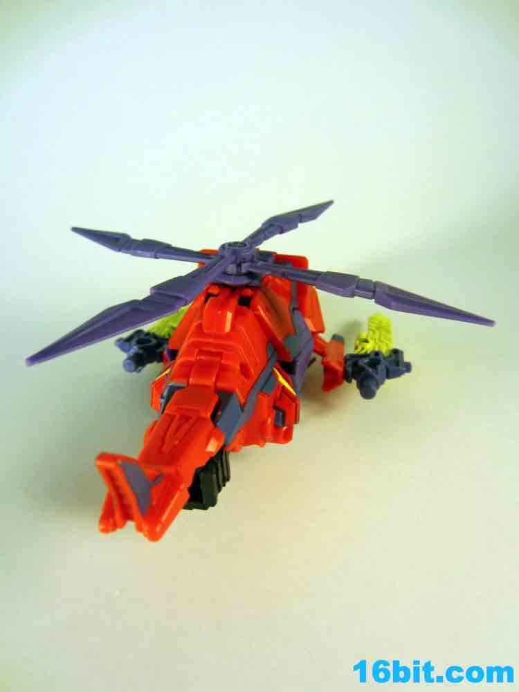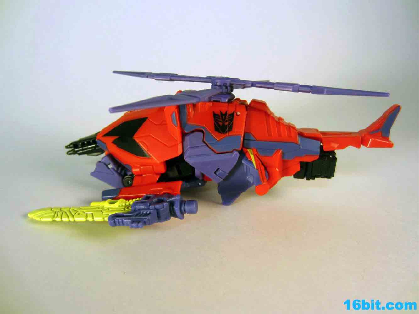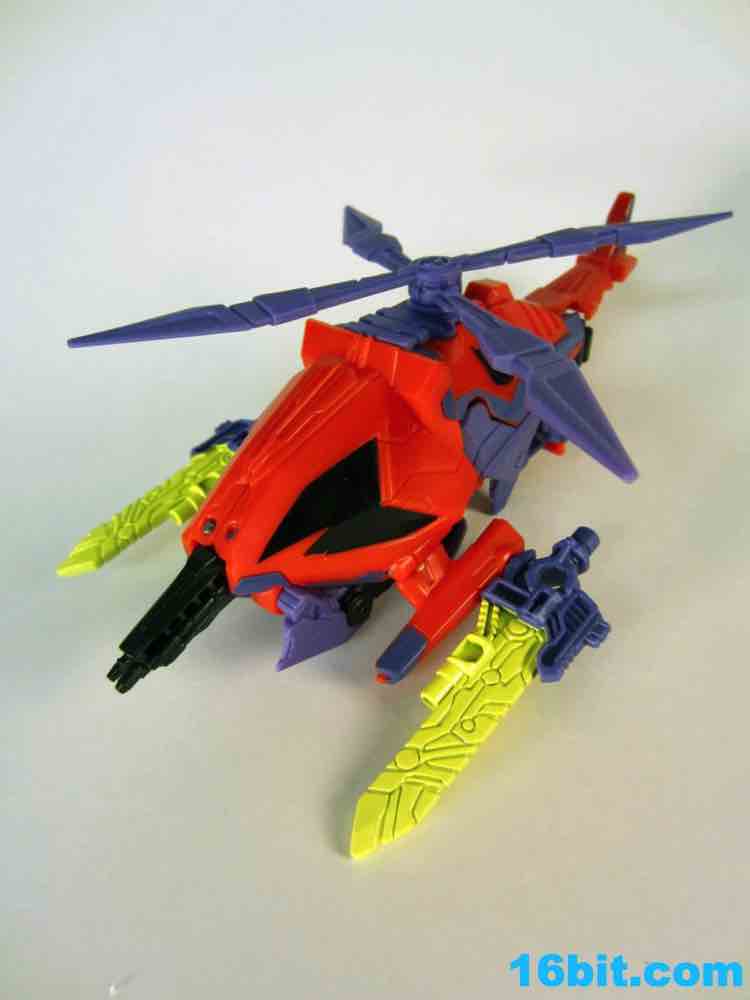 As a futuristic alien helicopter, it's a nice vehicle mode. The blades split apart and are really this toy's main play element. You can plug weapons (like swords) into the landing skids, and then wave it around. It doesn't do much. Pick it up, fly it around, enjoy.