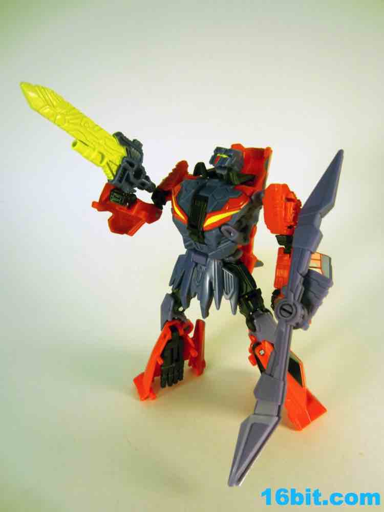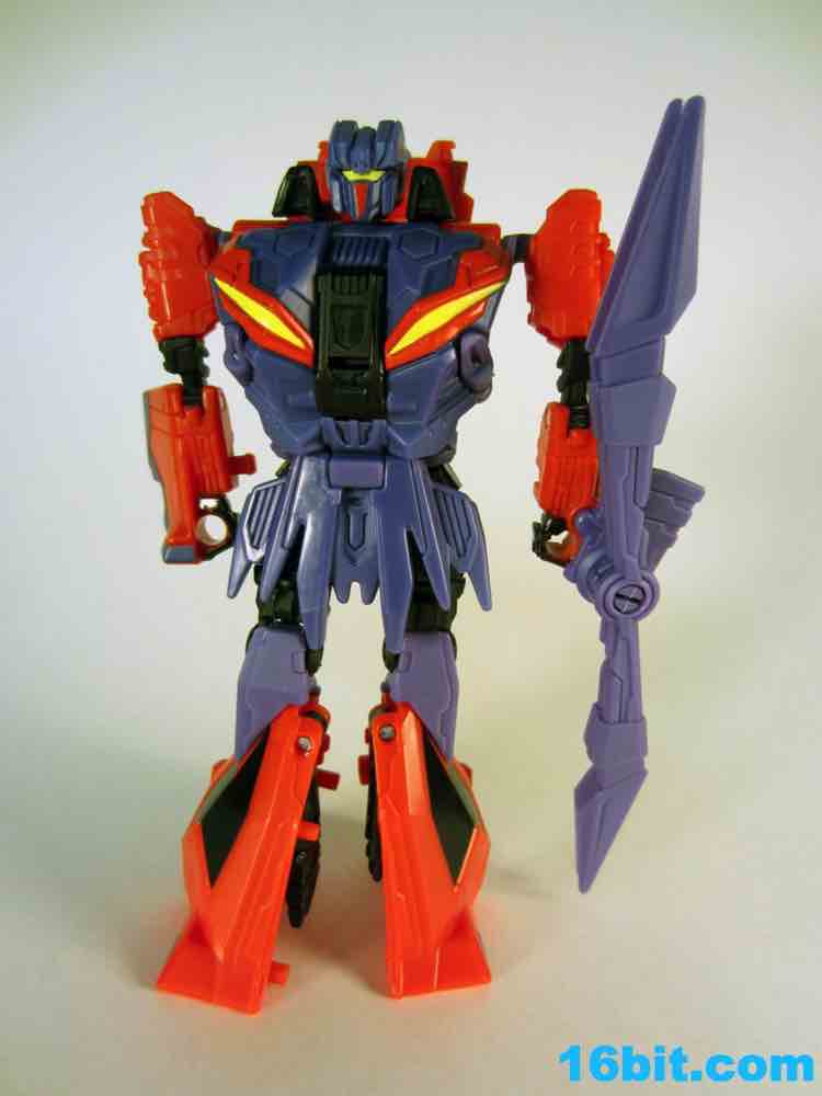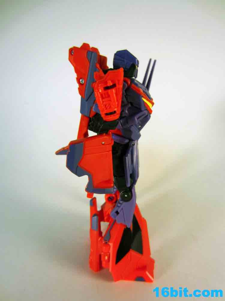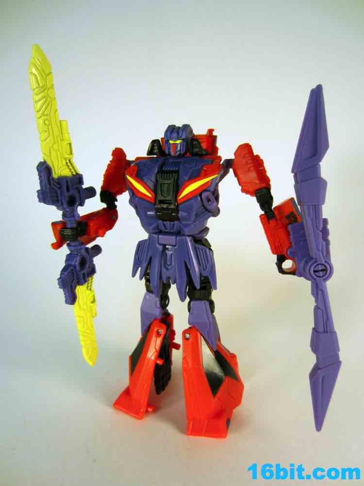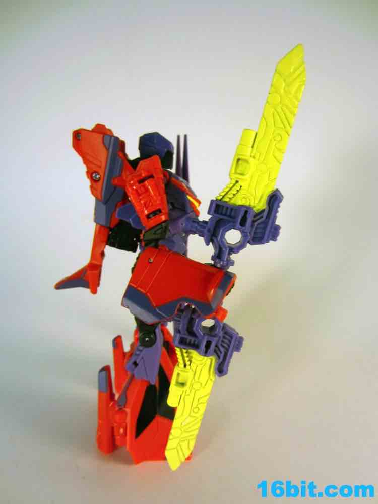 The robot mode is really fun, with a flip-down head that reminds me of some of the Energon-era deluxe Autobots. (Those were some good Autobots! Inferno! Roadblock! Hot Shot! Rodimus! Fun times.) The arms have multiple points of articulation, although I think that's the one area that could have been slightly improved. They're a little weird around the elbows, but they're ultimately workable, movable limbs and they can hold the weapons just fine. They don't look like arms in either of the other modes, as the shell manages to hide them quite nicely. The legs are good, the detail is nice, and there's even a "skirt" of sorts for, uh, no real apparent reason. It's not a significant bit of the vehicle or combined mode, so it's just an extra little flourish on the part of the designers really. When playing with the toy, you'll probably quickly realize it doesn't need two swords, one in robot mode is plenty as the left arm has a spinning blade on it. On my sample it doesn't spin freely, but the G2 and SDCC incarnations of this toy do spin just fine.