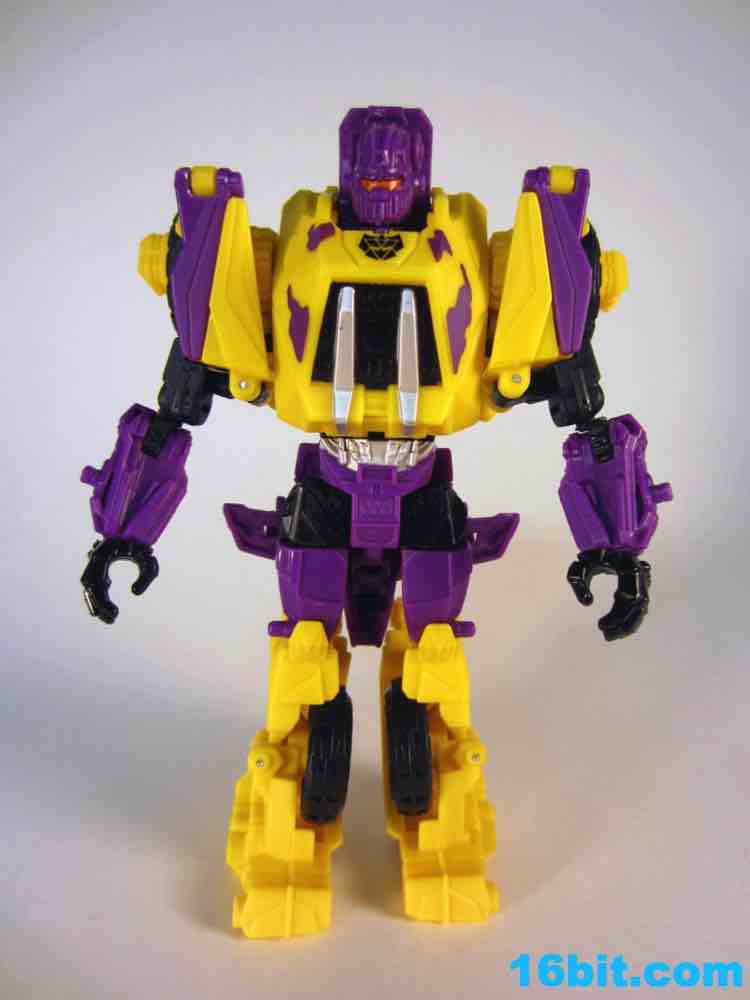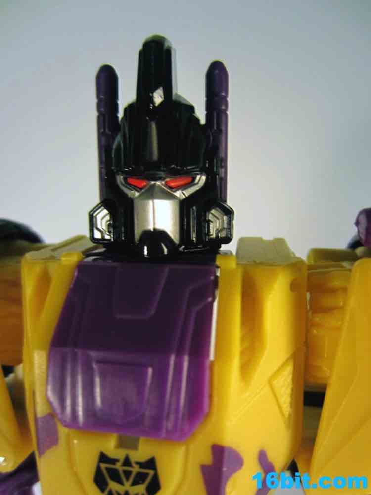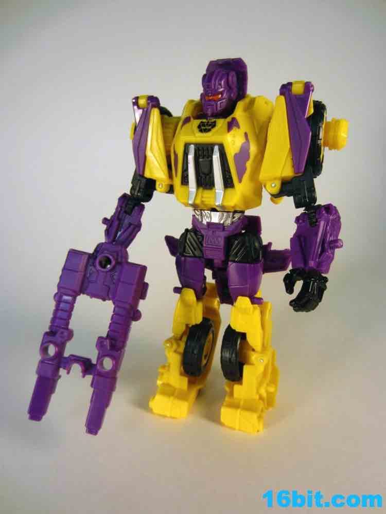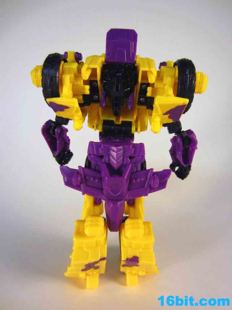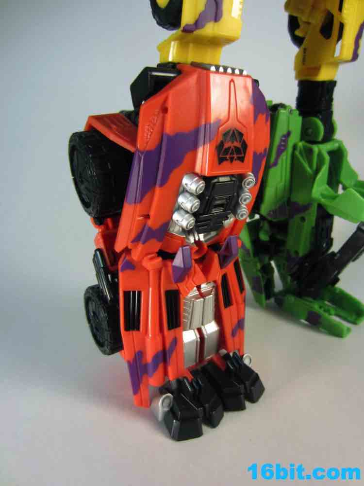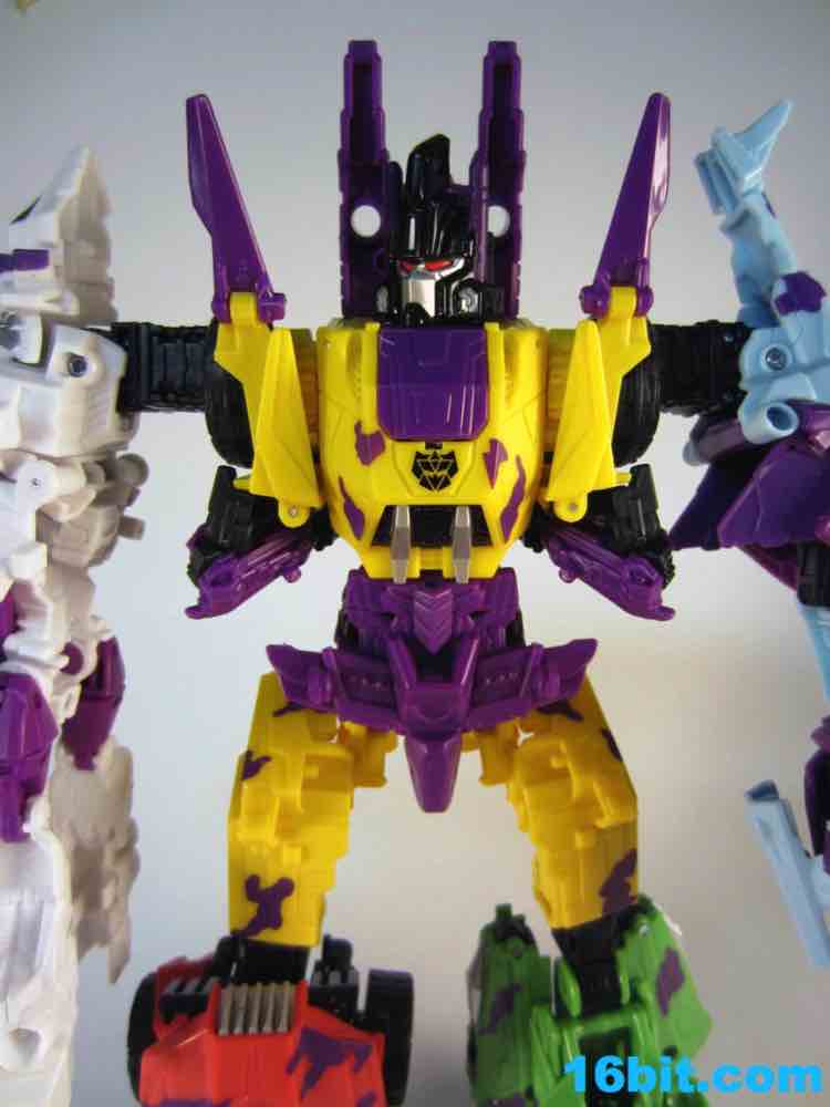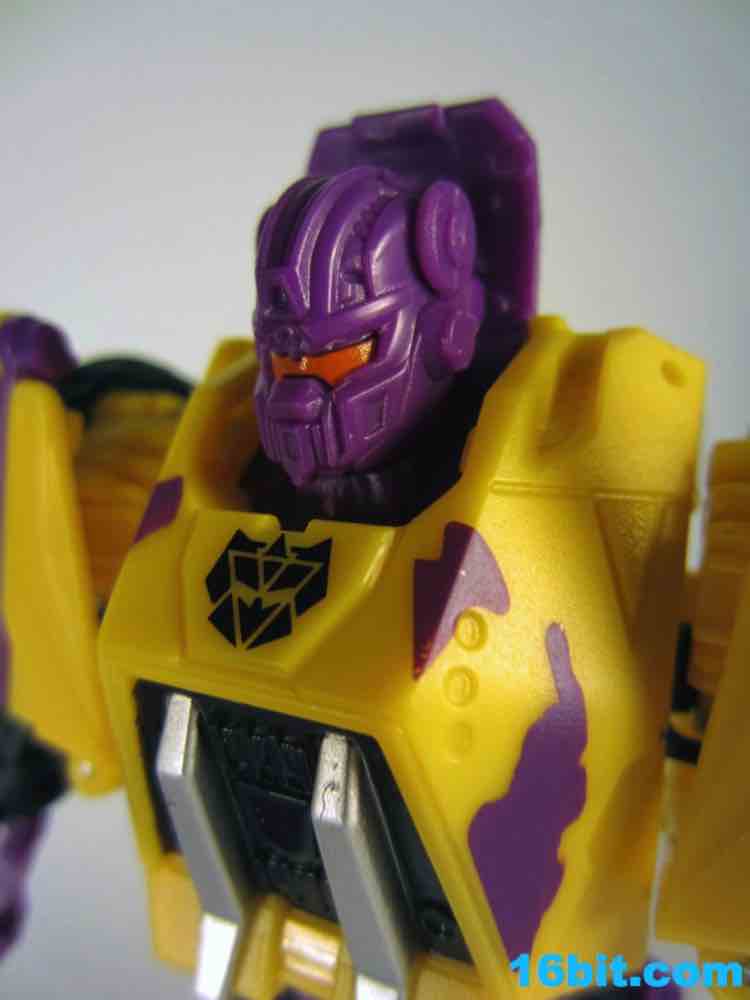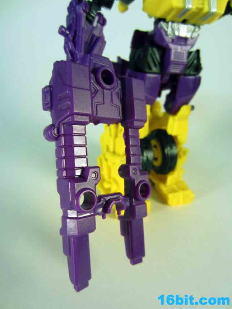 First up: Onslaught! Now yellow. The overall feel of the figure is similar to the original, but the 1994 G2 Onslaught had a black head, this one is purple. In many respects, I like this new one a smidgen more. It looks like some lost mascot from a 1990s sports team. There's a G2 Decepticon symbol in front of his head, and I found the transformation a little stiff-- locking the head in place proved a little difficult. There's a lot more purple on this new figure than the original, but they did a good job making the Bruticus head look a lot like the original with silver, red, purple, and black. The truck, as previously described, ain't nothin' special. Onslaught's robot mode has 14 points of articulation, although the arm joints are pretty wonky.