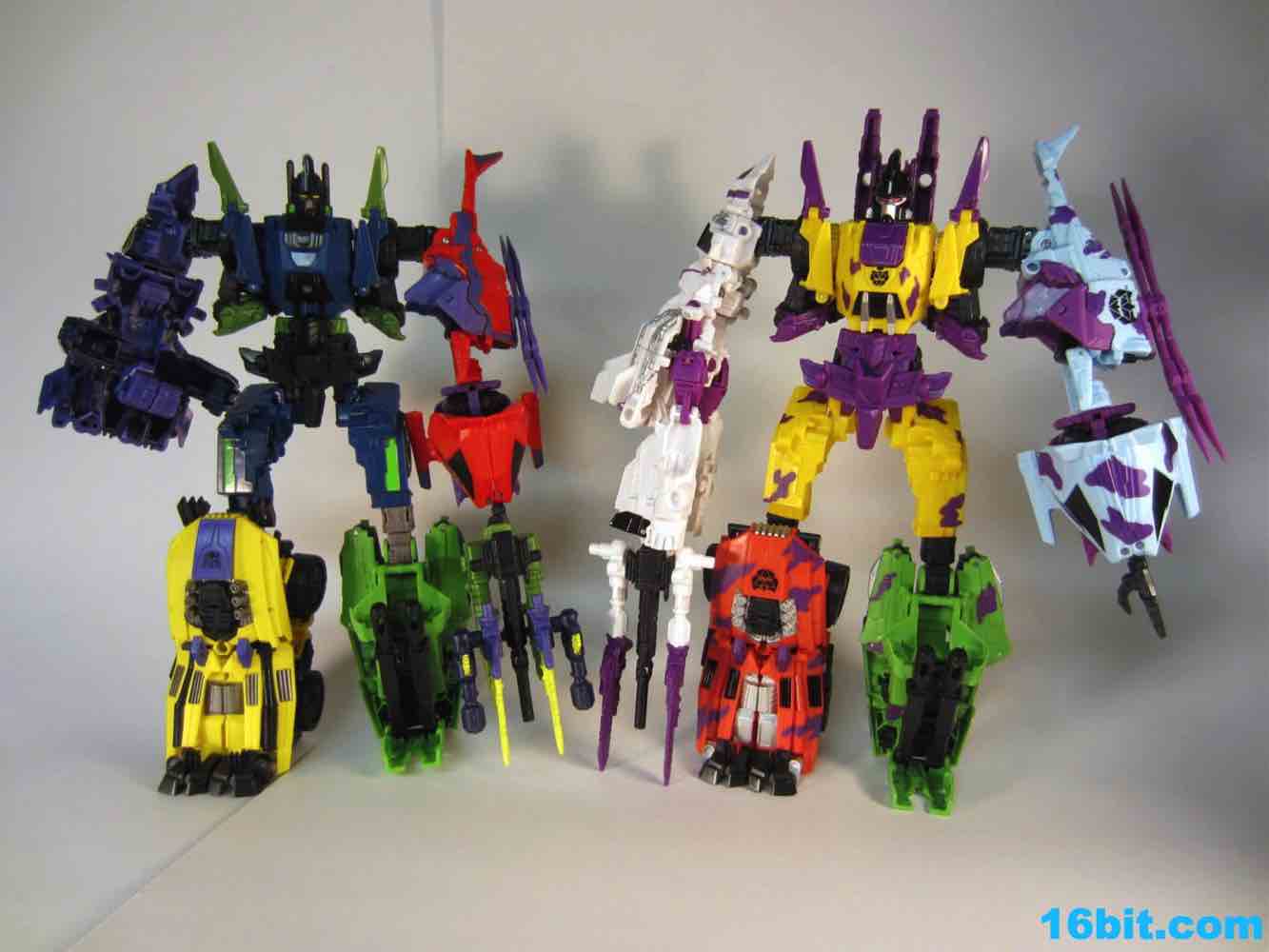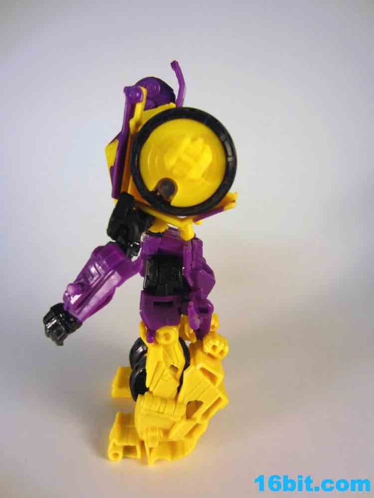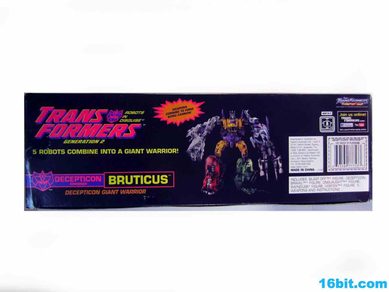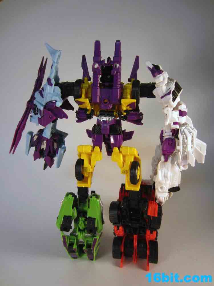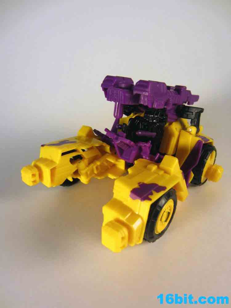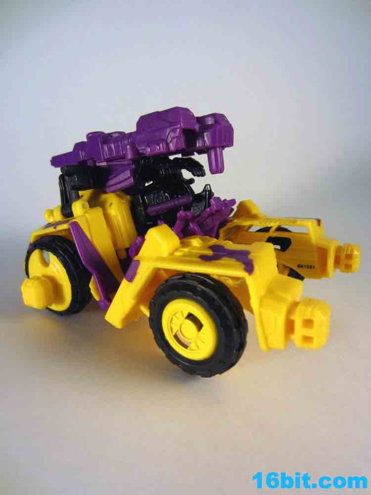 First up: Onslaught! Now yellow. The overall feel of the figure is similar to the original, but the 1994 G2 Onslaught had a black head, this one is purple. In many respects, I like this new one a smidgen more. It looks like some lost mascot from a 1990s sports team. There's a G2 Decepticon symbol in front of his head, and I found the transformation a little stiff-- locking the head in place proved a little difficult. There's a lot more purple on this new figure than the original, but they did a good job making the Bruticus head look a lot like the original with silver, red, purple, and black. The truck, as previously described, ain't nothin' special. Onslaught's robot mode has 14 points of articulation, although the arm joints are pretty wonky.