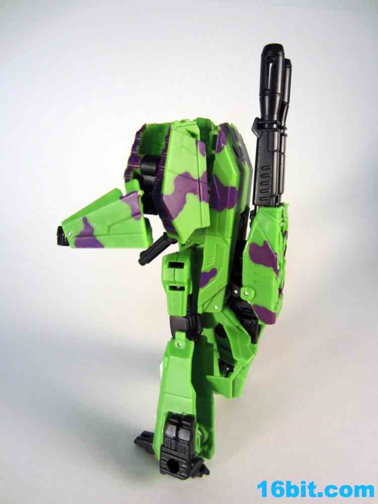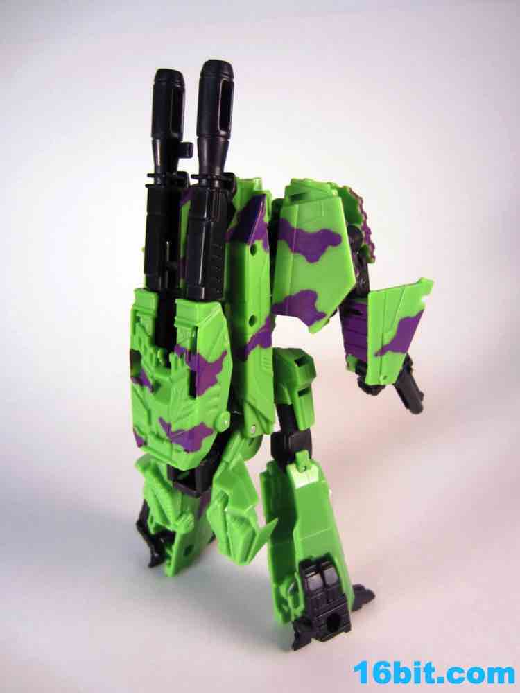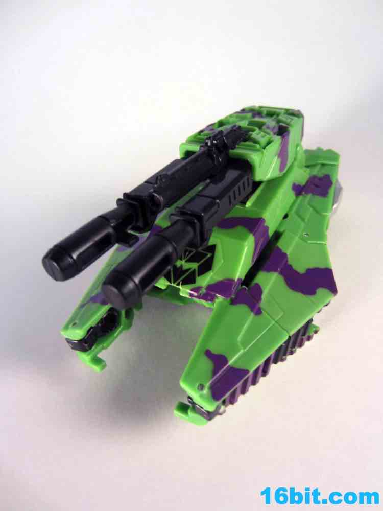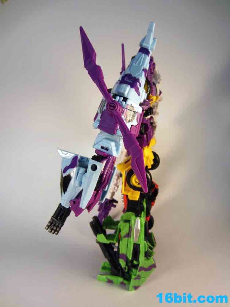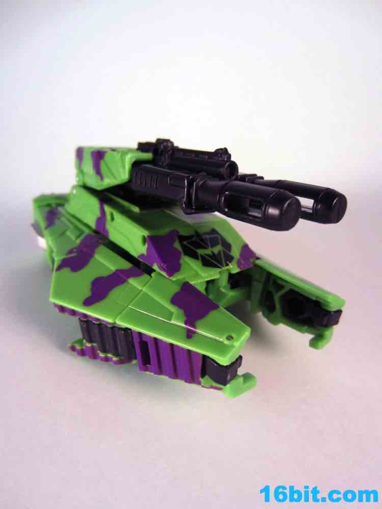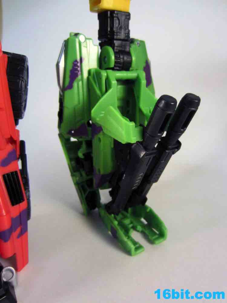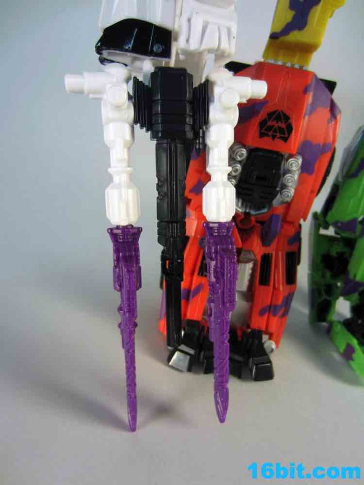 At 11-inches tall, the figure is basically exactly what you might expect. It's huge. It's ugly. It has purple camo on neon military vehicles. In short, it's a wonderful tribute to the 1990s and was priced to move! It's a full $40 cheaper than the game-accurate SDCC version and $15 cheaper than the... I'm-not-sure-what-inspired mass market Generations release. This one is unabashedly G2, although the original 1994 Generation 2 release had a bluer Vortex and more purple kibble covering up Onslaught's yellow plastic in the combined mode. It's still really cool this time around, plus the G2 symbols don't hurt. Oh, and the black plastic chest kibble with purple camo is sadly gone too, it looks good on either version but it is clearly different.