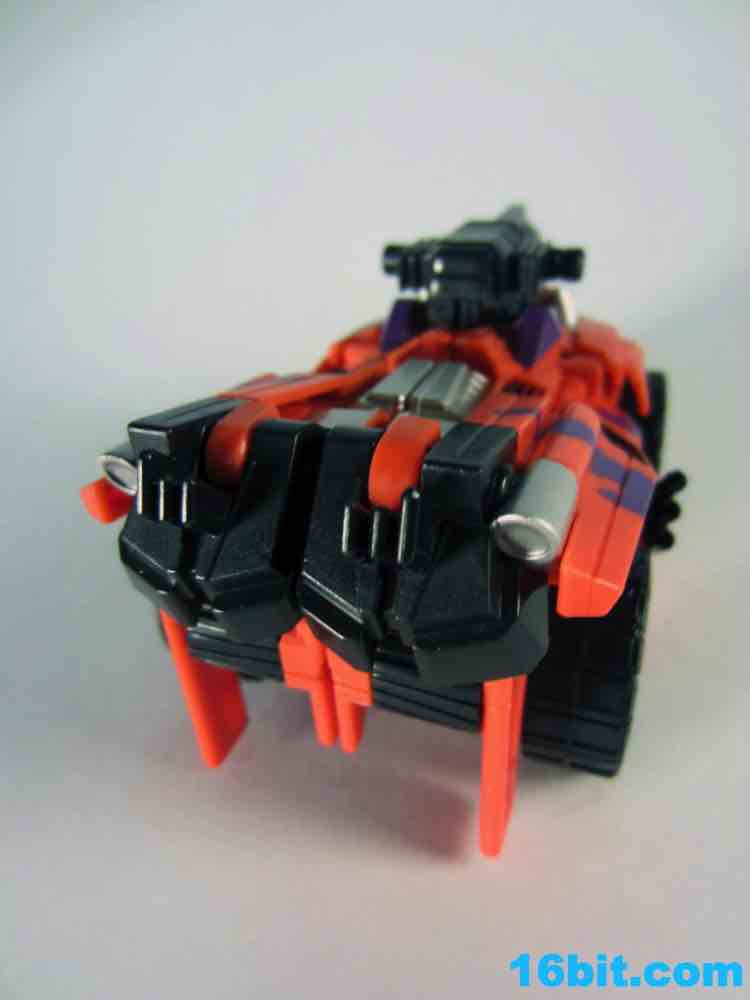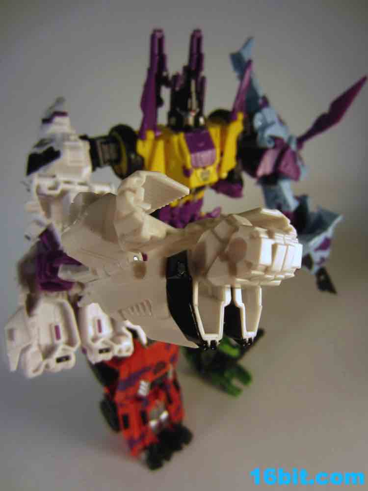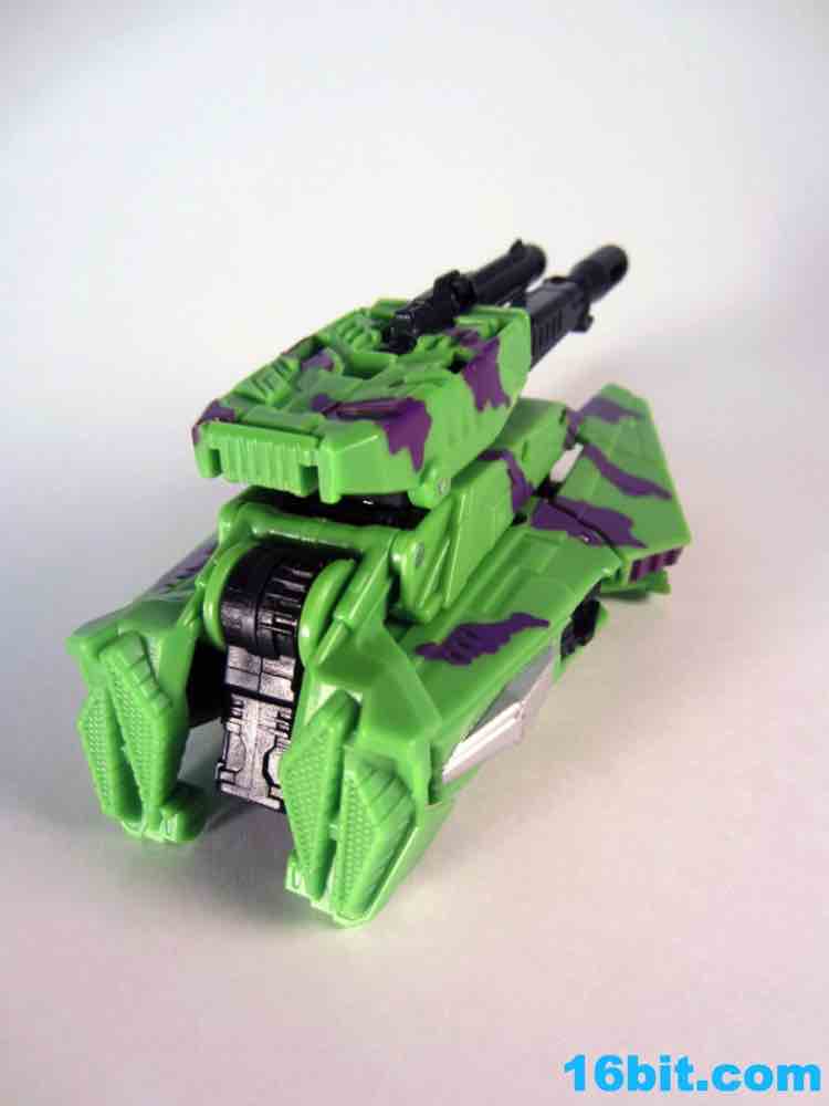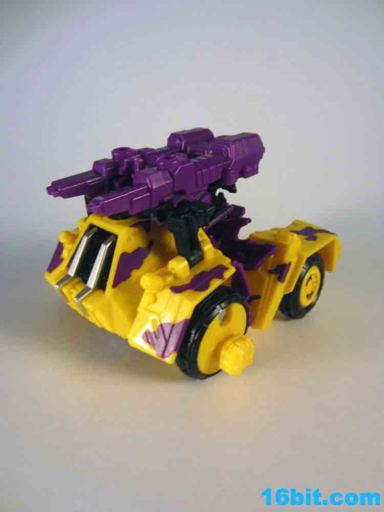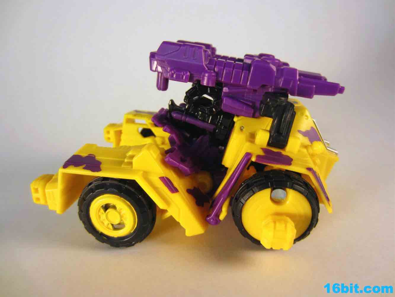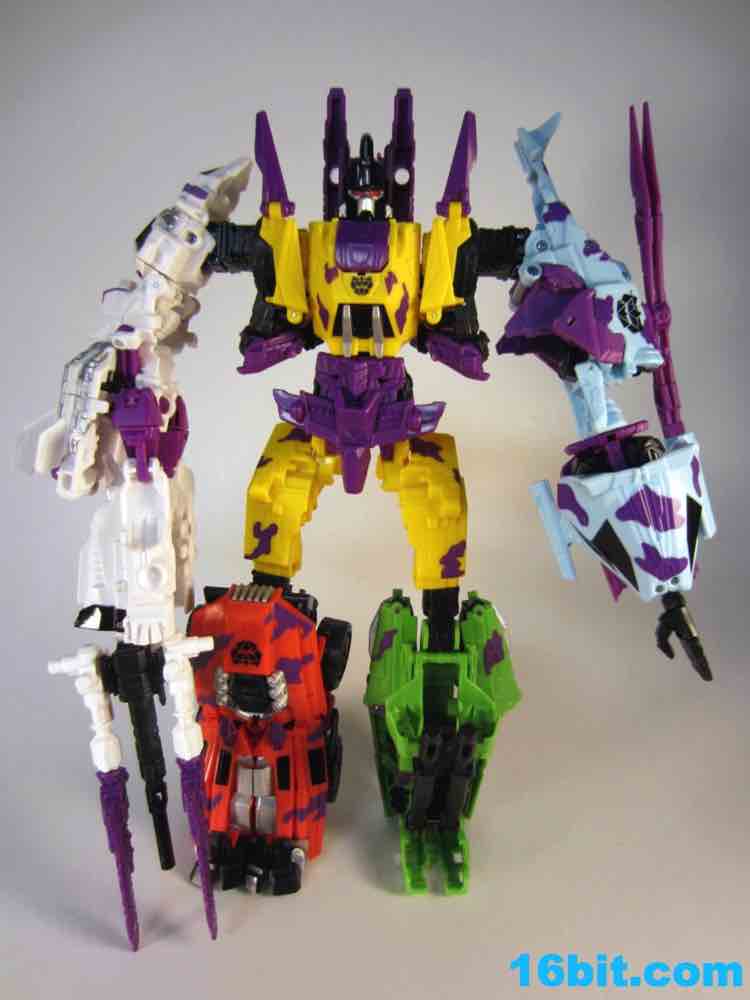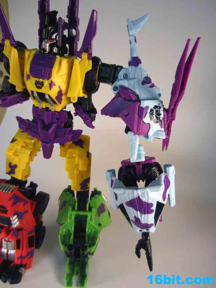 At 11-inches tall, the figure is basically exactly what you might expect. It's huge. It's ugly. It has purple camo on neon military vehicles. In short, it's a wonderful tribute to the 1990s and was priced to move! It's a full $40 cheaper than the game-accurate SDCC version and $15 cheaper than the... I'm-not-sure-what-inspired mass market Generations release. This one is unabashedly G2, although the original 1994 Generation 2 release had a bluer Vortex and more purple kibble covering up Onslaught's yellow plastic in the combined mode. It's still really cool this time around, plus the G2 symbols don't hurt. Oh, and the black plastic chest kibble with purple camo is sadly gone too, it looks good on either version but it is clearly different.