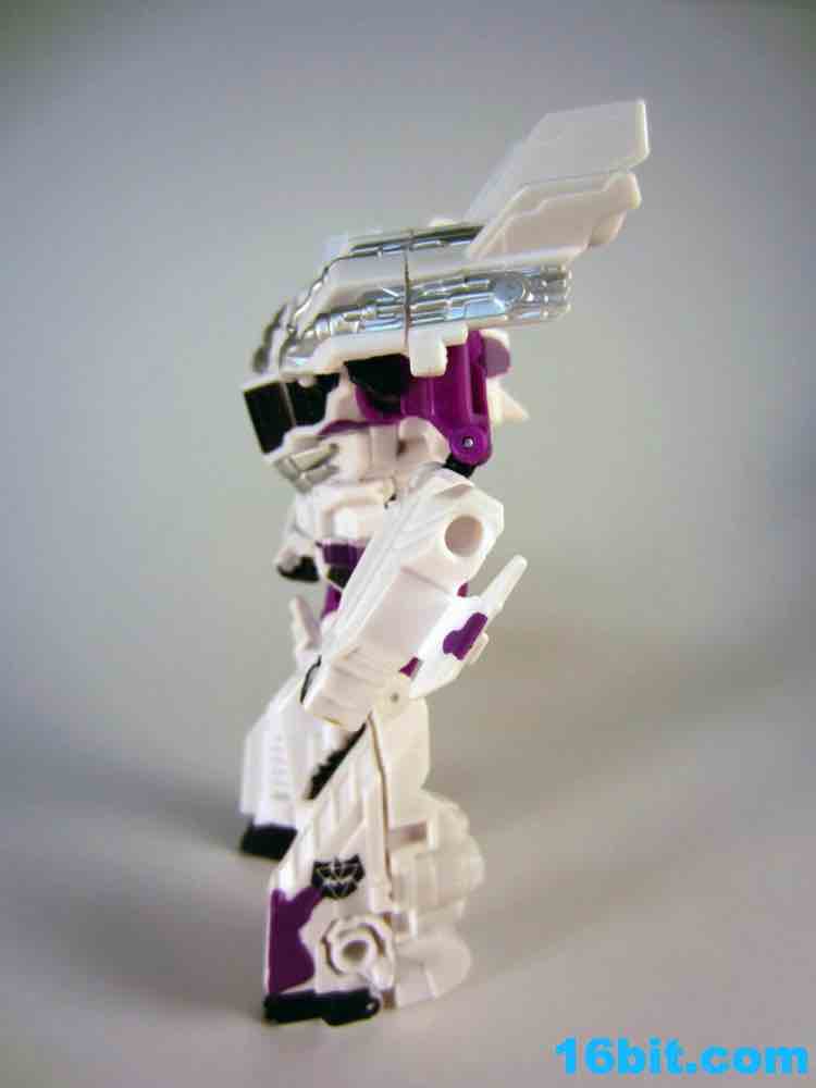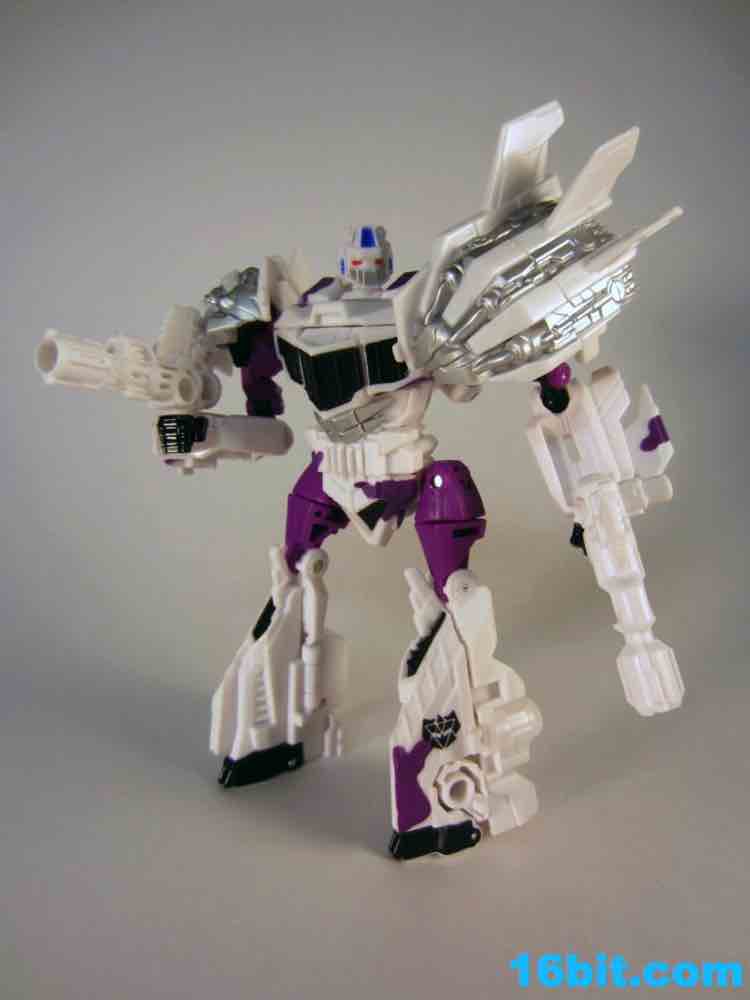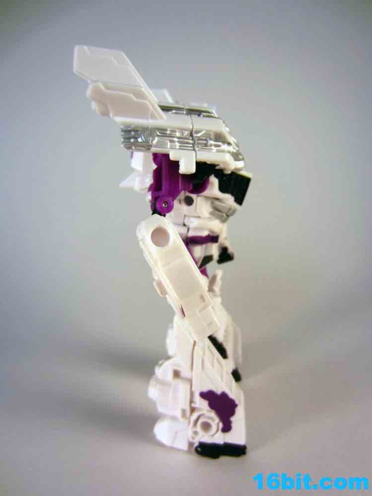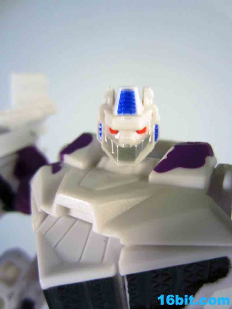 Next is Blast-off in white with purple and black paint. Why purple? I have no idea. It was the 1990s. The G2 symbol appears on the robot's left leg, and on the whole it's a white toy with a little bit of purple and black plastic. The head has silver on his face and orange eyes, with a little blue for detail. The white kind of sucks the personality out of the figure's face, and a little more black would have been nice. The 1994 figure had a purple chest, black legs, and a lot of black on his arms. The twin pistols are cast in white this time around, and unlike the others, are completely unpainted. As a robot, Blast Off has about 15 points of articulation. As a space shuttle, he's a brick. You can put the guns in the wings, and that's about it.