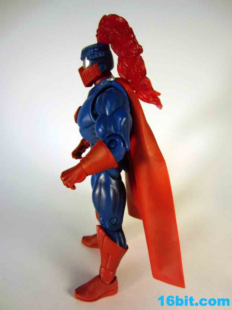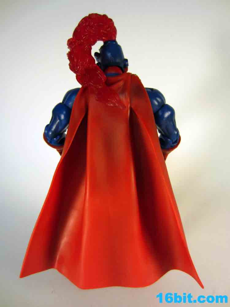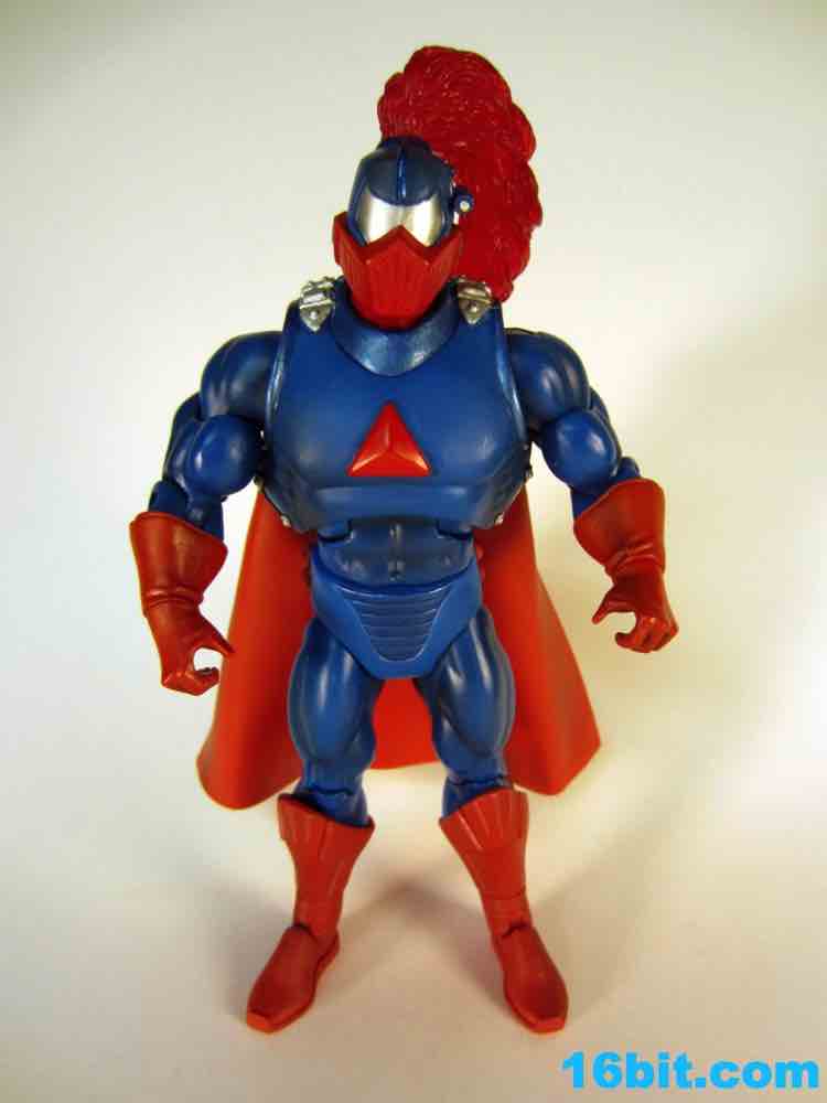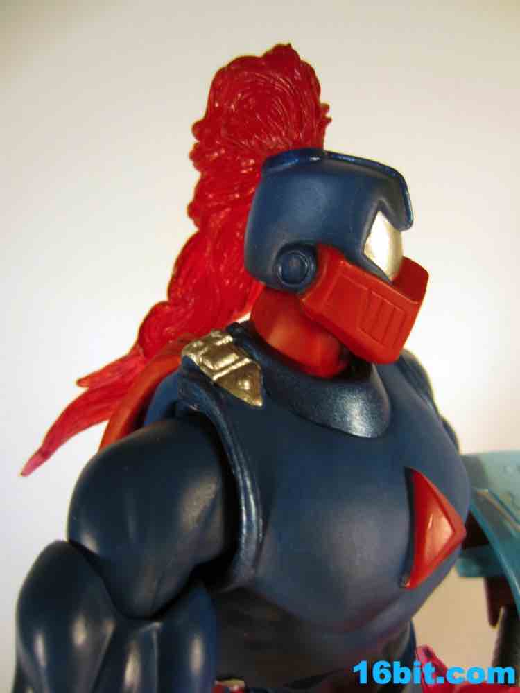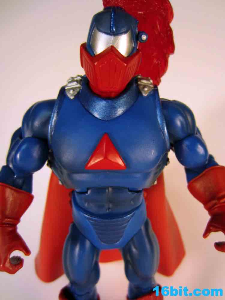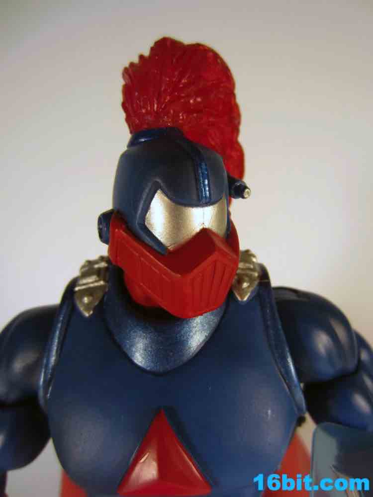 The figure seemed to go through quite a few design changes, as you can see on the figure's cardback photo (left). The photo's boots and underpants are clearly those of He-Man or Man-at-Arms and the arms of, seemingly, Tri-Klops. The final figure wears the boots of Bow, the gloved hands of Hordak, and the underpants of Optikk/Trapjaw, which gives the figure an unquestionably different look. The figure's red energy plume out of the back of his helmet was meant to be jointed, but was glued in place by the factory. I'm told that the glue can be worn down and the plume can move, but I don't want to risk ripping it. The original prototype for the figure also had a clear red gem on his armor, this is opaque on the final release. It looks pretty good as it is, with the prototype looking more "ancient" and the released figure seeming slightly more of the future.