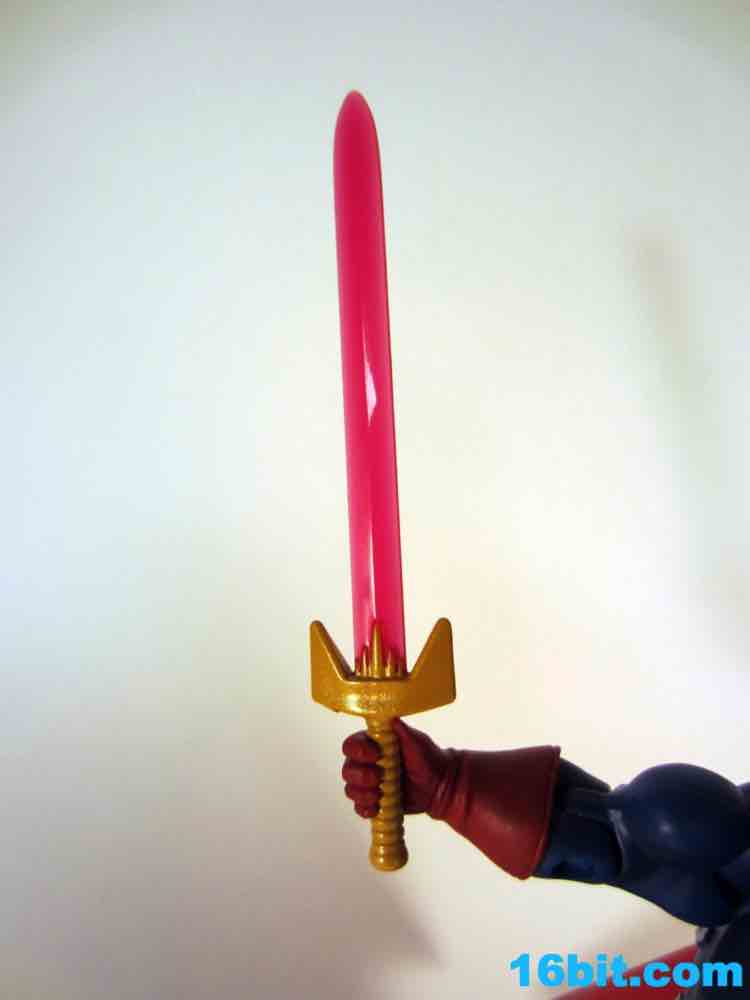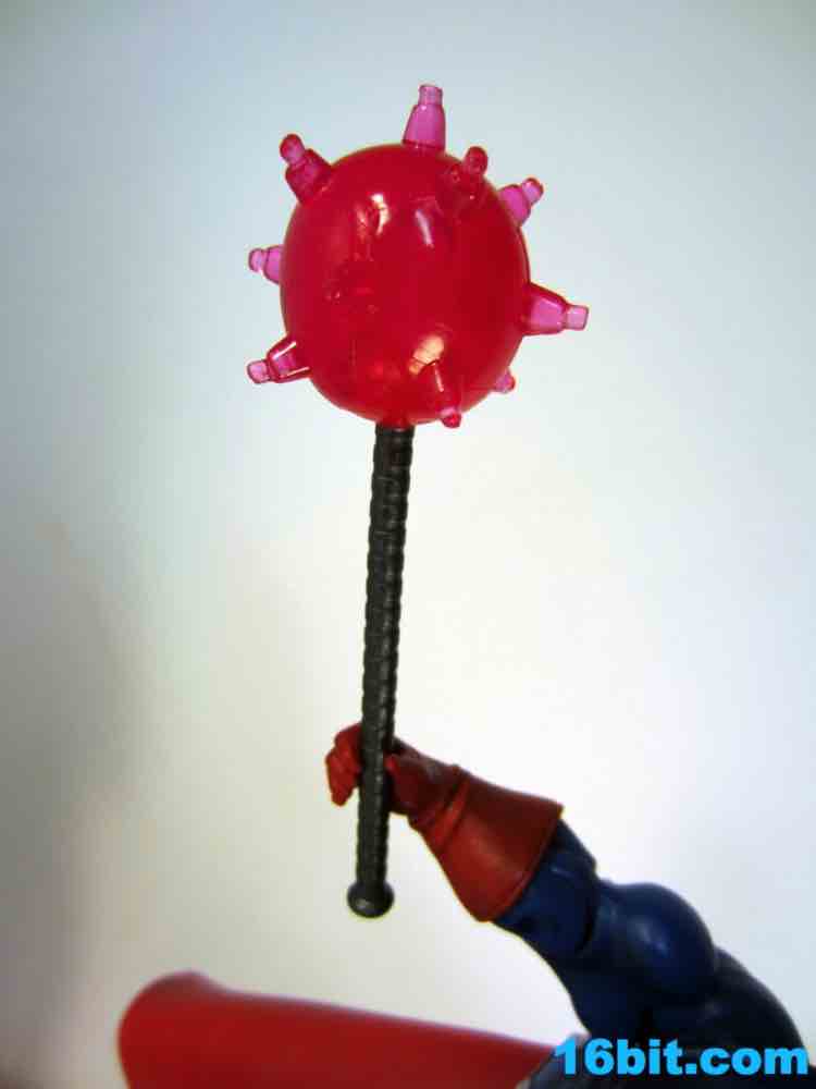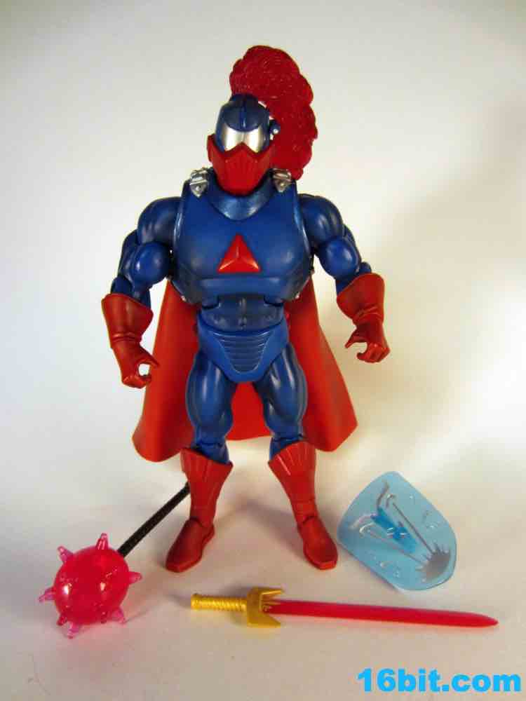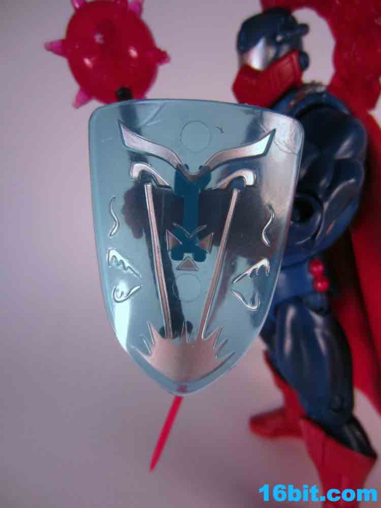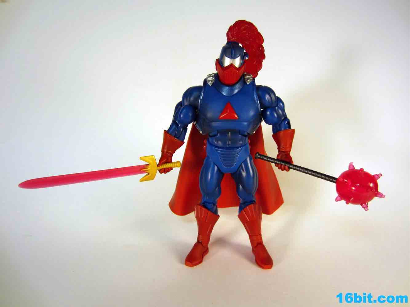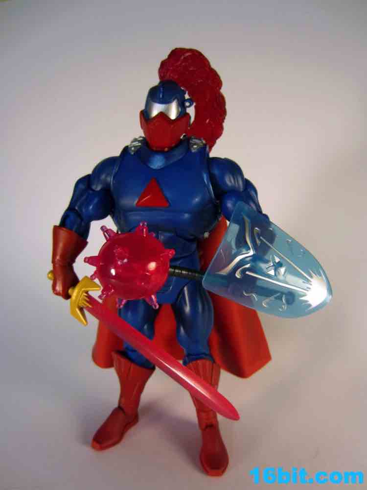 So who is this guy? The story is that the Mighty Spector traveled back in time to pluck him out of the past just before his death to serve King He-Man in the future of Eternia as a new Man-At-Arms after Duncan and presumably Clamp Champ died. The insanely colorful figure looks like it fell out of the late 1980s, making it a good fit for the "Powers of Grayskull" sub-line... of which the figure carries the logo. He has all-new accessories with a clear red sword, a bright red mace, and a clear blue shield with silver designs on the side. I'm not entirely sure what it's supposed to be, but I figure it might have to do with the pedestal for the Orb.