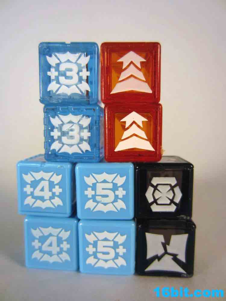 In addition to each figure's individual trading card, six bonus (and different) cards were thrown in based on the first figure 3-packs. They're slightly different, and not knowing Japanese I can't tell you what the words on the yellow stripe are. You get new bonus dice as well, with clear blue 3s and some clear orange arrows which... mean... something? There are smokey clear black dice as well. I don't know what I'm supposed to do with these.