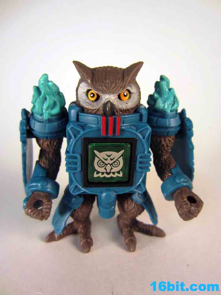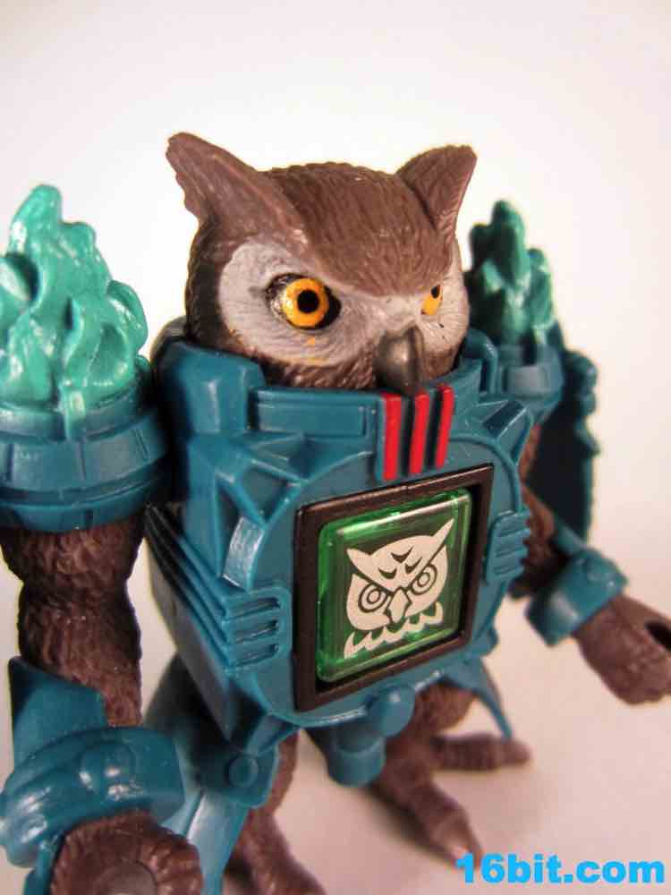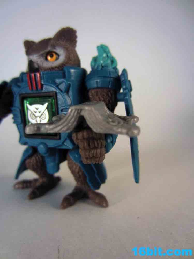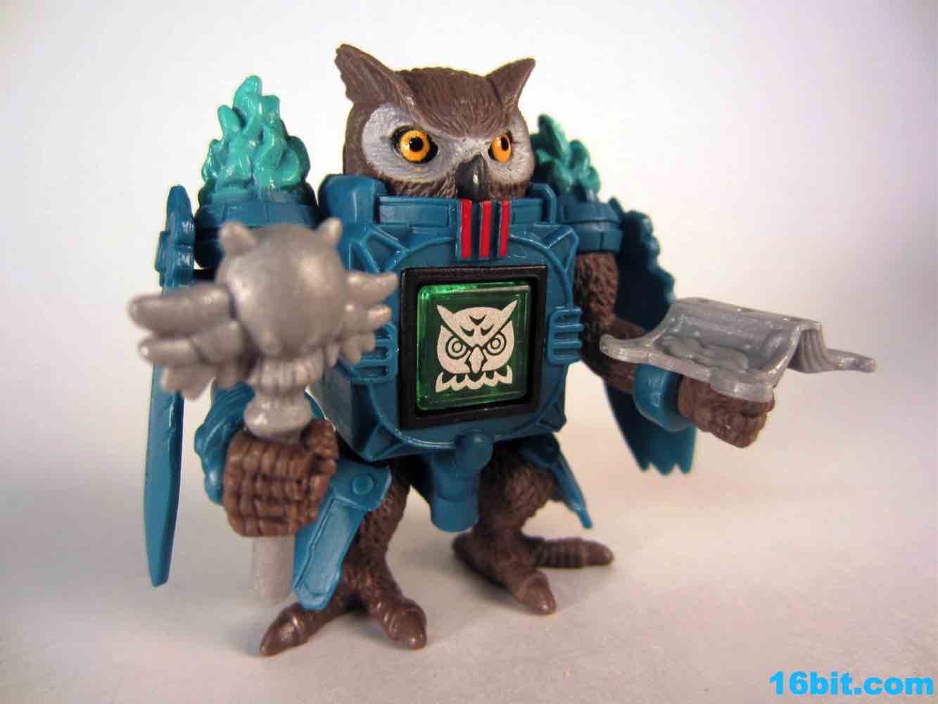 Faux armored wings are sculpted to his shoulders rather than his back, and he has a fairly realistic sculpt of an owl head on his body which just barely peeks over the neck armor. It's quite cute. One of the eyes on my sample is a little wonky, which is a shame because this one has surprisingly prominent peepers. Unlike previous birds in this line, the owl's talons are left unpainted but you'll notice some really great sculpting on his legs. His shoulders move freely, but as with most of these figures, the legs are a little restricted. The original Battle Beasts line had a couple of Owl figures, Knight Owl and Strong Hurricane. He does not appear to be an intentional update of either, aside from being a similar creature to the latter with the coloring of armor of the former.