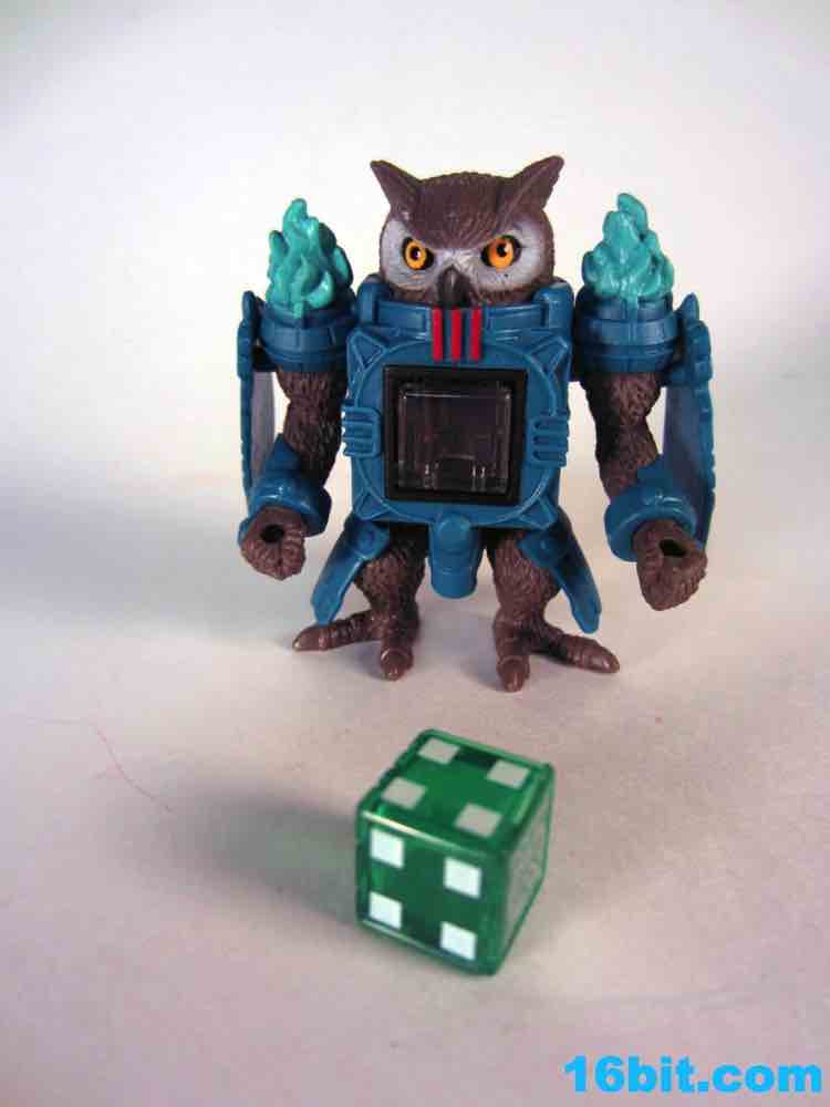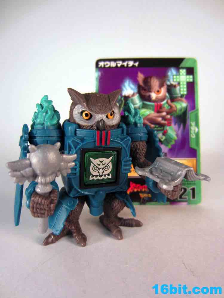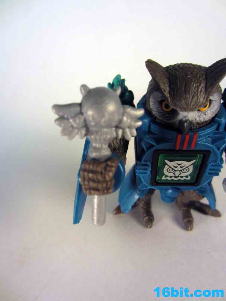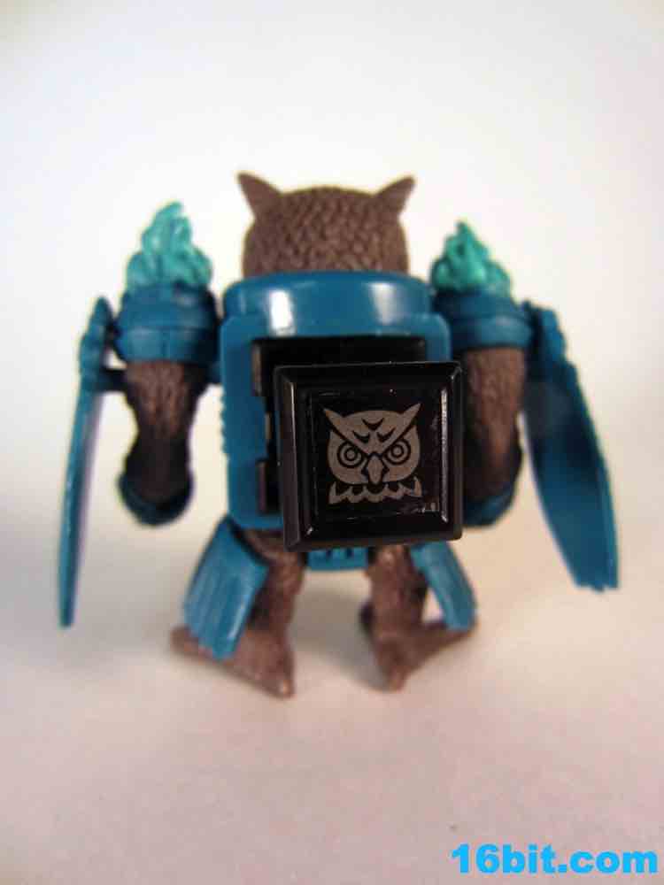 Faux armored wings are sculpted to his shoulders rather than his back, and he has a fairly realistic sculpt of an owl head on his body which just barely peeks over the neck armor. It's quite cute. One of the eyes on my sample is a little wonky, which is a shame because this one has surprisingly prominent peepers. Unlike previous birds in this line, the owl's talons are left unpainted but you'll notice some really great sculpting on his legs. His shoulders move freely, but as with most of these figures, the legs are a little restricted. The original Battle Beasts line had a couple of Owl figures, Knight Owl and Strong Hurricane. He does not appear to be an intentional update of either, aside from being a similar creature to the latter with the coloring of armor of the former.