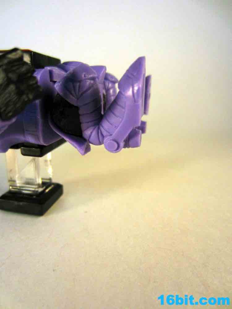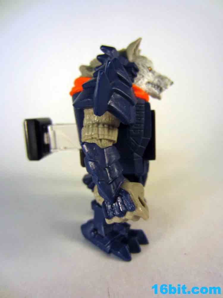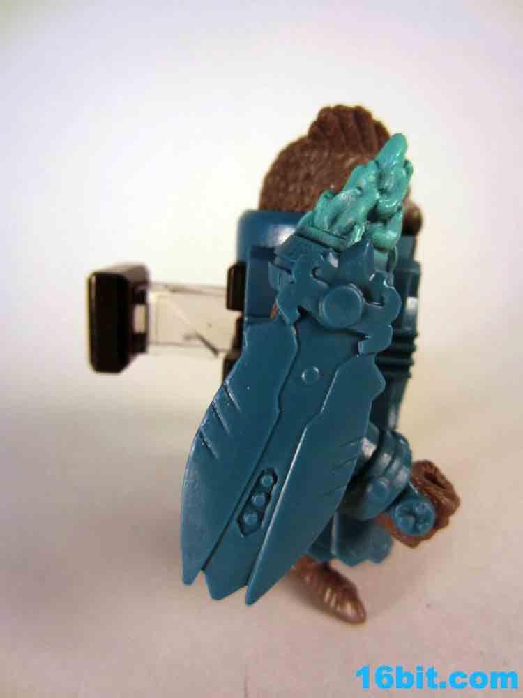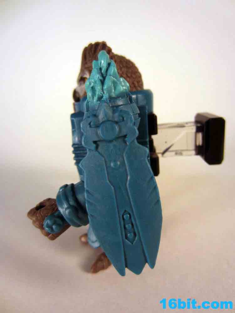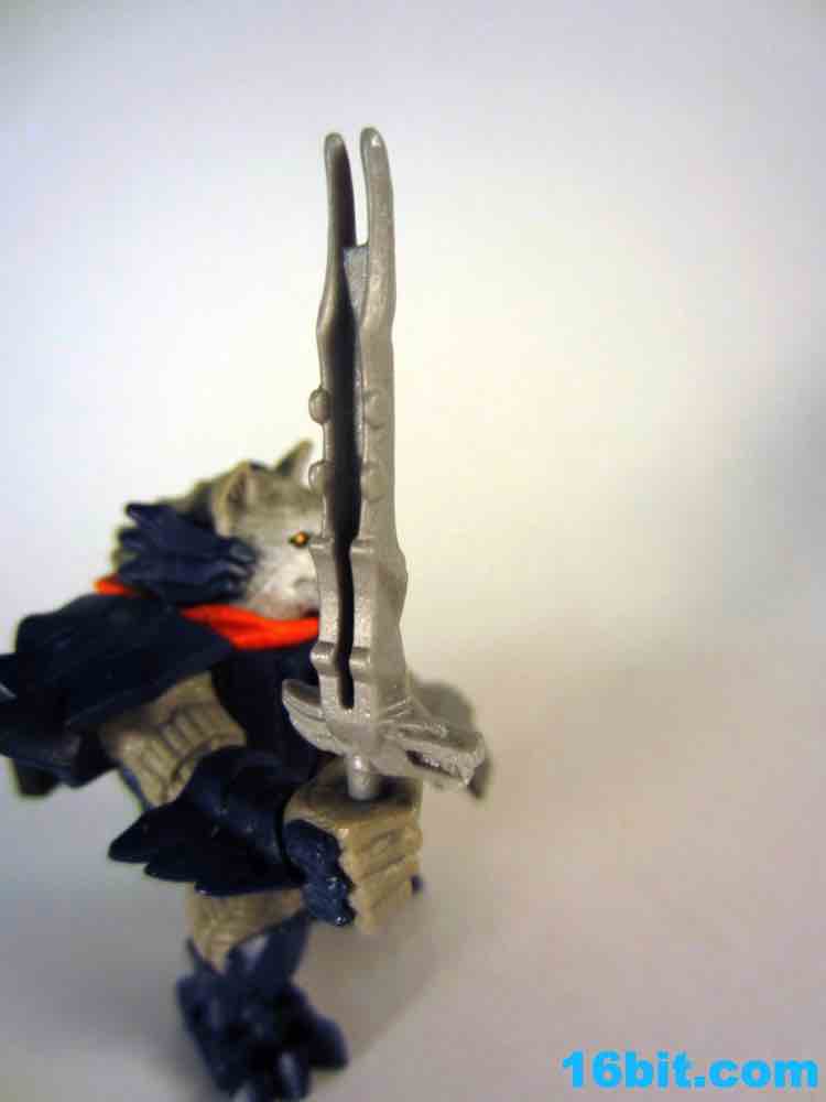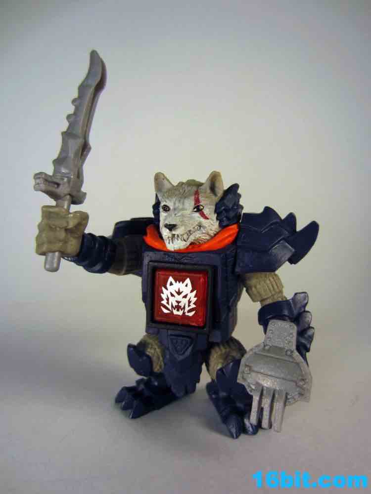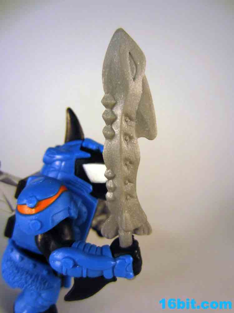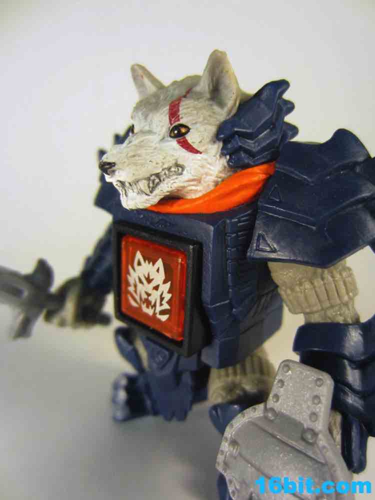 His range of movement seems superior to the other figures in the set, and he has two really good weapons. His shield doubles as a claw weapon, while his sword just looks vicious. It has two blades, plus a wolf's head on the handle. (It's weird to think a species would put its own head on its weapon, but as a toy it looks pretty awesome.) This might be one of the best weapons in the set, plus it has a, uh, interestingly shaped giggle-worthy tip. You really can't go wrong with this one. He's definitely going to give the Armorvor figures here a run for their money.