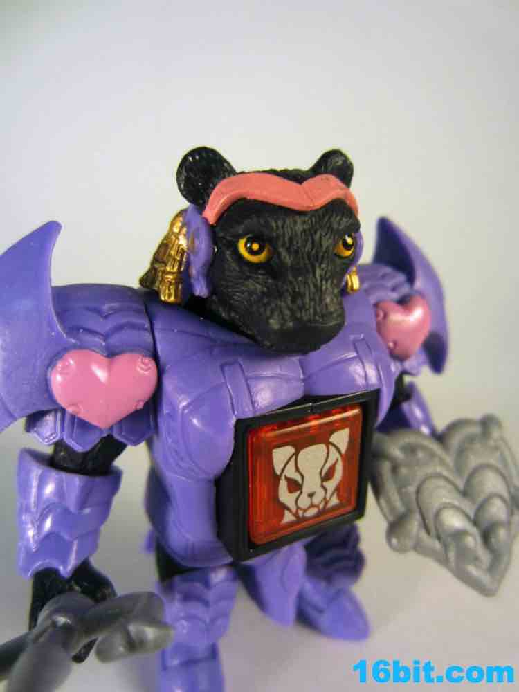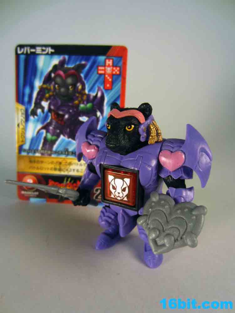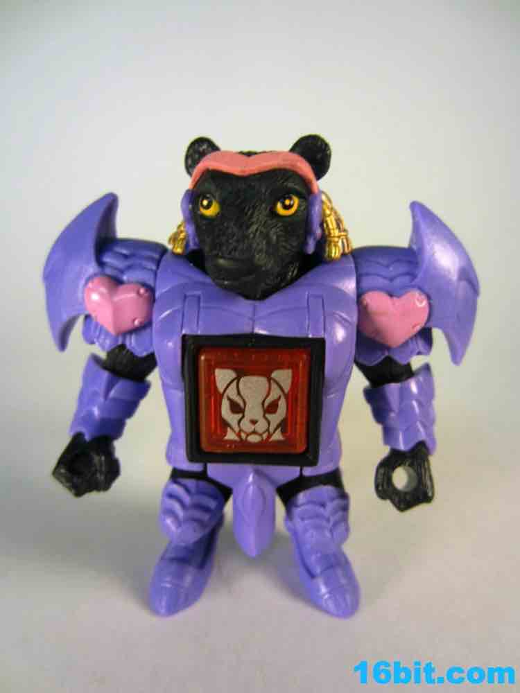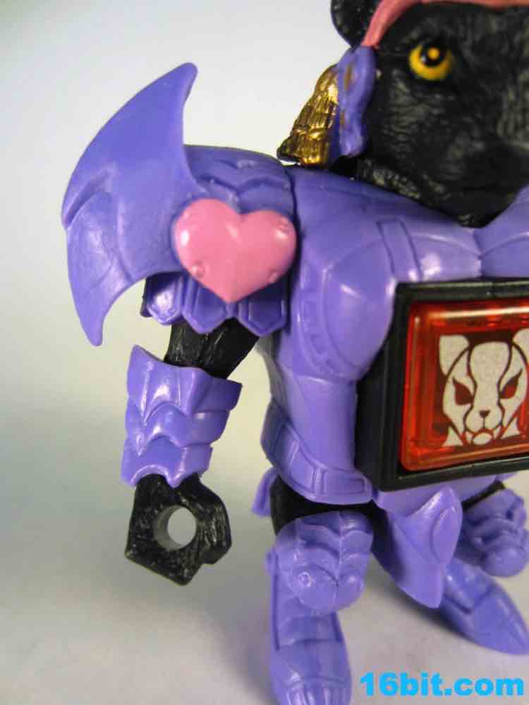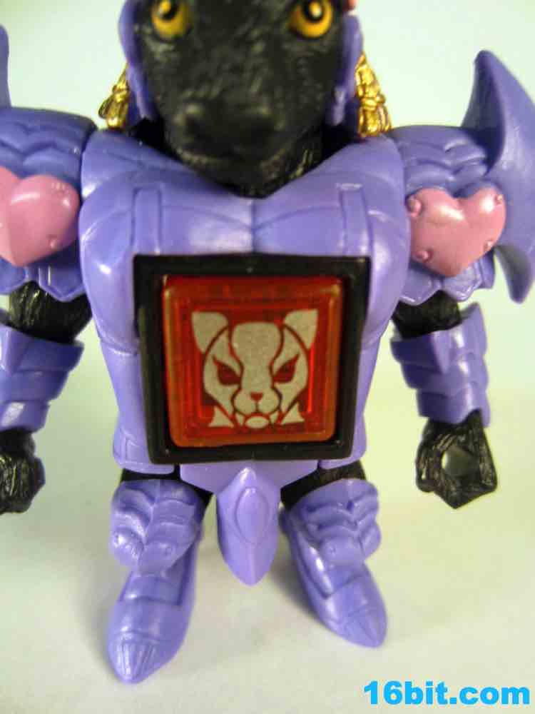 Next up is Repermint , a confusing character on all fronts. From early photography I assumed this was a bear, but the die in the chest makes it clear that no, it's a panther or a big black cat of some sort. For the time being, she serves as the line's sole female warrior and, uh, it's a little ridiculous. (Pictures from the manga are floating around and make her look more like a domesticated housecat.) They decided to give the poor little panther a heart shield, a sai of some sort, boobs, high-heeled boots, and hearts plus what are effectively gold earrings. The sculpt is quite good, the face looks like a big cat and the armor is cleanly done. Her feet move forward a little and back a lot, with freely-rotating arms and weapons which fit right in her hands.