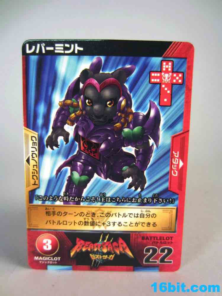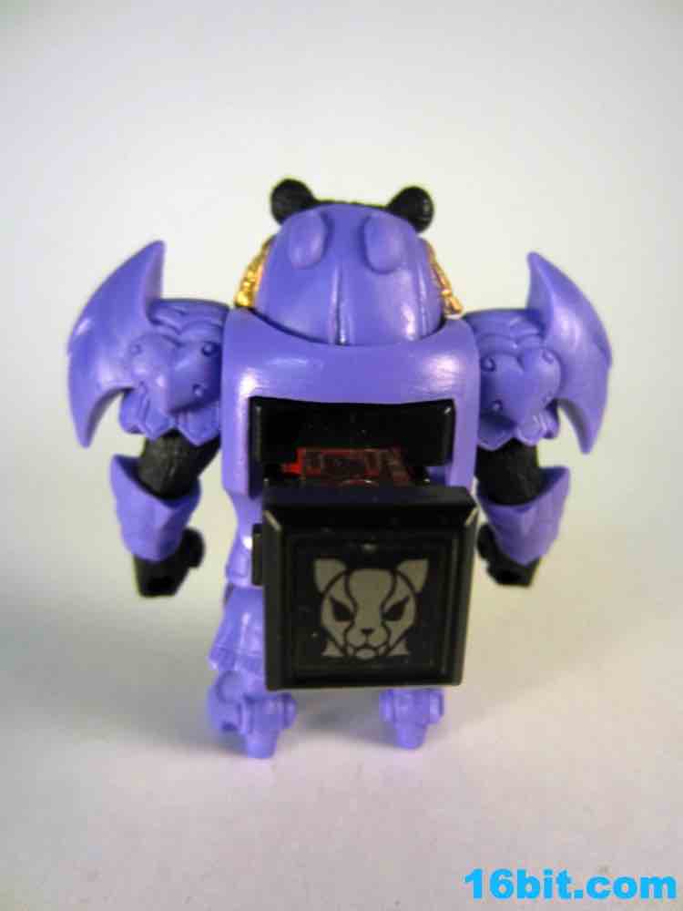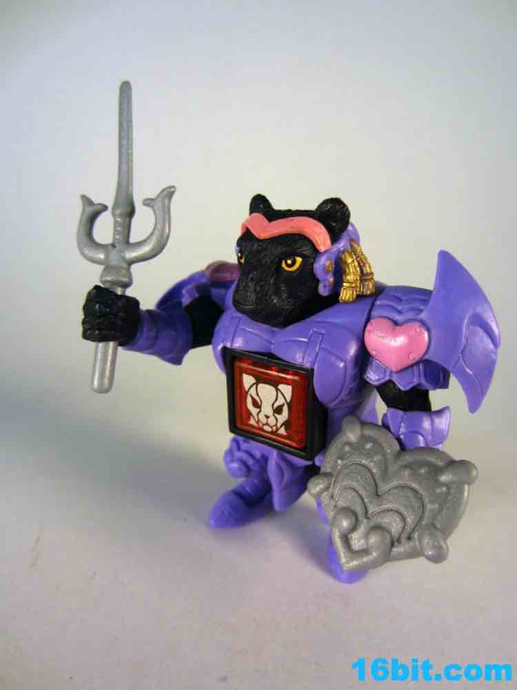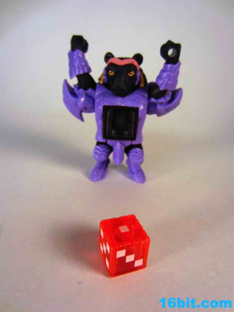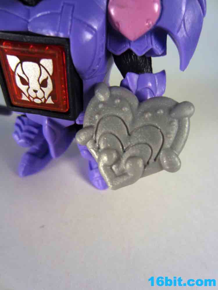 Next up is Repermint , a confusing character on all fronts. From early photography I assumed this was a bear, but the die in the chest makes it clear that no, it's a panther or a big black cat of some sort. For the time being, she serves as the line's sole female warrior and, uh, it's a little ridiculous. (Pictures from the manga are floating around and make her look more like a domesticated housecat.) They decided to give the poor little panther a heart shield, a sai of some sort, boobs, high-heeled boots, and hearts plus what are effectively gold earrings. The sculpt is quite good, the face looks like a big cat and the armor is cleanly done. Her feet move forward a little and back a lot, with freely-rotating arms and weapons which fit right in her hands.