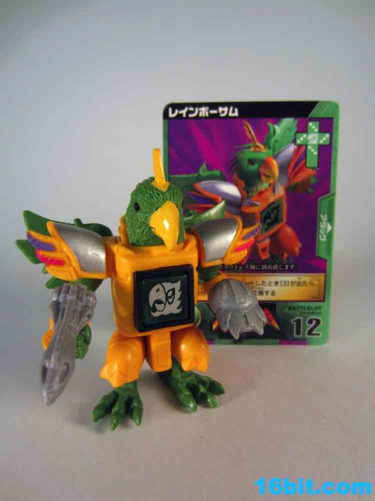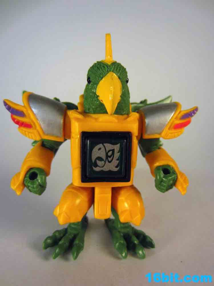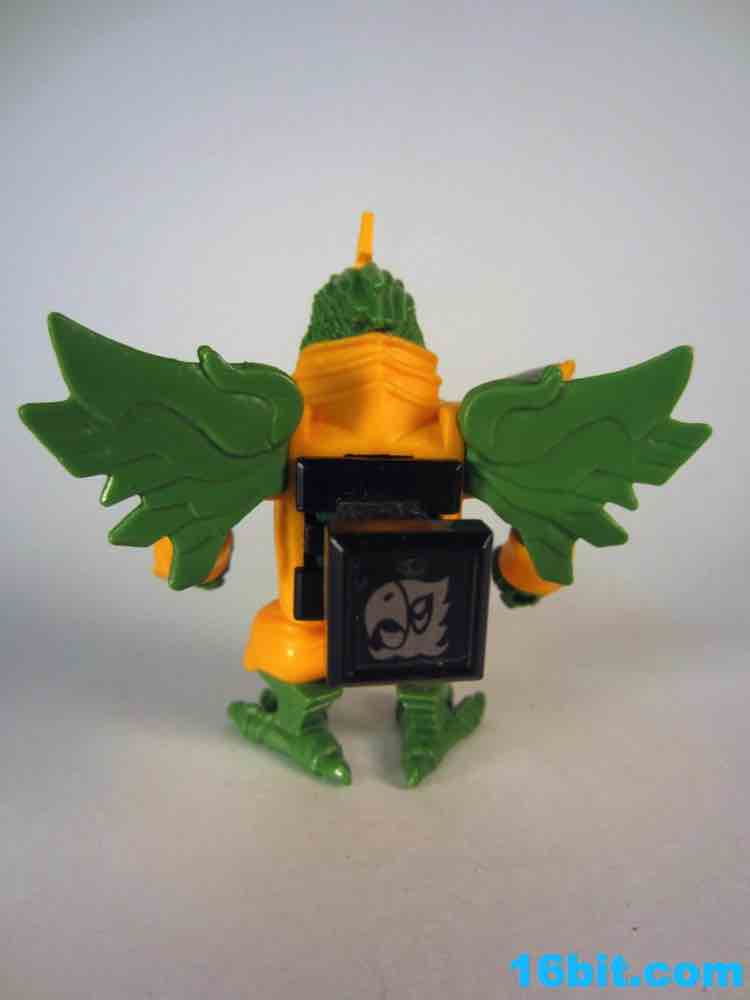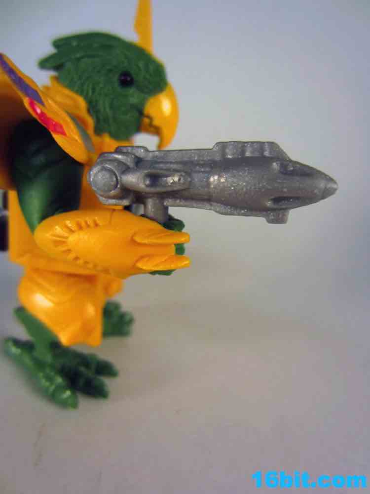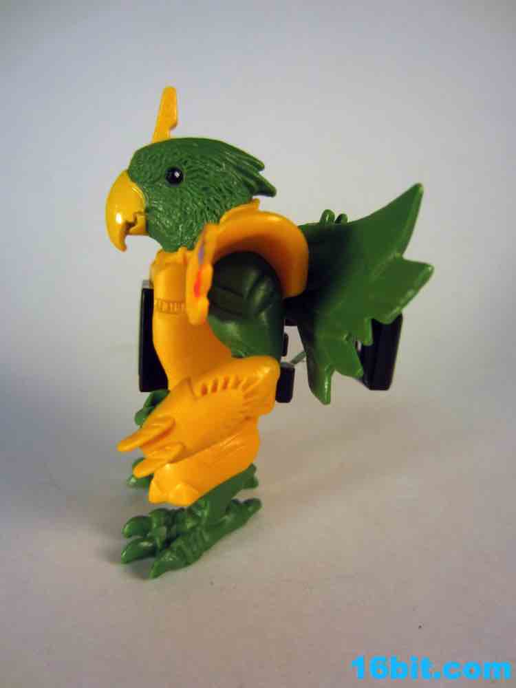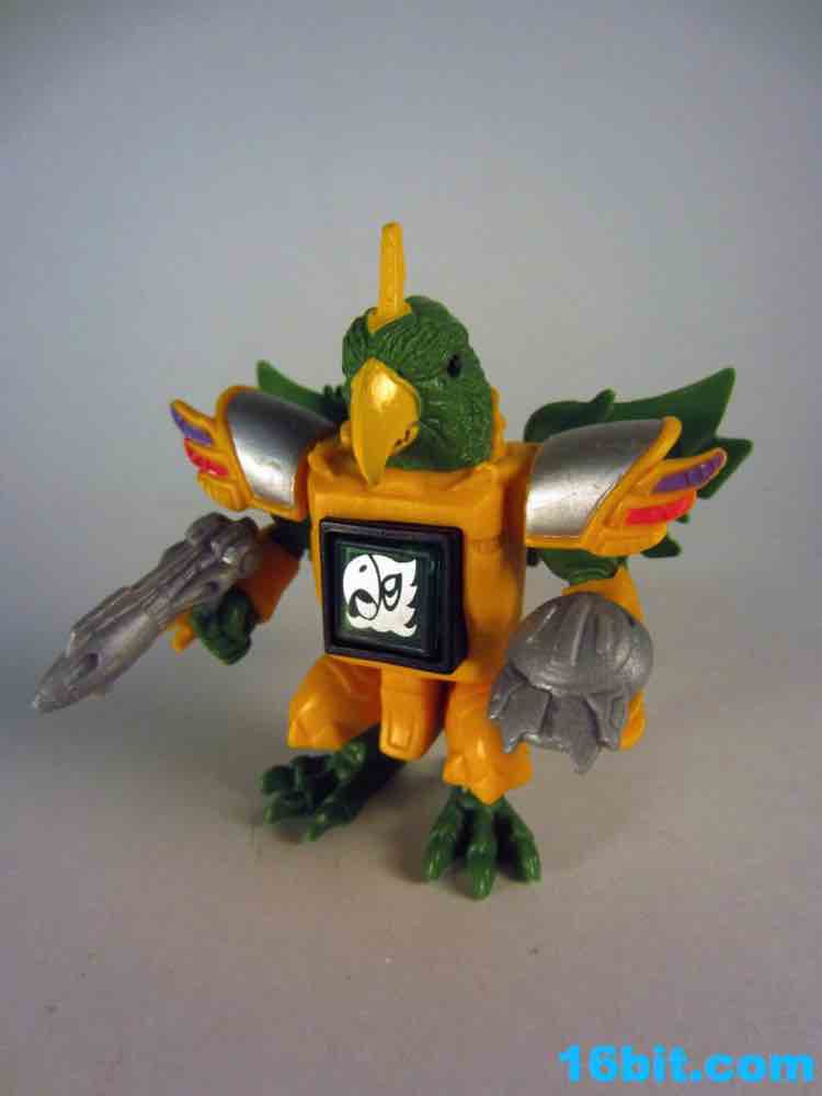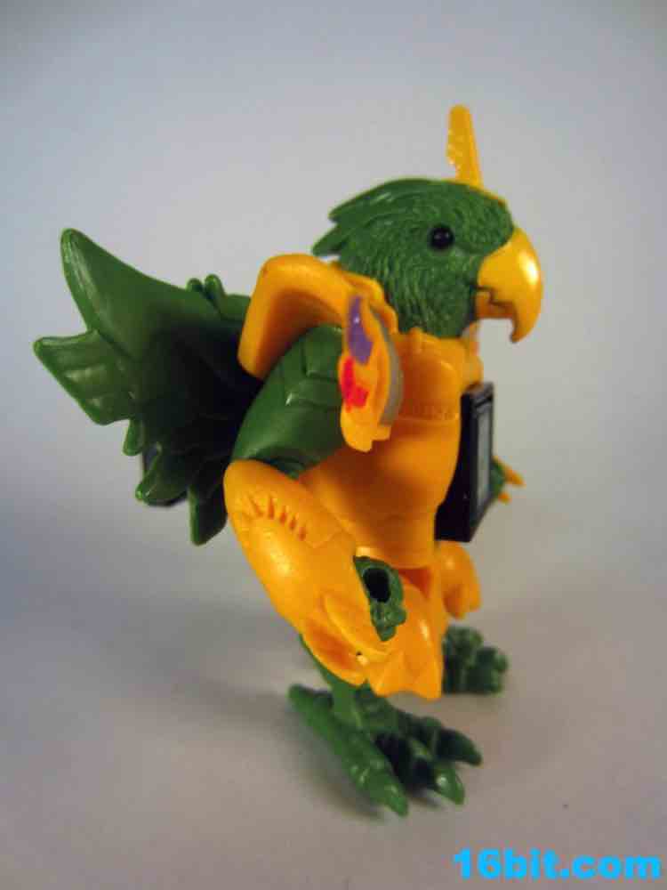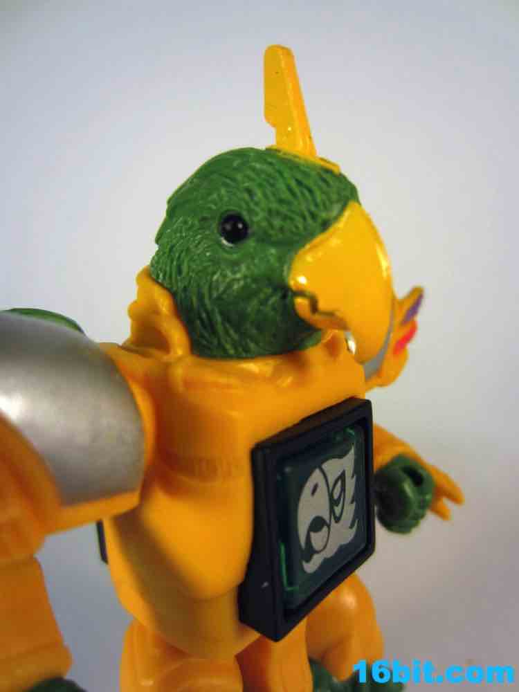 The parrot Rainborsam may well be an update of a Laser Beasts figure of the same name (well, "Rainbow Sam" anyway.) The 1980s figure had yellow armor and a red head, while the new one opts for green feathers. Mechanical green wings sprout forth from his back, and he sports green hands and feet as well. I assume he's a "gag" figure in that he carries a gun like the pigeon and hamster, but that's just a hunch. The face is really cute, with a pointy crest out of his skull and a slight smile on his beak.