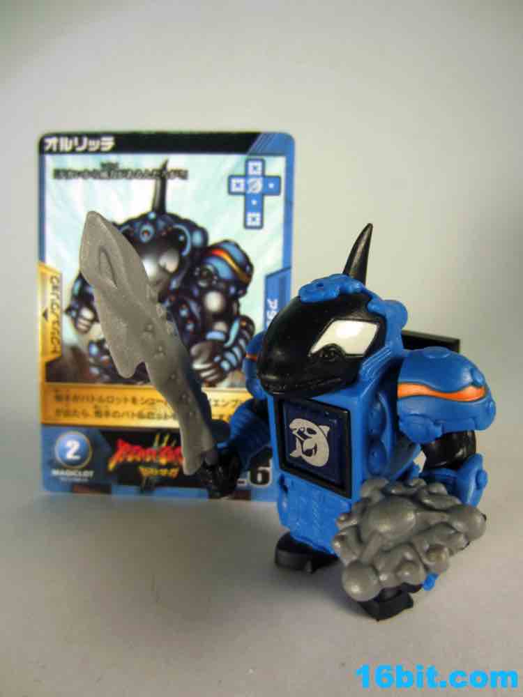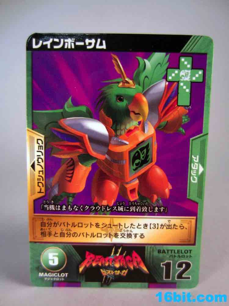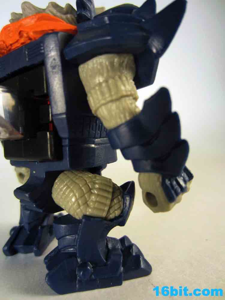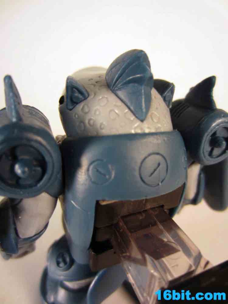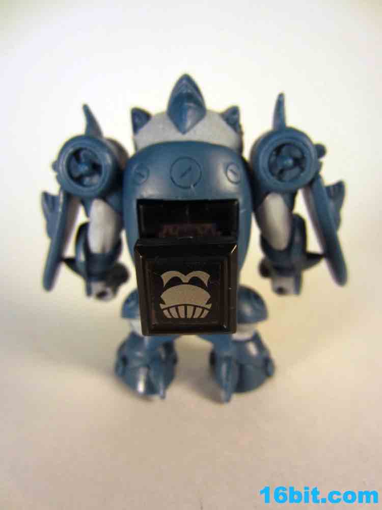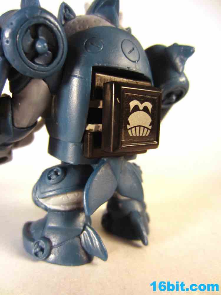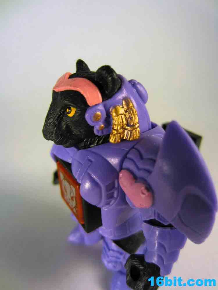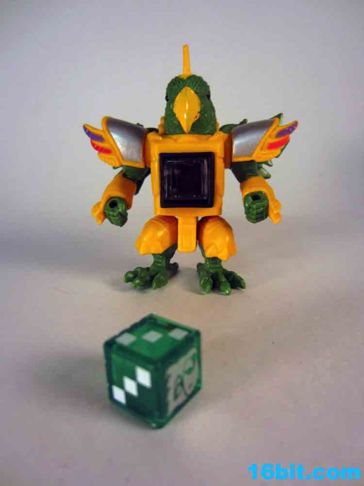 The parrot Rainborsam may well be an update of a Laser Beasts figure of the same name (well, "Rainbow Sam" anyway.) The 1980s figure had yellow armor and a red head, while the new one opts for green feathers. Mechanical green wings sprout forth from his back, and he sports green hands and feet as well. I assume he's a "gag" figure in that he carries a gun like the pigeon and hamster, but that's just a hunch. The face is really cute, with a pointy crest out of his skull and a slight smile on his beak.
