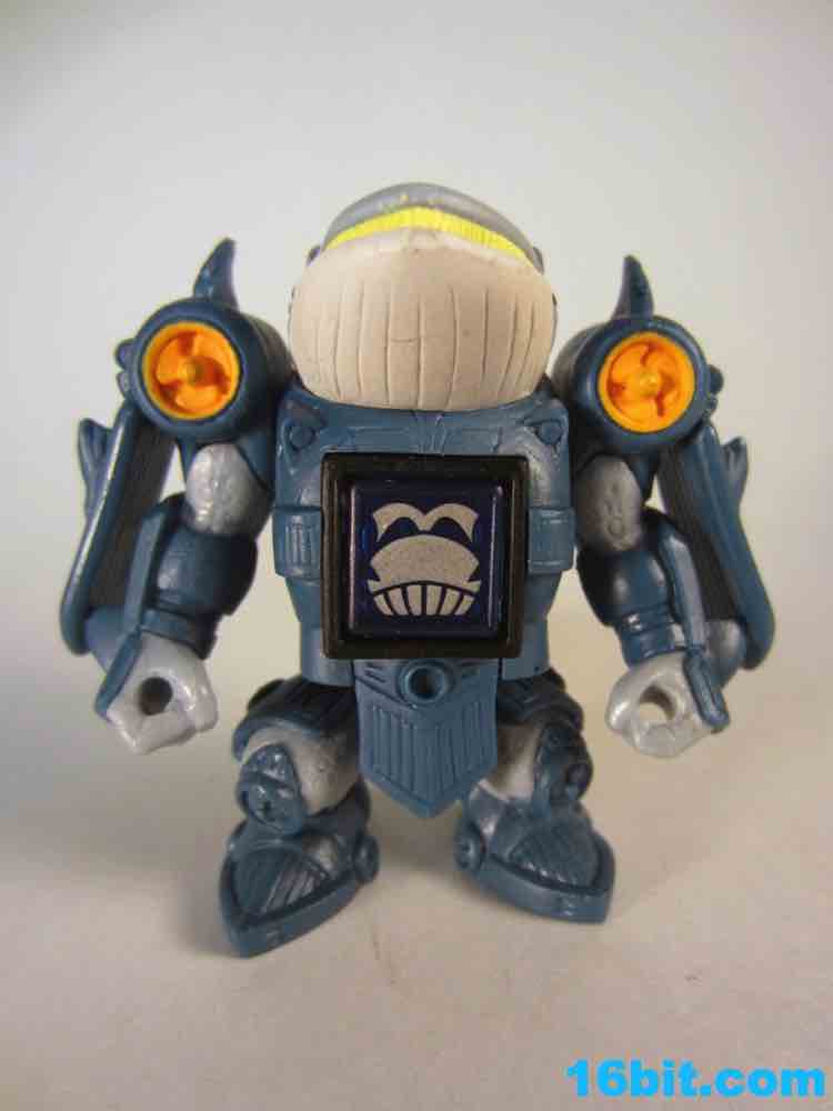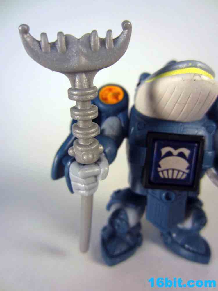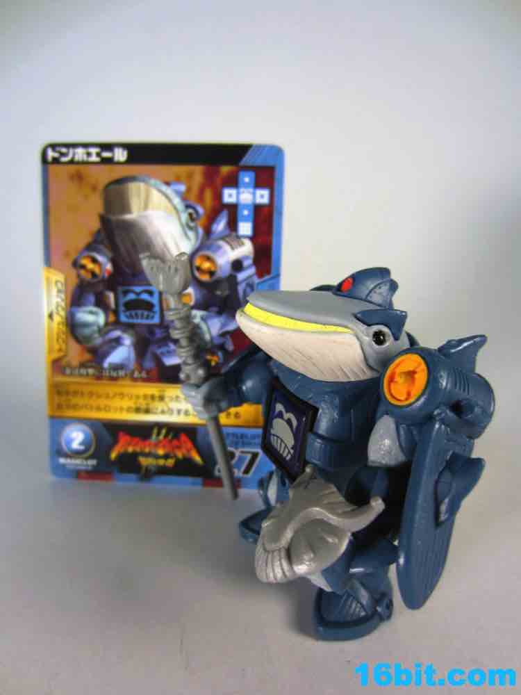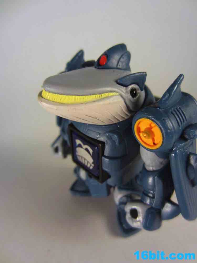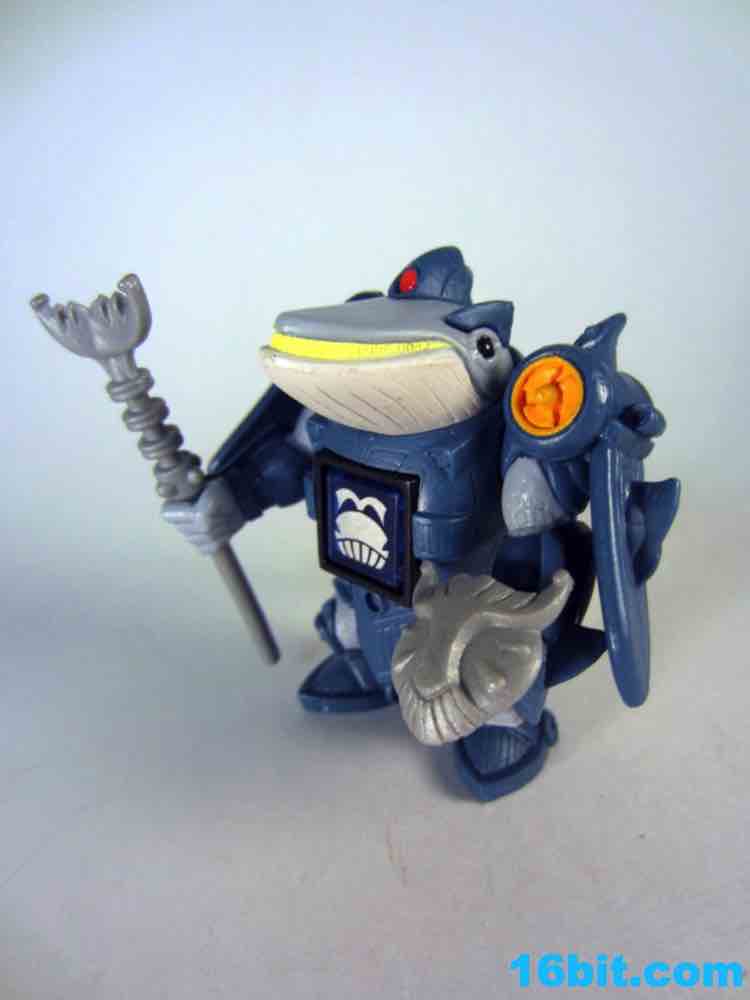 The Sea Tribe's Donwhale is part of the reason I got super-excited about this set. As a kid I always wanted a whale Battle Beasts figure and never got one. Sure, Japan had Sea Panic, but I still don't have one of those. Modeled after a blue whale (I think) this little guy has sculpted surfboard armor, a laser on his head, what seem to be sculpted barnacles on his neck, and an awesome whale tail-themed staff plus a matching shield. It's really nice! He has a big yellow smile with painted baleen, and he feels like he got the most love in terms of paint. Orange rotors on his shoulders, black eyes, and more just make this guy pop. Did I mention he has a tiny whale tale sculpted to the back of his armor? He does. He's awesome. I've wanted a little whale of my own since 1987 and by gum, I'm glad I got this one.