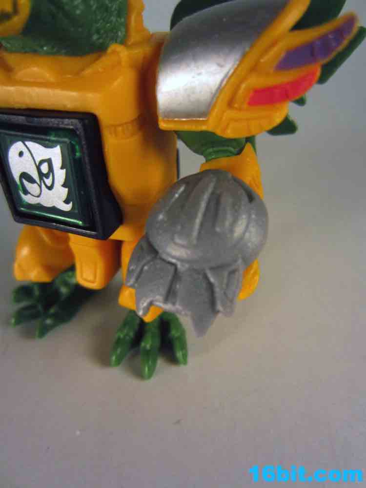 When I think of this kind of tropical large bird I generally don't think "green!" but hey, it's cool. I'd love to see a redeco with more colors, but I'm guessing Takara-Tomy don't much want to add extra paint applications on these guys. His gun doesn't immediately bring another weapon or creature to mind, and his shield vaguely resembles a feathery tail.