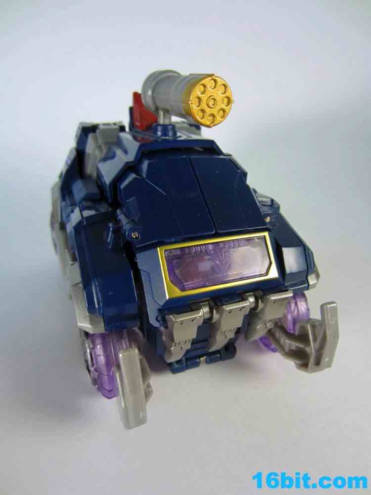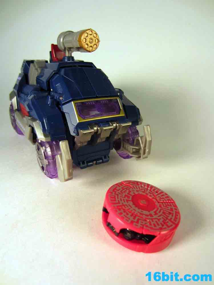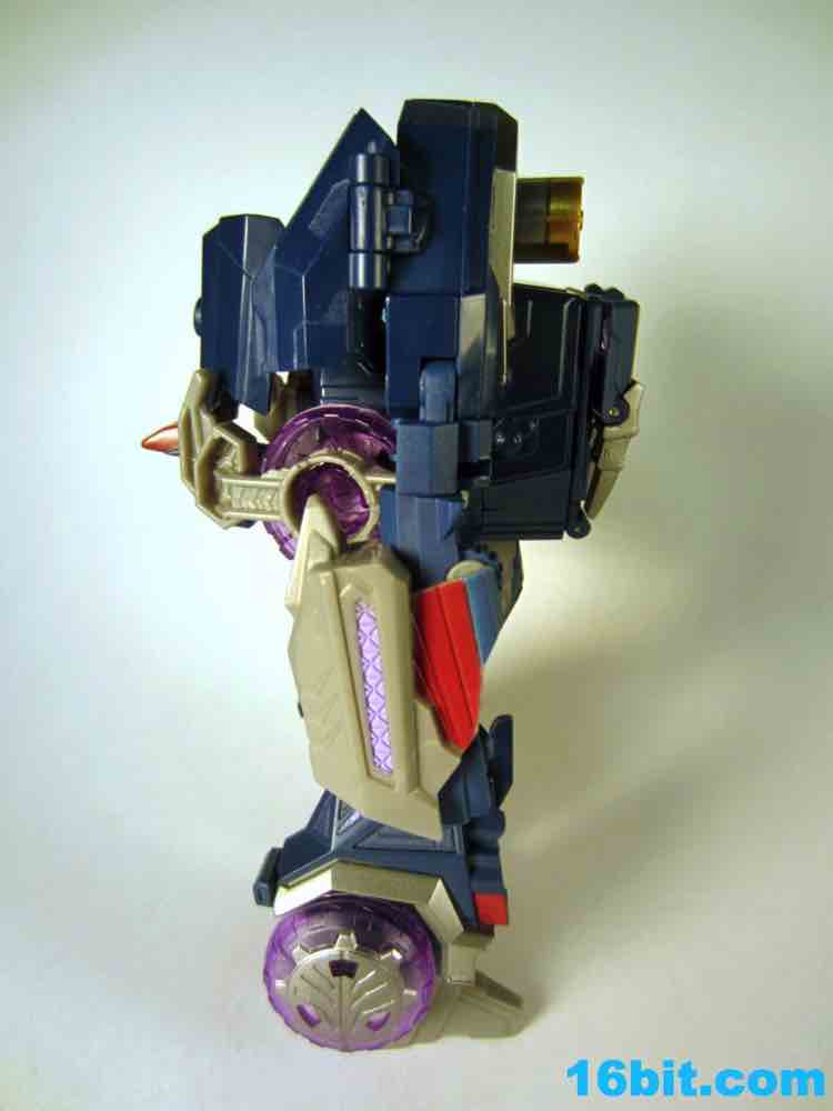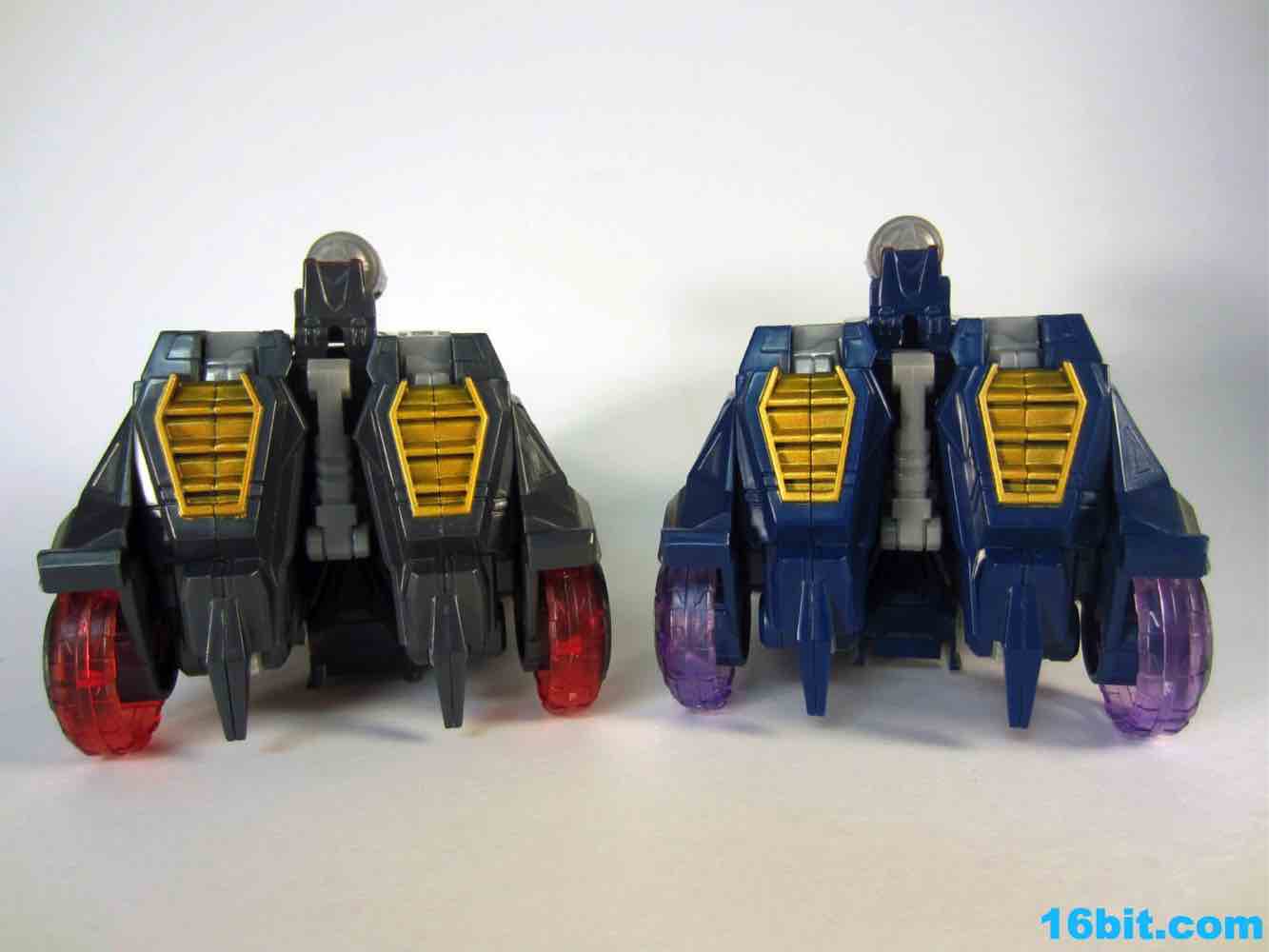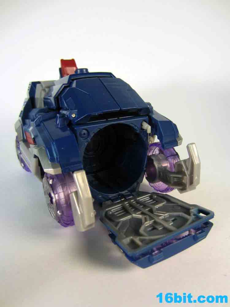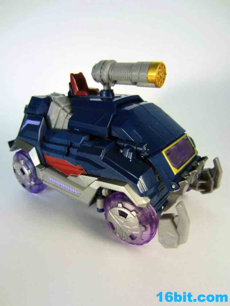 The vehicle mode is a bigger version of the original, with rolling wheels and not much else. His battery shoulder cannon now sits on top of the vehicle as either a gun or a communications device, and here's the funny thing. There's a little red seat behind it, but it's so small that no currently available figure I can identify would fit in it. The transparent purple wheels have silver hubcaps and look pretty great. It'd be even better if they left the design on the hubcap unpainted so some purple could shine through.