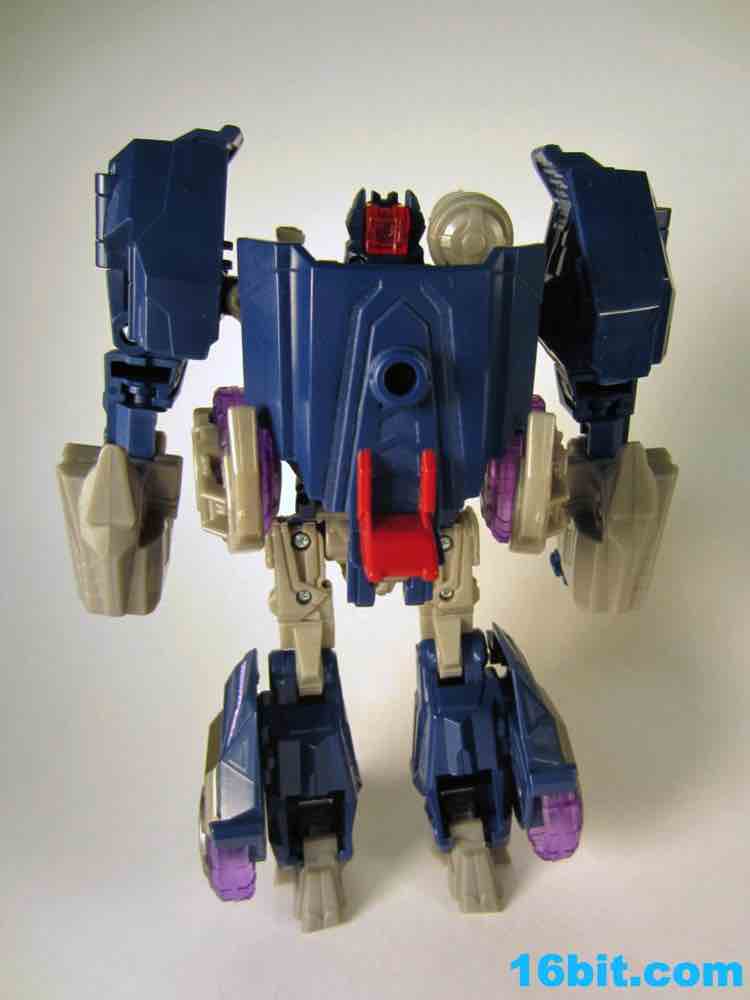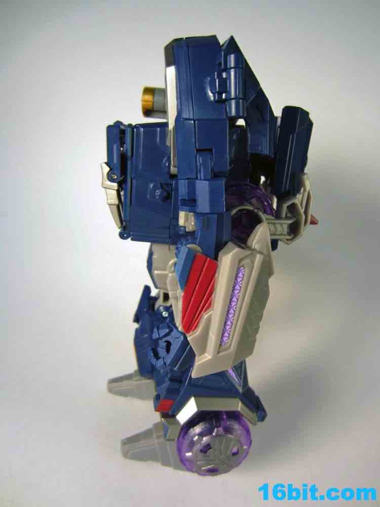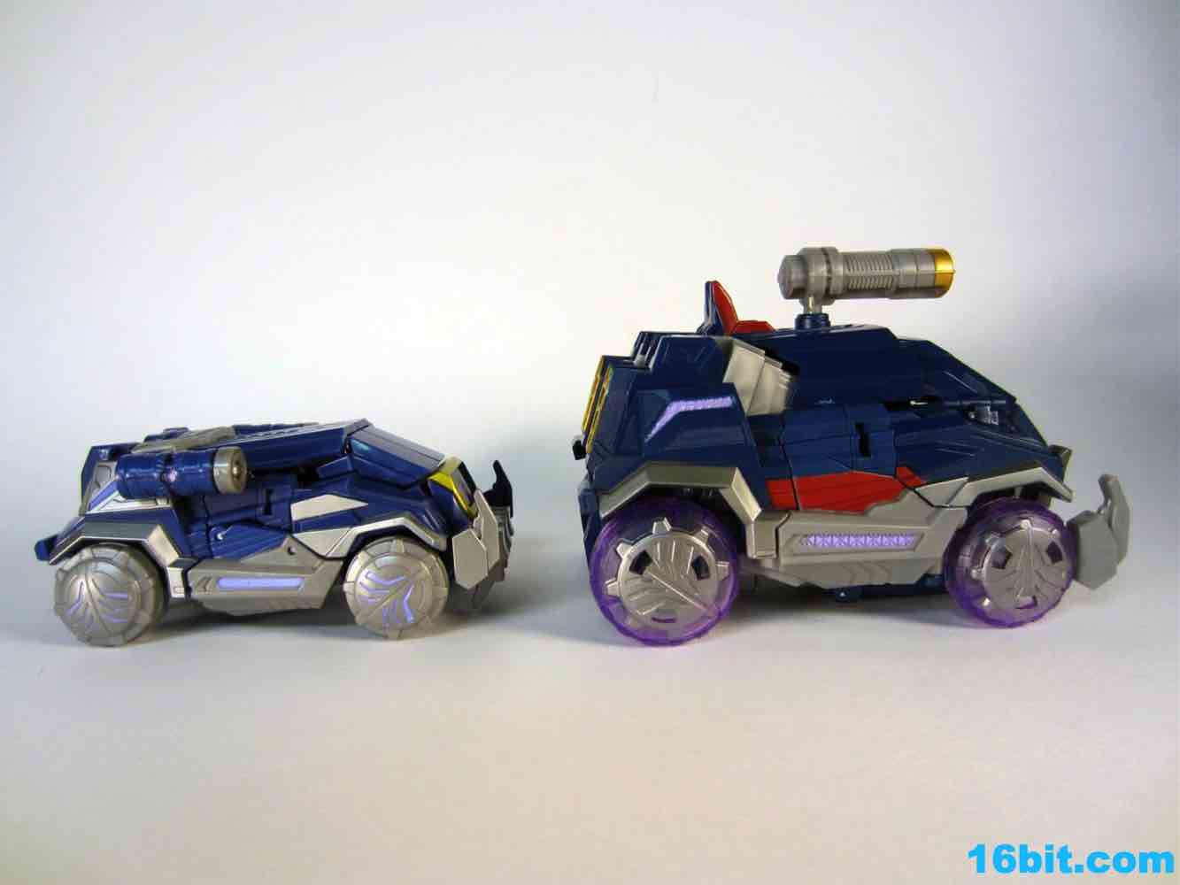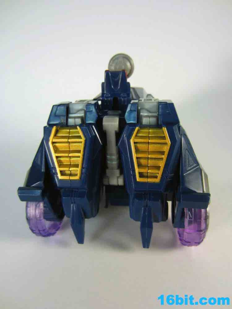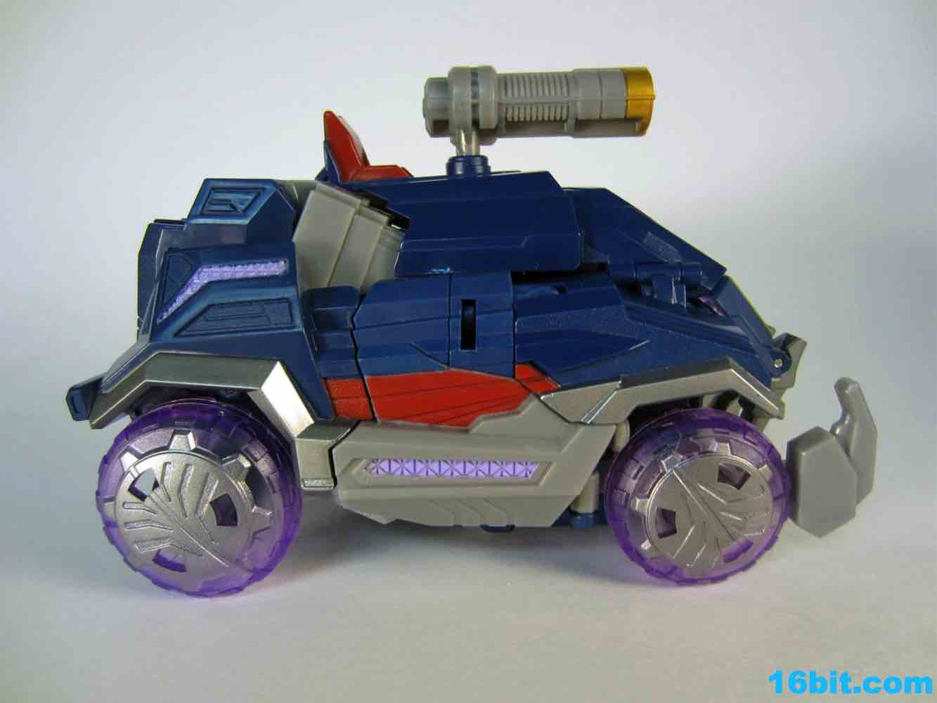 The vehicle mode is a bigger version of the original, with rolling wheels and not much else. His battery shoulder cannon now sits on top of the vehicle as either a gun or a communications device, and here's the funny thing. There's a little red seat behind it, but it's so small that no currently available figure I can identify would fit in it. The transparent purple wheels have silver hubcaps and look pretty great. It'd be even better if they left the design on the hubcap unpainted so some purple could shine through.