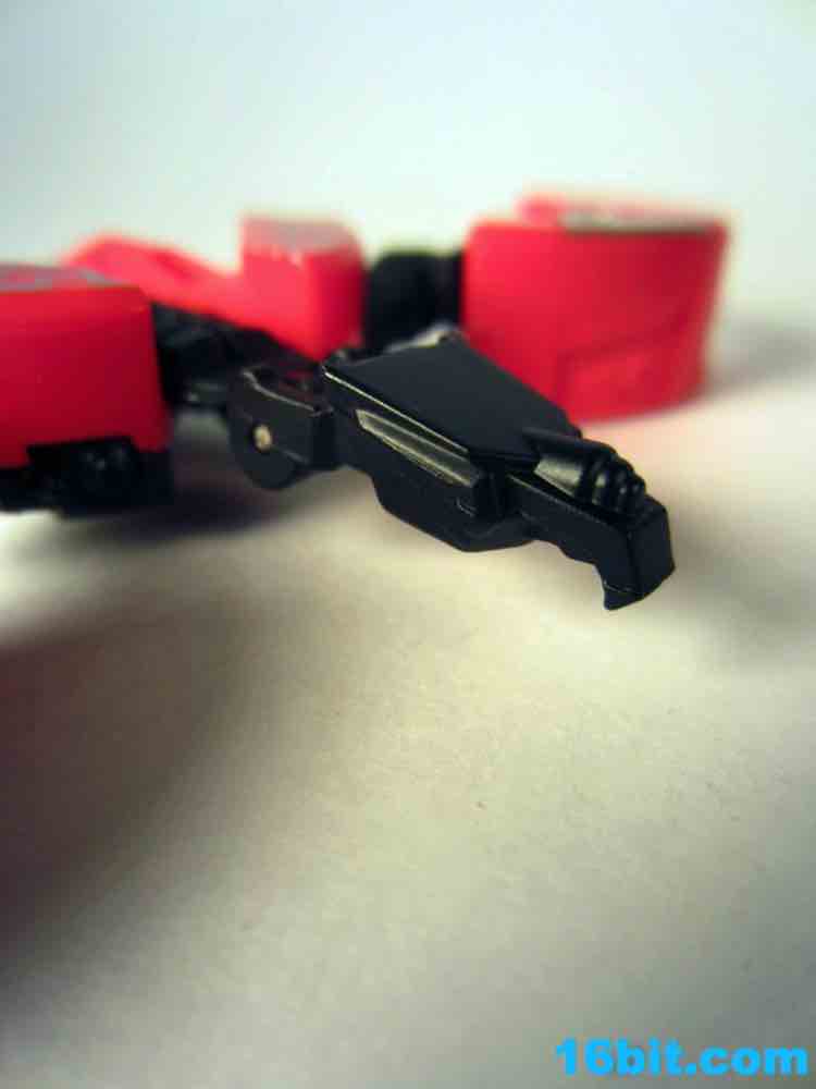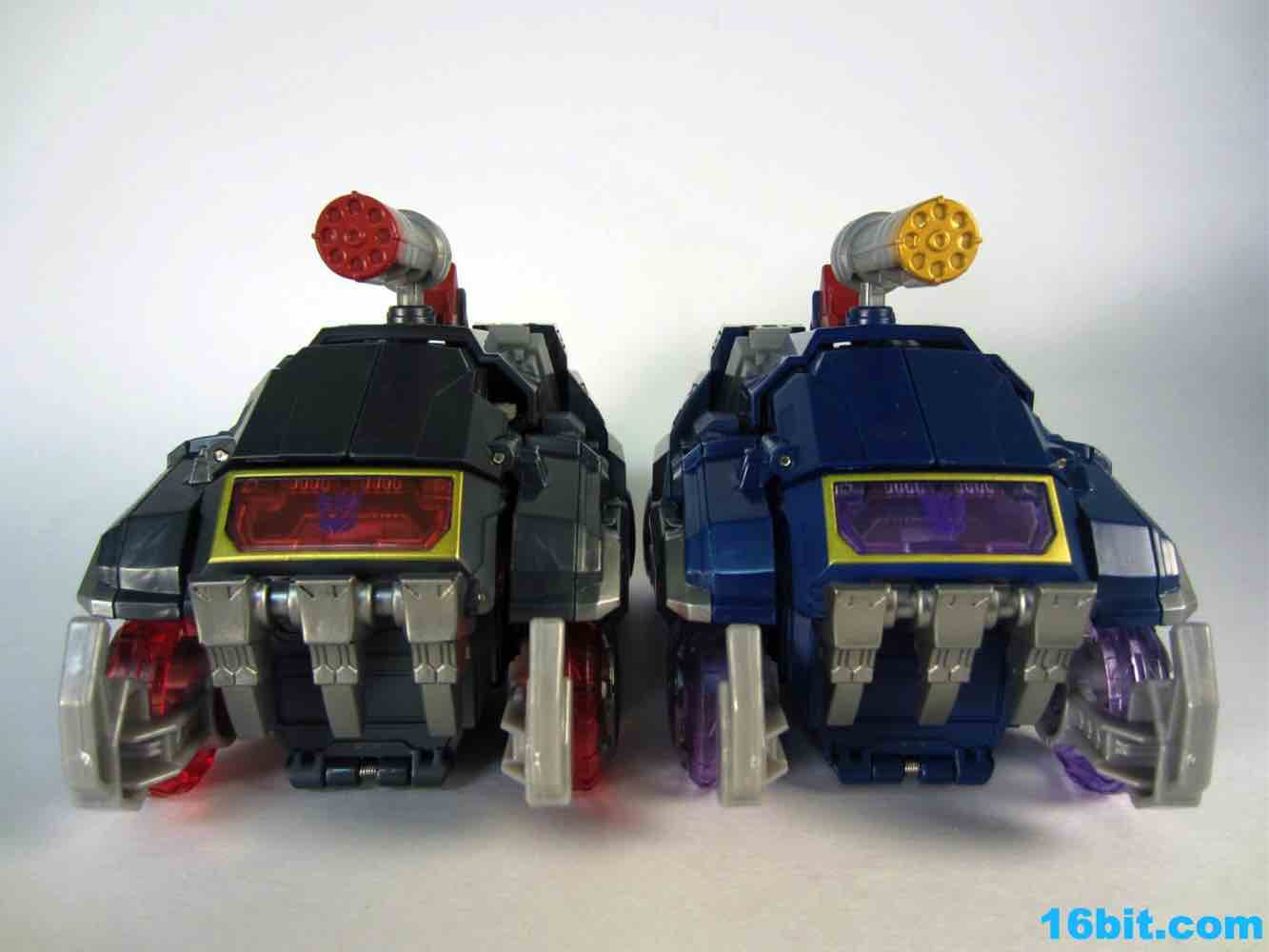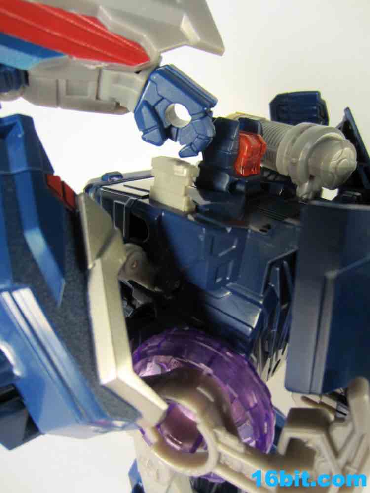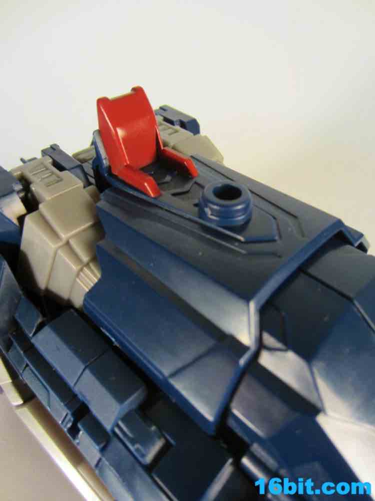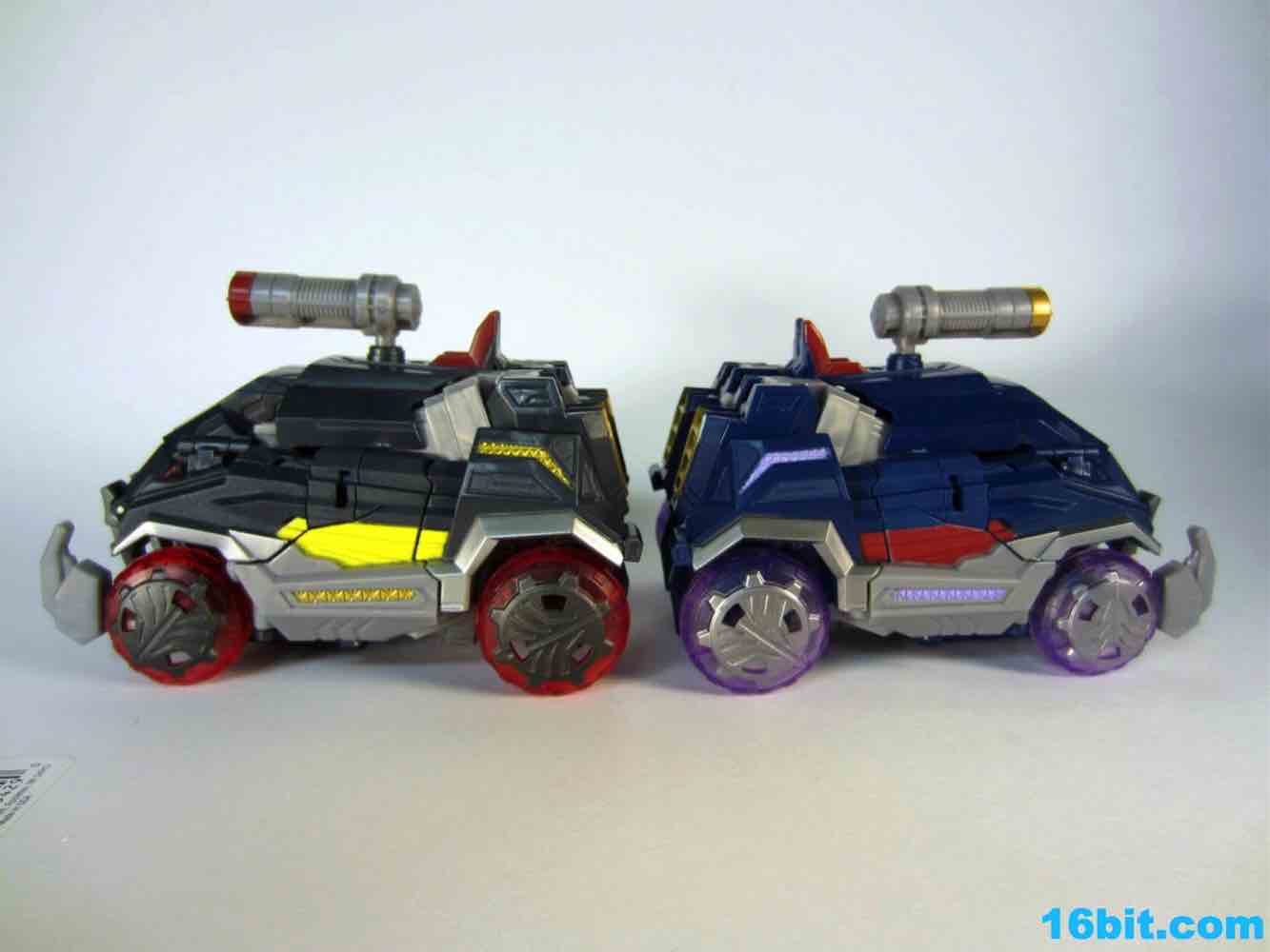 The vehicle mode is a bigger version of the original, with rolling wheels and not much else. His battery shoulder cannon now sits on top of the vehicle as either a gun or a communications device, and here's the funny thing. There's a little red seat behind it, but it's so small that no currently available figure I can identify would fit in it. The transparent purple wheels have silver hubcaps and look pretty great. It'd be even better if they left the design on the hubcap unpainted so some purple could shine through.
