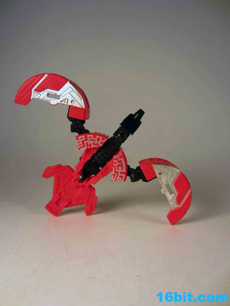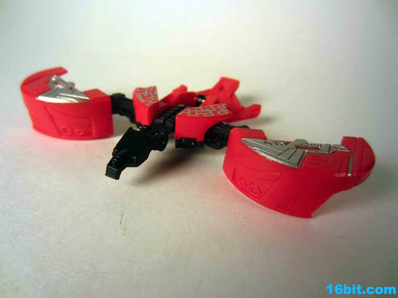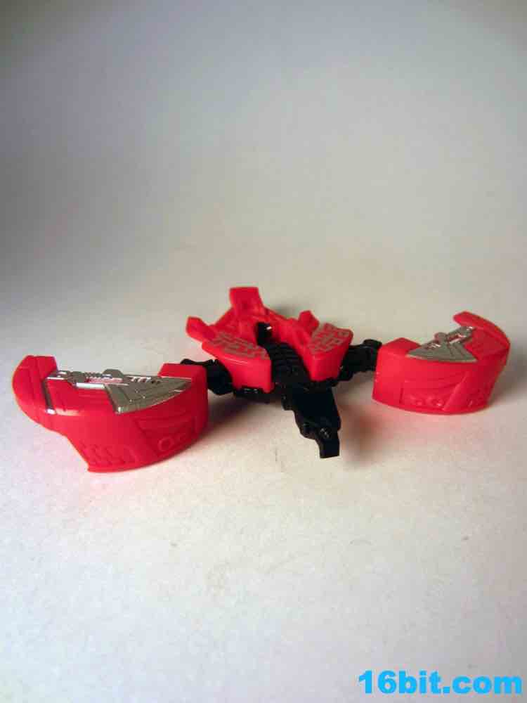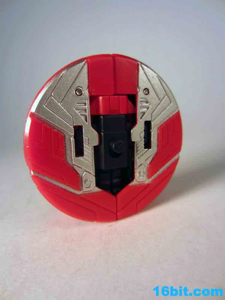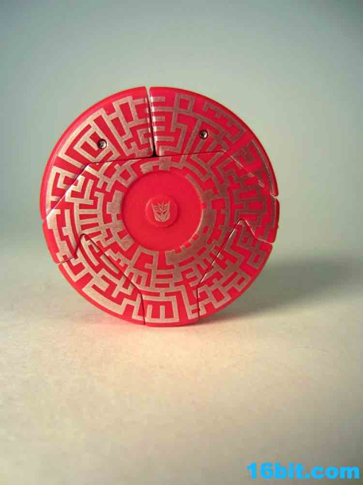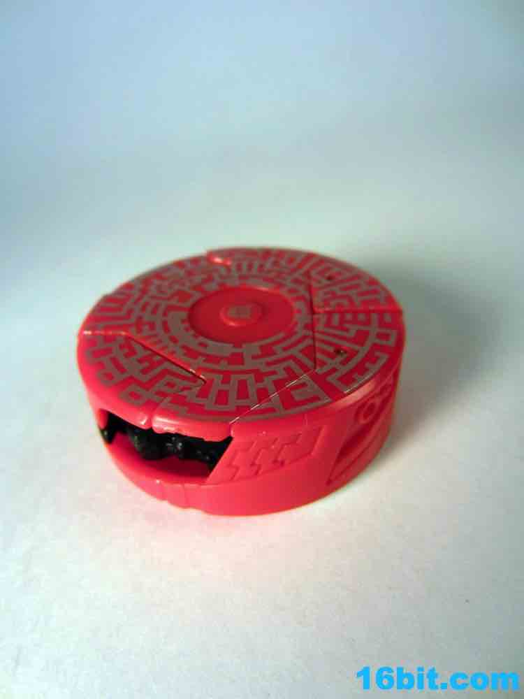 Rounding out the set is Laserbeak, now a small thick round disc. It seems to be taking a page from Bakugan, as there's a button on the bottom of the disc which activates an auto-transform when it hits a hard surface. Carpets and rugs aren't conducive to activating the feature. The disc isn't much to look at, but Laserbeak is sculpted as a nifty robo-vulture with a lot of detail. My one big complaint? The eyes are unpainted. It really would help give him some personality, although he's pretty neat as it is. The toy itself doesn't do much, as there are no weapons or parts, but the transformation makes it fun enough.
