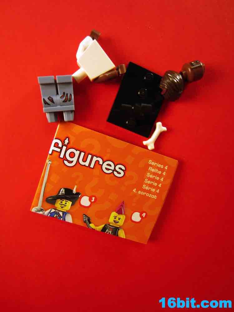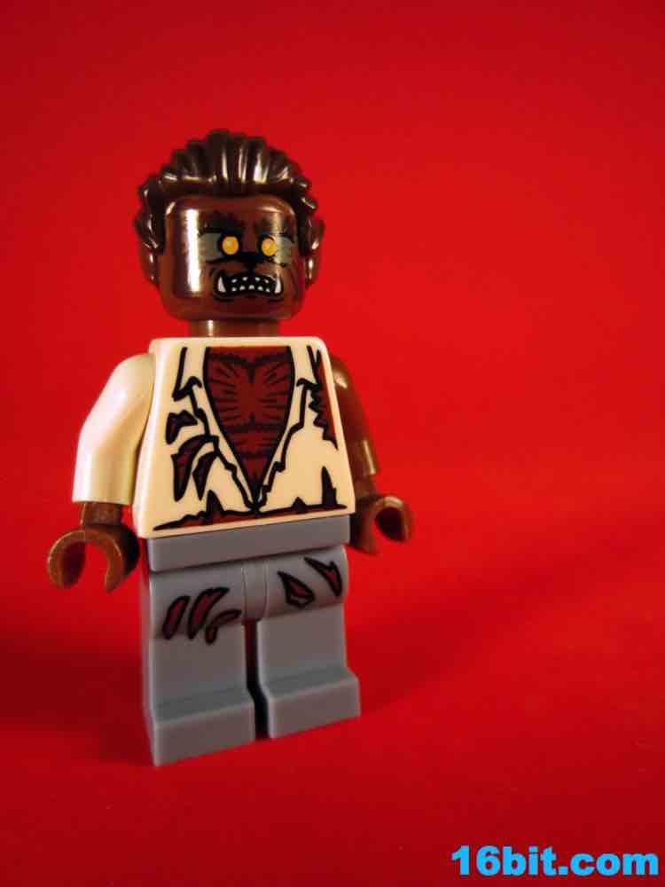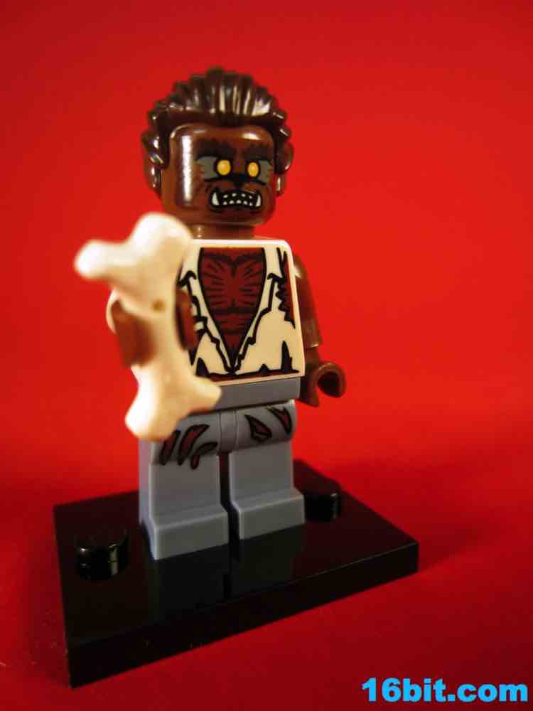 So this is basically just a normal Minifigure with a fancy hair piece and a dog bone. Easy! The figure has painted fangs, bushy eyebrows, and bright yellow eyes. His shirt and pants are torn open for some reason, with a fair amount of painted chest hair. The dark brown fur contrasts nicely with the torn blue pants and white shirt, although when you get right down to it, this isn't particularly complicated figure. This is exactly what a figure like this should be save for the bone which I gotta say doesn't really seem necessary for this one.