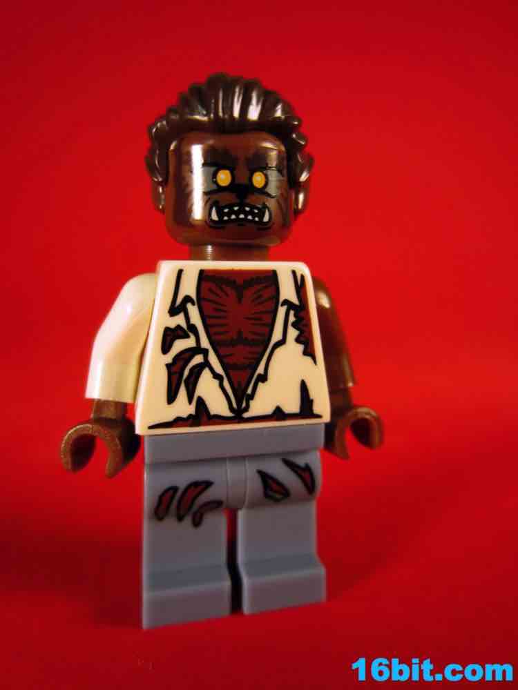 The Werewolf continues LEGO's bright idea to make classic monsters in its blind-bagged line, prior to putting out other (and sometimes better) versions in the Monster Fighters line which is due to end in about six weeks. It's not the first werewolf either, as LEGO had a wolfman in its LEGO Studios line roughly 10 years ago. Oddly, each version is quite different as the original Werewolf had a sculpted head, this one merely has a pointy ear hairpiece over a painted regular head, and the new Monster Fighters one has a new sculpted head. Oh, and this very werewolf we're reviewing shares the same hair/ear piece as the LEGO Minifigures Series 3 Elf. (LEGOlas, get it?)