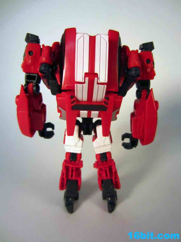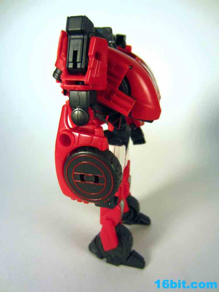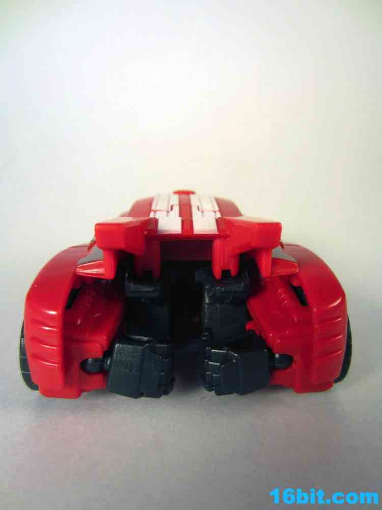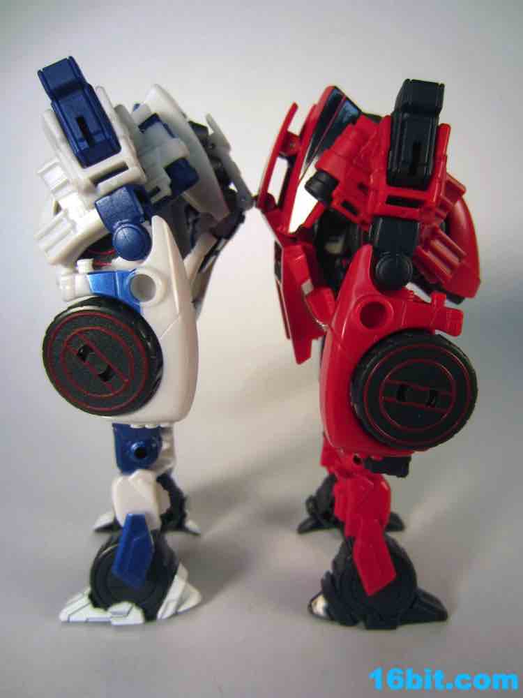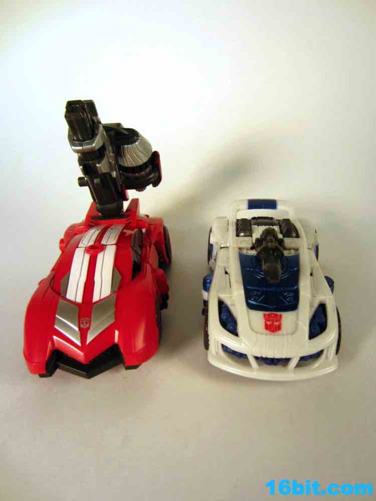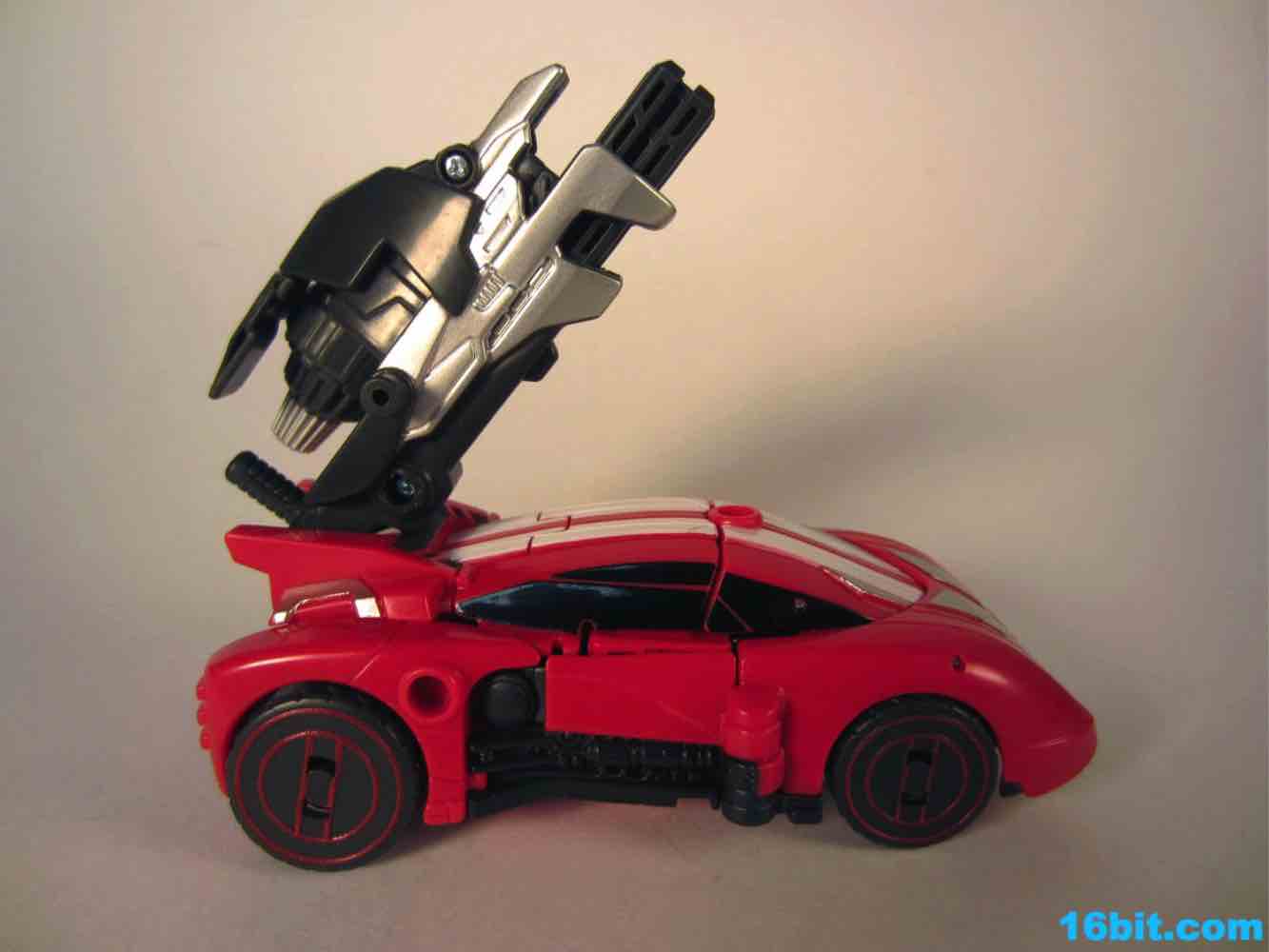 That's the good news. The bad news is that the transformation is basically the same, and my sample is a little worse. Tabbing Sideswipe's arms into the tabs on the car is difficult, and his arms also pop out a lot more. (For the record, my Jazz has yet to pop apart during transformation.) The process is pretty much the same as Jazz, but slightly less frustrating... save for the arm popping. It's still not an ideal transforming toy.
