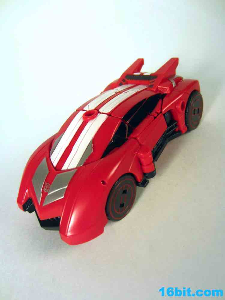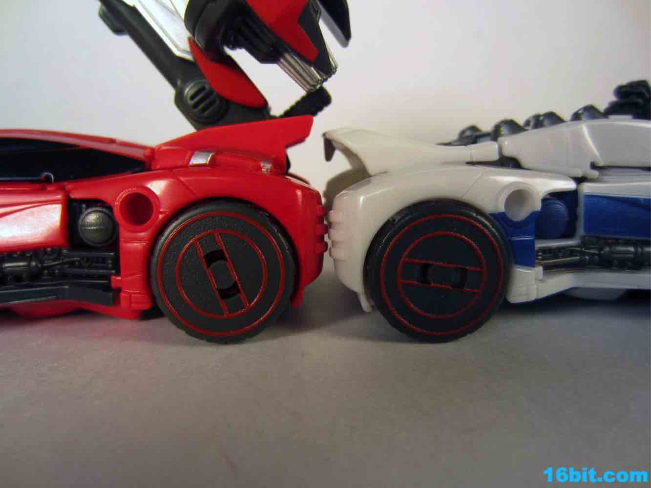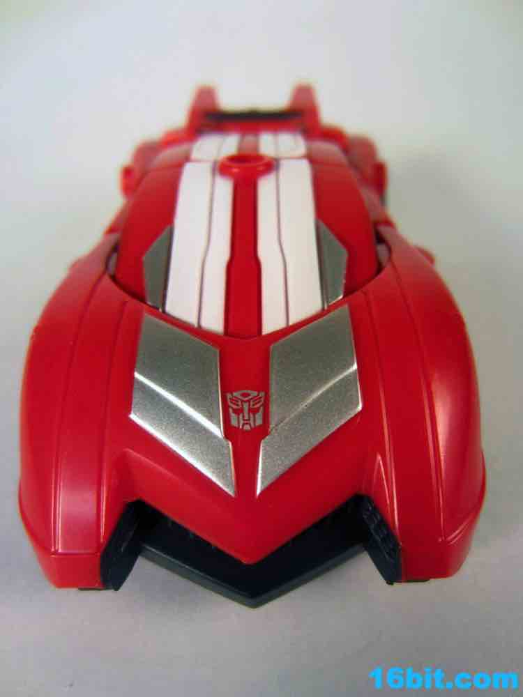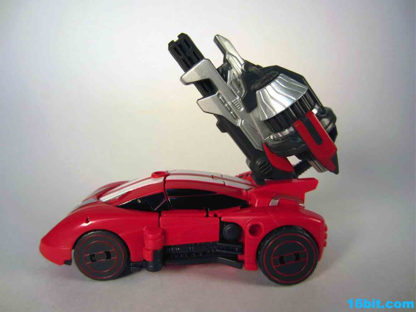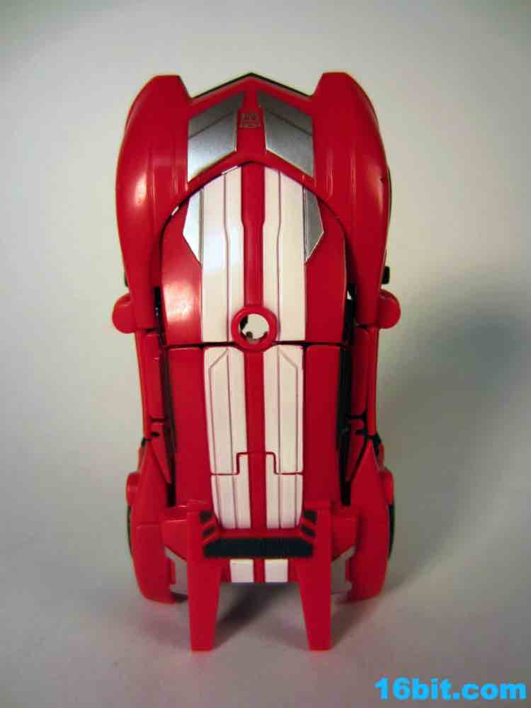 In car mode, the figure looks like a brand-new toy. As mentioned above, it builds on Jazz' chassis but adds a new body with a few new sections. The doors and fenders are basically the same, but the hood, windows, and bumper sections are all completely new. Colored red with silver stripes, they also look a heck of a lot better than Jazz' pearly but ultimately limp car paint job. You can see painted windows here, and I would argue he makes a better car than a robot.
