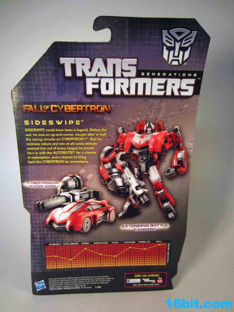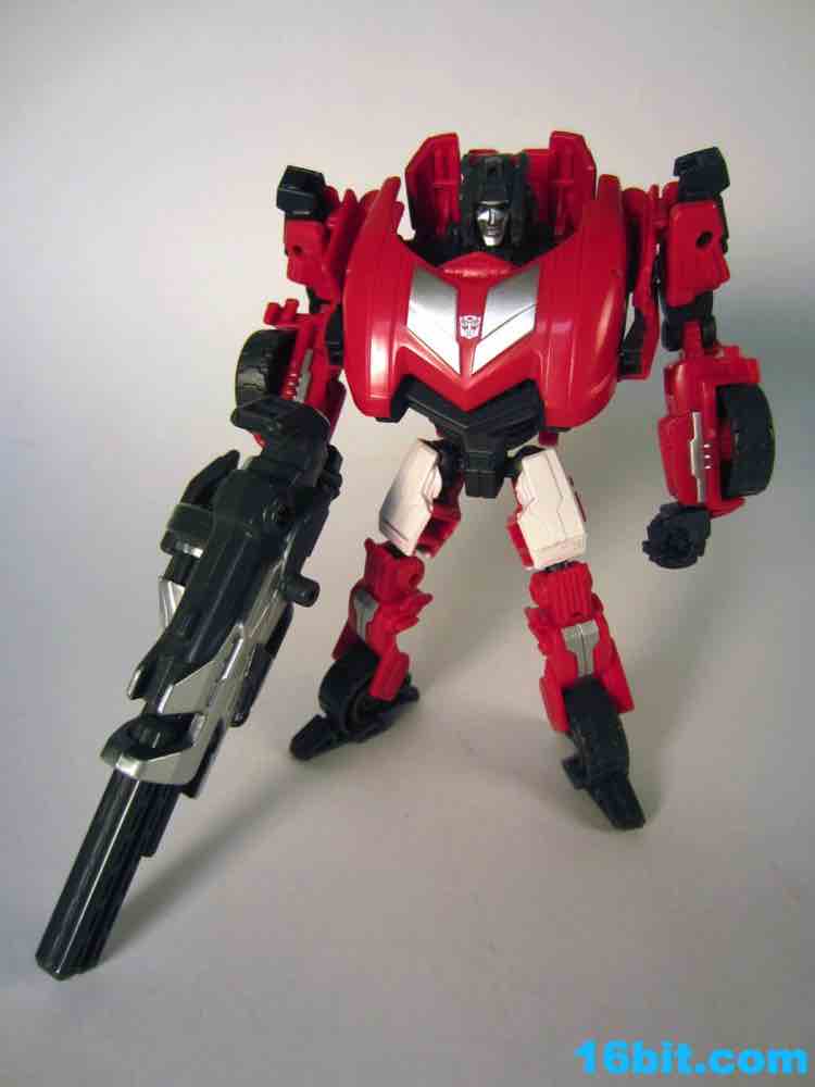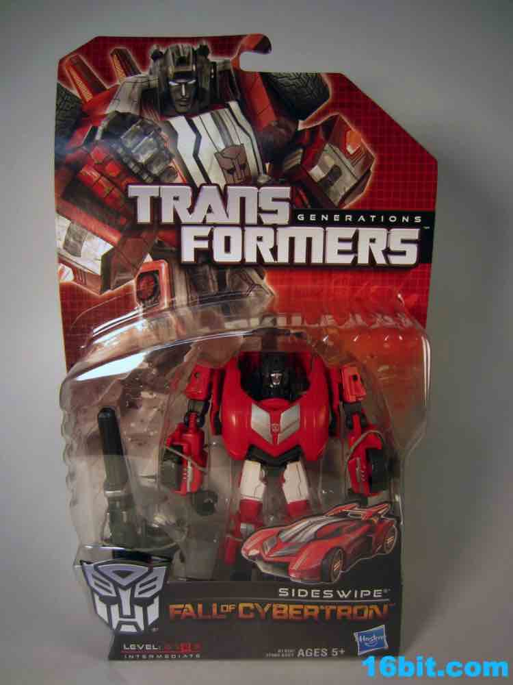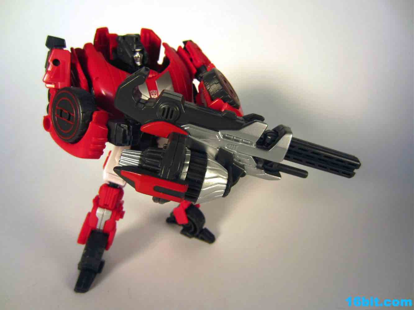 Not as crappy as you might think! Remolded from the questionable Jazz, Sideswipe is effectively the same toy with a new head, a new gun, and a new card body kit. Oh, and a terrible head paint job. (They left the eyes unpainted.) The toy manages to be interesting because it defies expectations and is something most Hasbro toys rarely are these days: fun. The large gun, dubbed the Path Blaster, adds a surprising amount of play to the otherwise ho-hum transforming toy which is probably the most extensive redeco we've seen on a deluxe mold. But let's be clear here... the reason you want this toy is for his gun. If that sounds insane, $15.99 for a deluxe toy and a giant weapon is a far cry from what you probably paid for your third party guns and axes over the last several years.