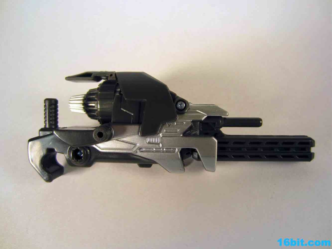 Just for kicks, let's start with the gun. The barrel can actually extend and retract, as far as I can tell for no valid reason other than "because it's cool." At its longest, it measures about 4 1/4-inches long and sports a decent amount of gimmickry. There are painted silver and red highlights, which are quite unusual for most weapons on these toys. There's a spinning, clicking barrel only "spinning" is a bit of an exaggeration. It does make a satisfying "click" and takes a fair amount of effort to make the thing move, which means it's streets ahead of your other Transformers weapons. With 2 5mm pegs, it's easy to connect to Sideswipe in either mode. But wait, there's more! The back of the gun has this undocumented clip feature, so it can be mounted on the rear spoiler of the car. Because of this, there's no doubt the weapon is optimized for this Sideswipe figure... but the pegs are so great and the weapon is so cool, you'll want to pull your other toys out, just so they can take turns messing with it. To me, that's the very definition of a new fun toy in a line I already collect. If any toy worms its way into your core and makes you pull out your other toys to play with, it's a winner.