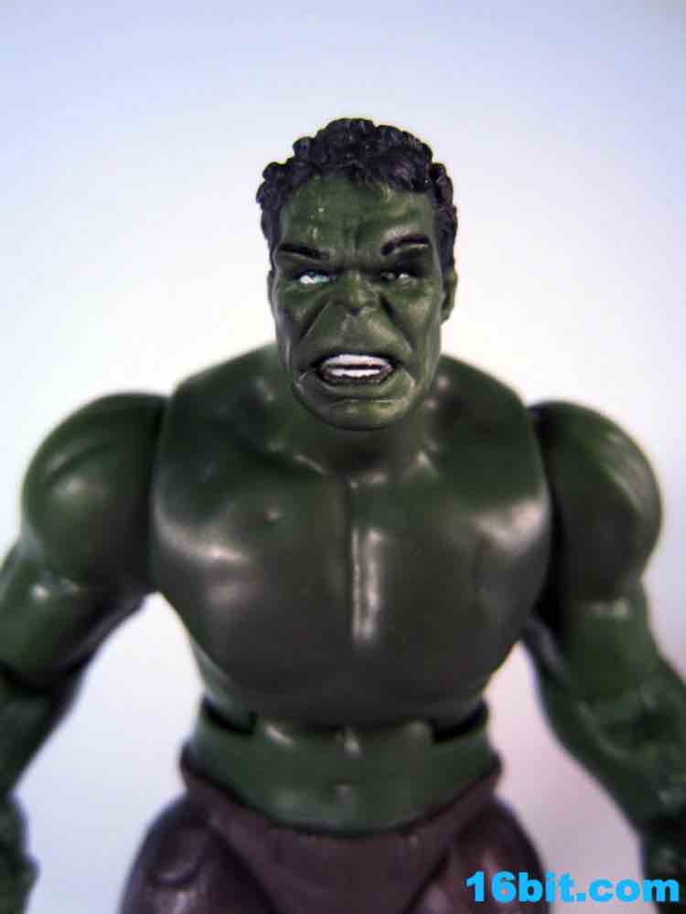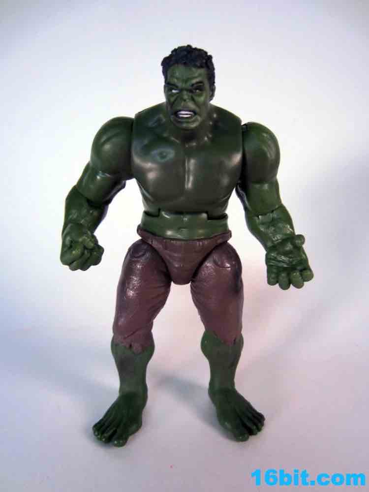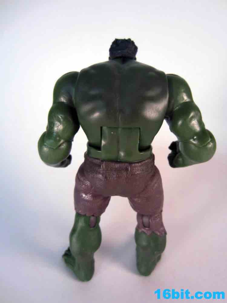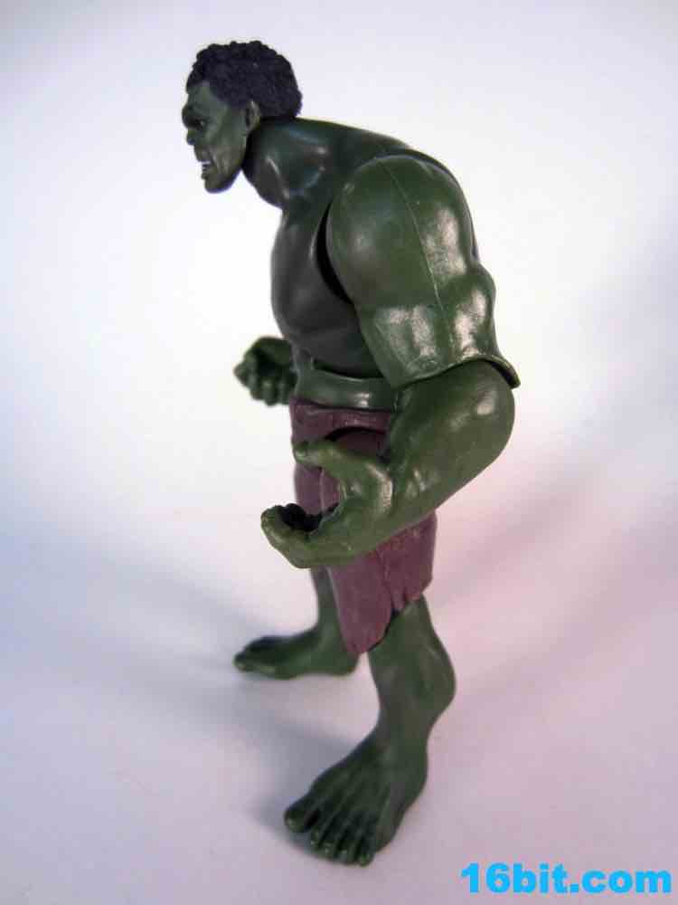 While there's no waist joint, Hulk does have a decent array of articulation which is somewhere between a collector's figure and a kid's figure. You get 10 points of articulation, with what basically amount to bend-and-swivel joints at the shoulders, elbows, hips, and knees. The neck gets a ball joint, and the waist has an ab cruch... there's no swivel here, and there really aren't any swivels in the bulk of the Avengers movie line. Hasbro decided to be more kid-driven, which is why you saw lots of things like Thor's Hammer, Cap's Shield, Hulk Hands, and masks galore. That's where the money is with kids, they're really in to roleplay and dress-up (which is counter to what boys of the 1980s heard, dressing up wasn't really our thing.) Hulk's black hair and somewhat eerie face are sculpted quite well, I didn't much care for how his torso looked but the arms were crazy powerful-looking and the right hand is molded into a handy fist, for punching and/or smashing. I won't lie to you, I had more fun with this figure than any in the entire set. It's a delight to have him hit things. I can't wait for a version that can do uppercuts.