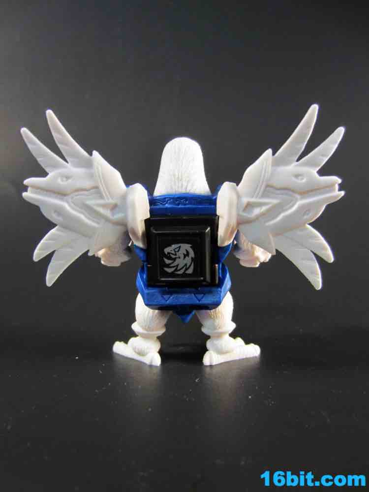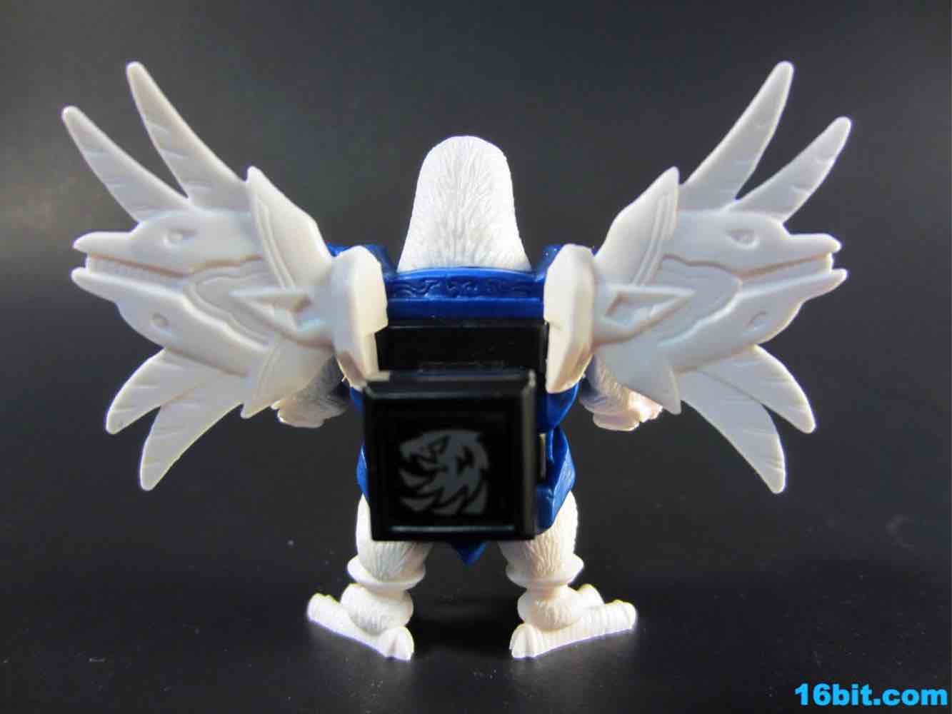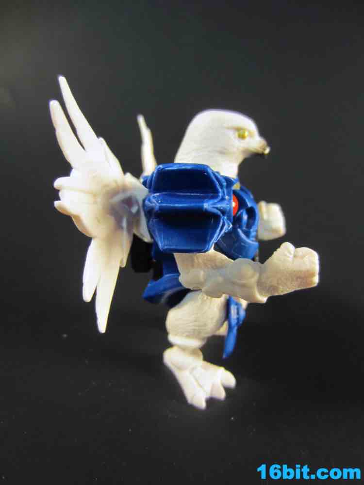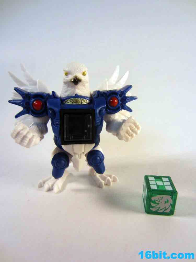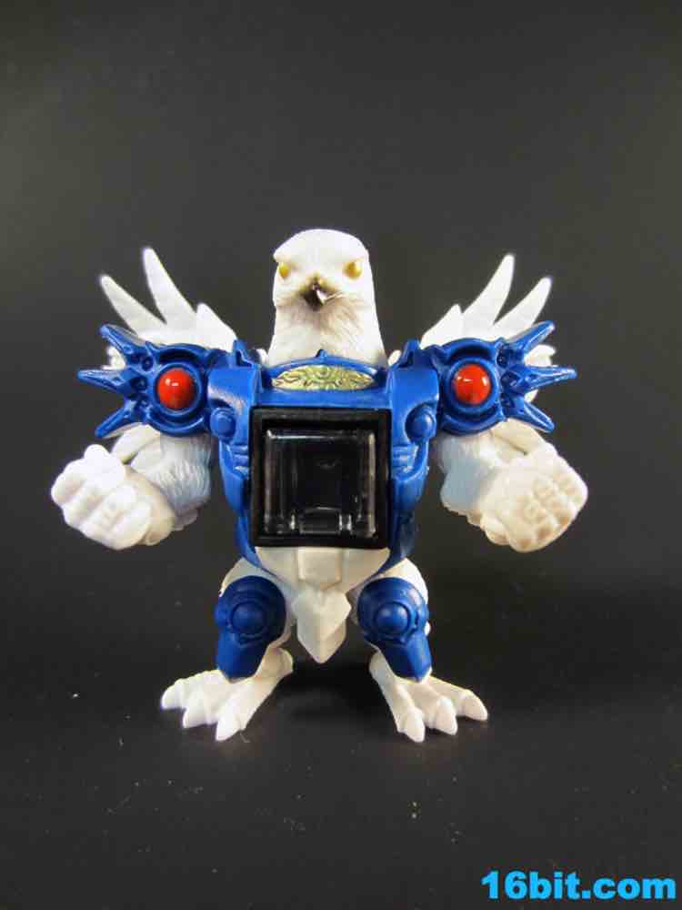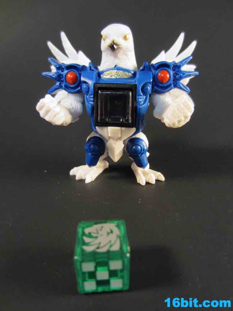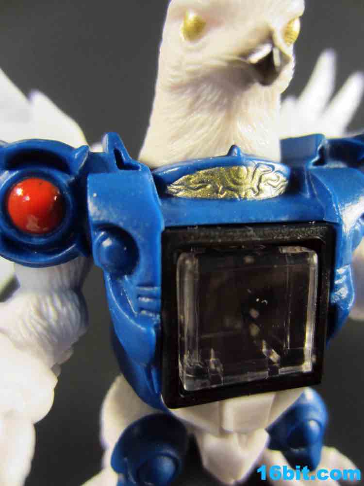 The figure is lightly decorated, with blue and white parts going mostly paint-free. There's some red on his shoulders, a silver necklace/collar, gold eyes, and a black beak. And that's pretty much it. His dice launcher is similar to the basic figures and carries the same dice, so you can switch freely between Gashapon and regular figures. Both of his fists are posed in a pre-launch mode, which seems pretty good given that this figure is, for all intents and purposes, a non-poseable figural dice launcher.