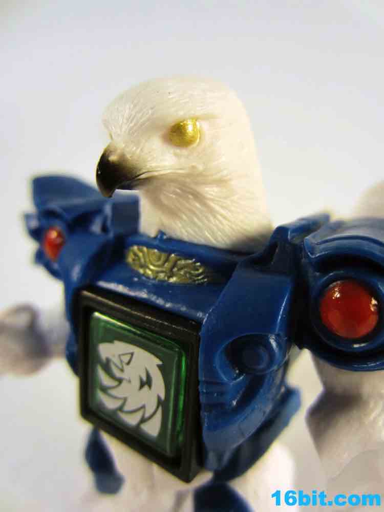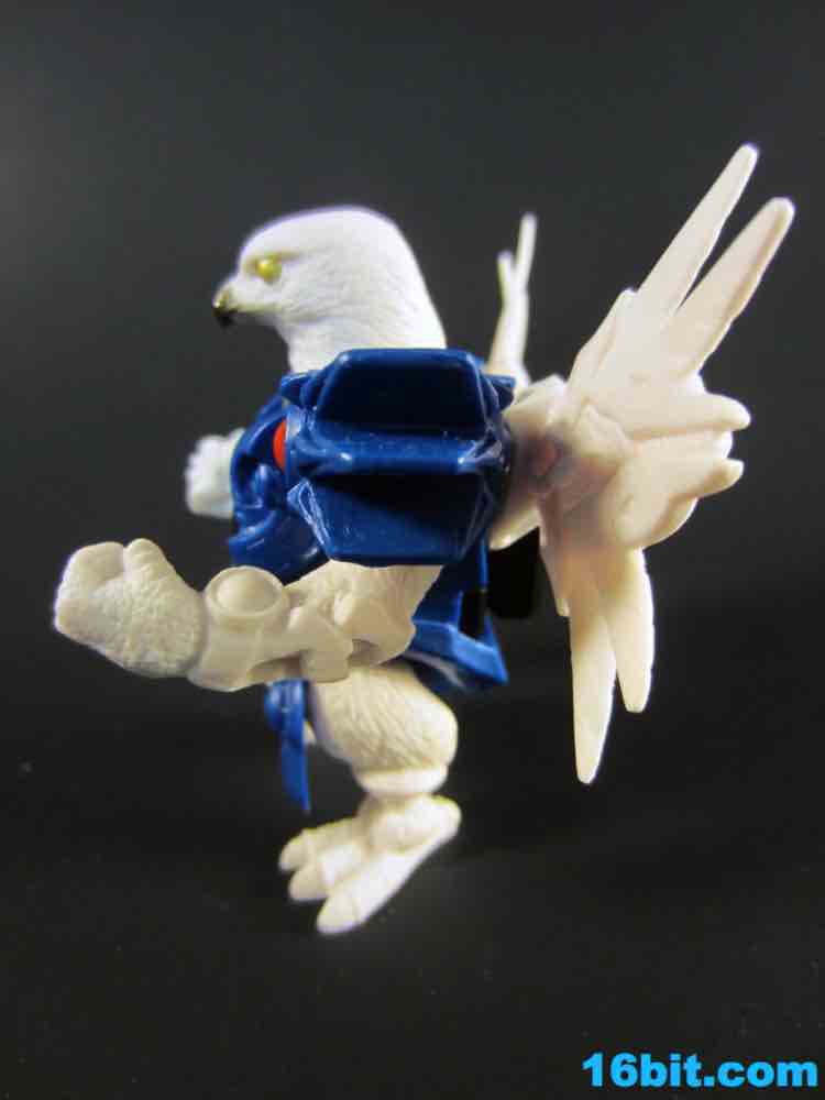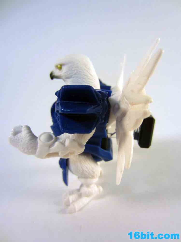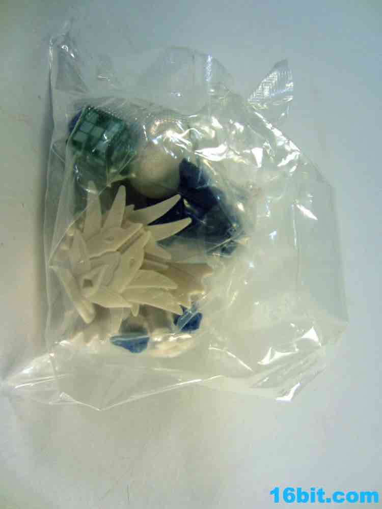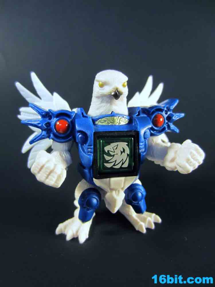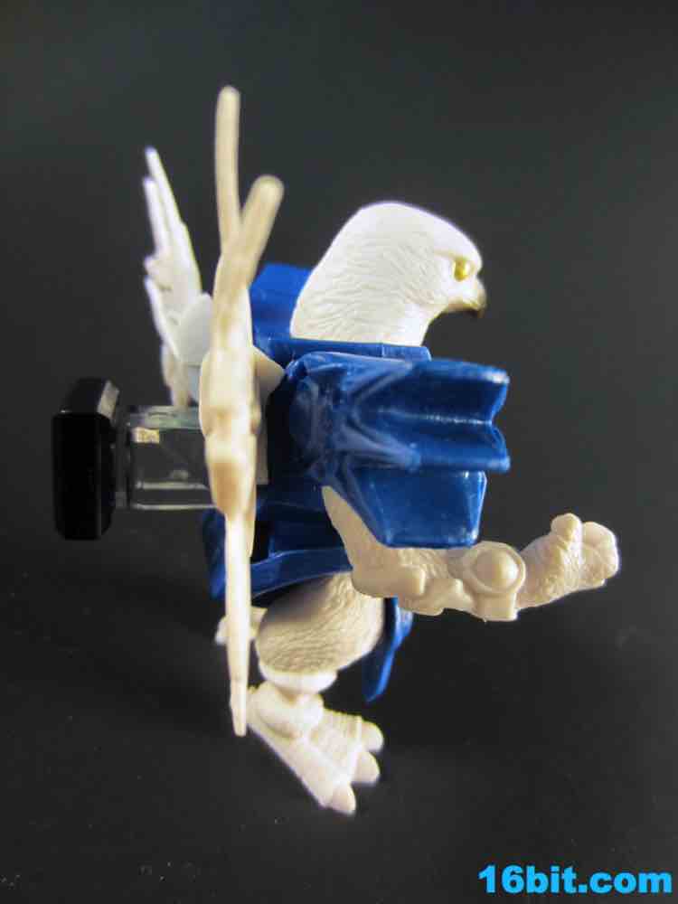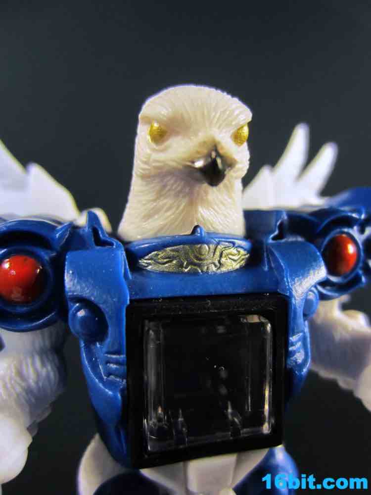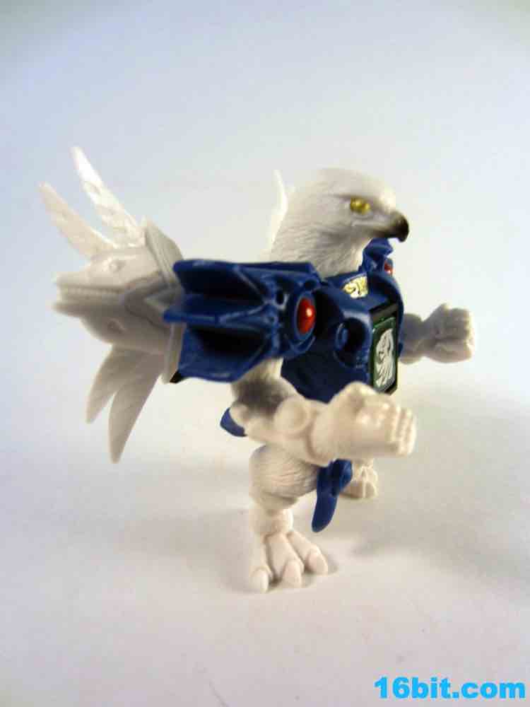 The figure is lightly decorated, with blue and white parts going mostly paint-free. There's some red on his shoulders, a silver necklace/collar, gold eyes, and a black beak. And that's pretty much it. His dice launcher is similar to the basic figures and carries the same dice, so you can switch freely between Gashapon and regular figures. Both of his fists are posed in a pre-launch mode, which seems pretty good given that this figure is, for all intents and purposes, a non-poseable figural dice launcher.