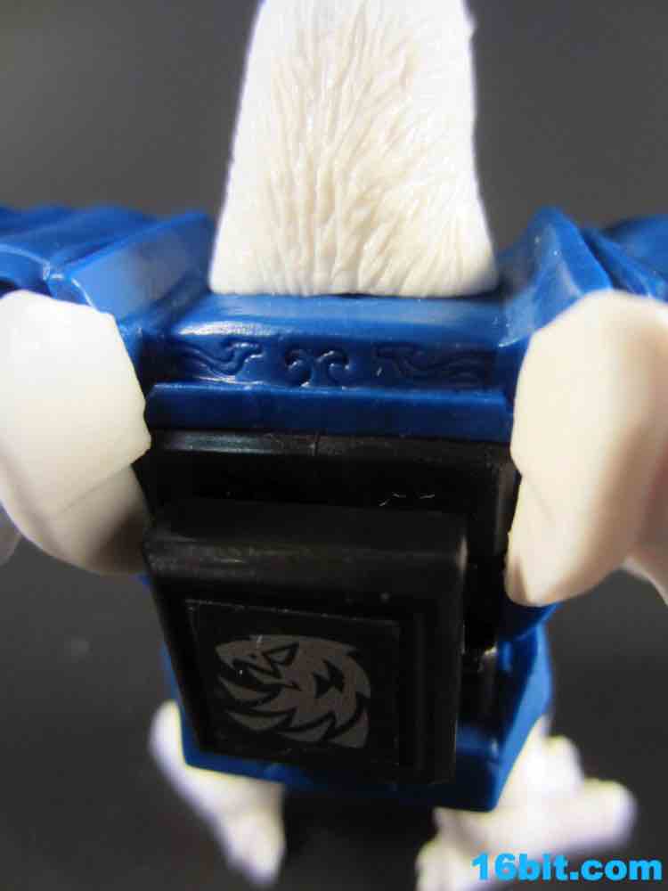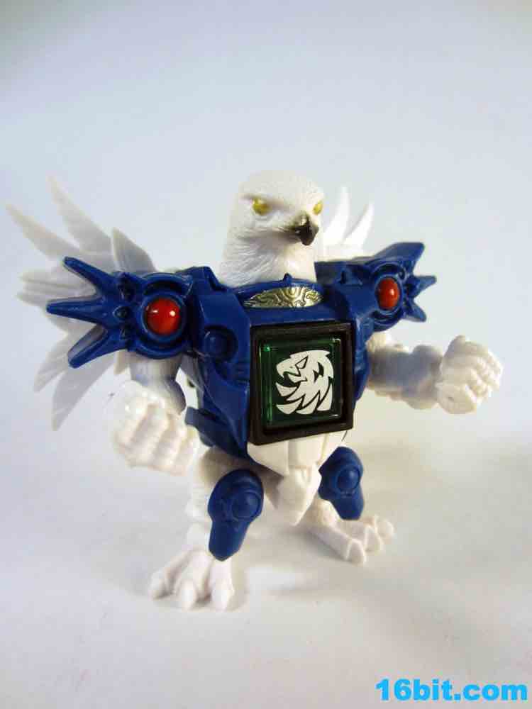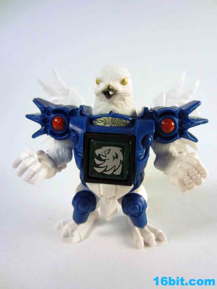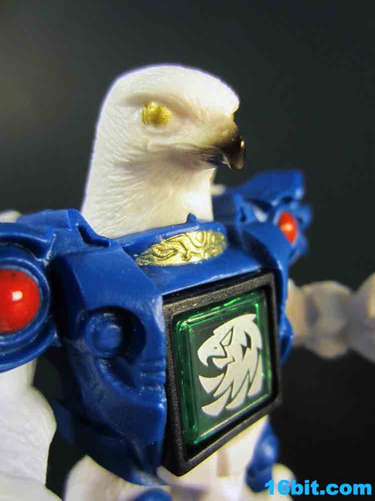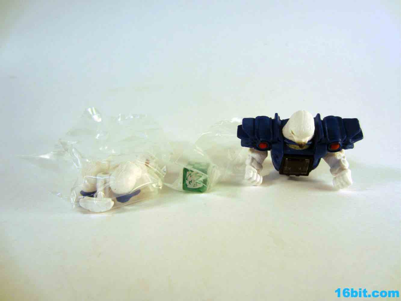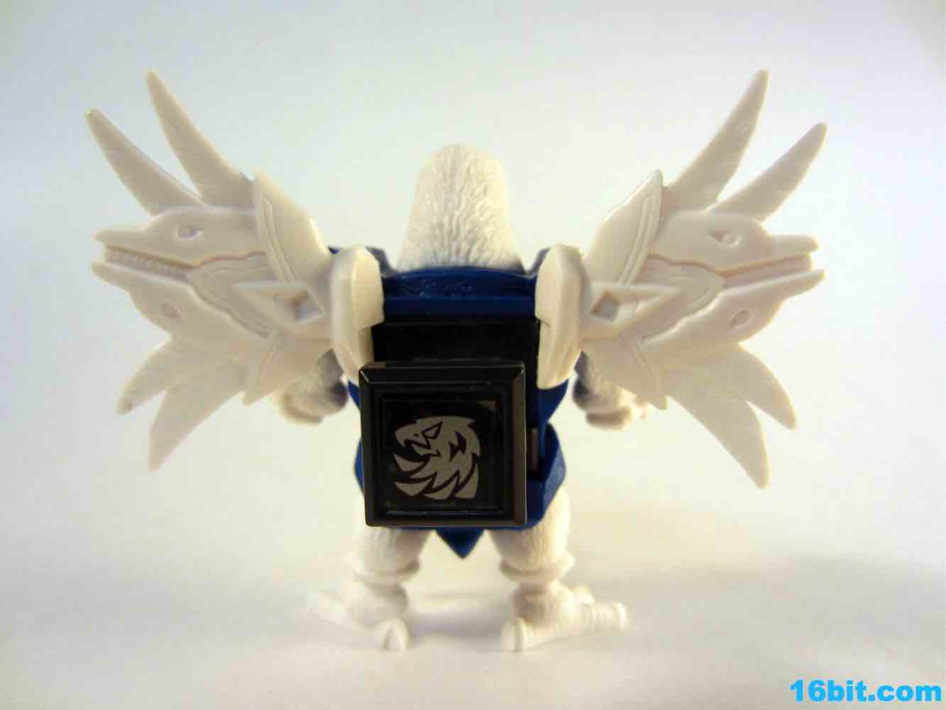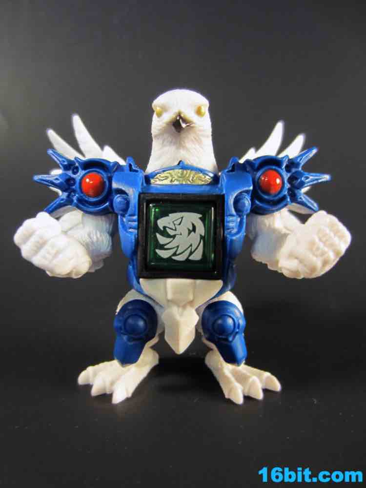 The figure is lightly decorated, with blue and white parts going mostly paint-free. There's some red on his shoulders, a silver necklace/collar, gold eyes, and a black beak. And that's pretty much it. His dice launcher is similar to the basic figures and carries the same dice, so you can switch freely between Gashapon and regular figures. Both of his fists are posed in a pre-launch mode, which seems pretty good given that this figure is, for all intents and purposes, a non-poseable figural dice launcher.