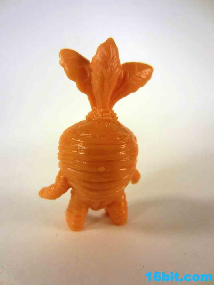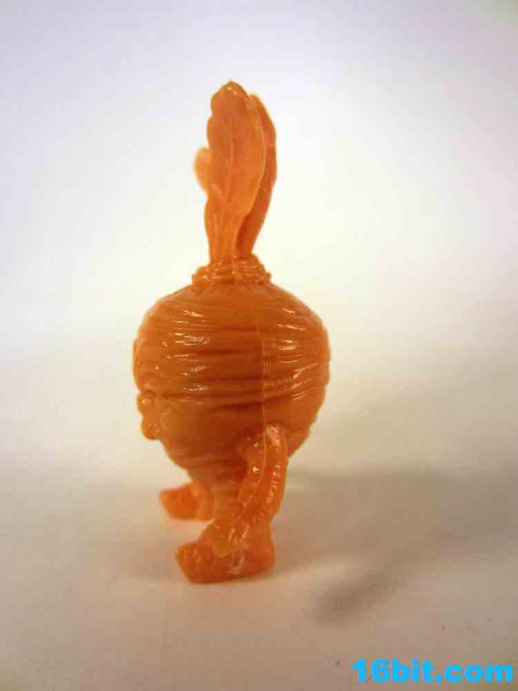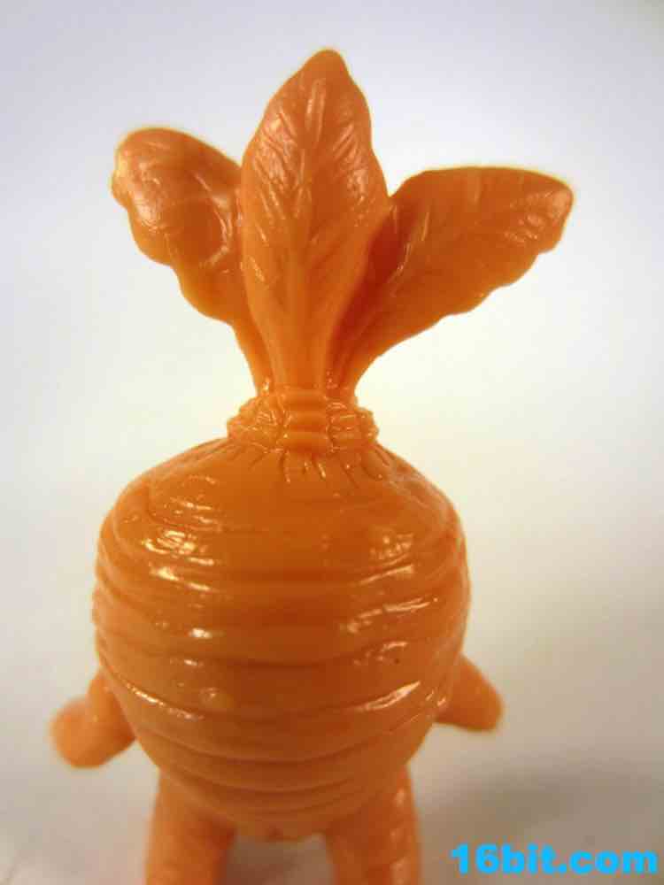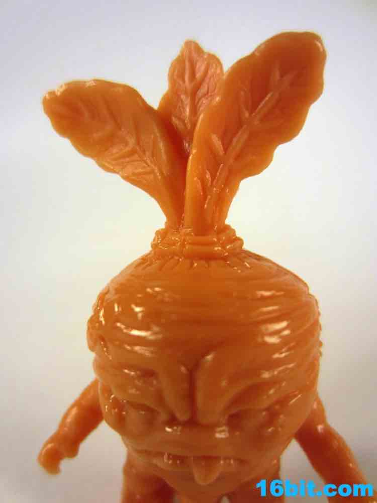 For some reason, recent toys have eschewed traditional copyright markings where you get a year plus the name of the studio, or licensor, or toy company. The young Baby Deadbeet is brimming with sculpted detail but has absolutely no identifying marks, so if a future collector finds this figure and has no idea what it is, I suspect they will have some degree of difficulty locating a name. (Heck, the same is true for all of OMFG.) Standing about 1.6-inches tall, the figure has two beady little eyes, a tongue sticking out, a pair of crossed bandages on its head, plus a generous helping of wrinkles and warts. He stands just fine on tiny legs, and has some of the smallest sculpted plastic hands I've seen on a collectible figure. Even more fascinating, the tiny vegetable has what appears to be a cleft in its butt region, down the back of the tail. It's a small detail, but along with the wrinkles and changing textures near the stem and leaves it's appreciated.