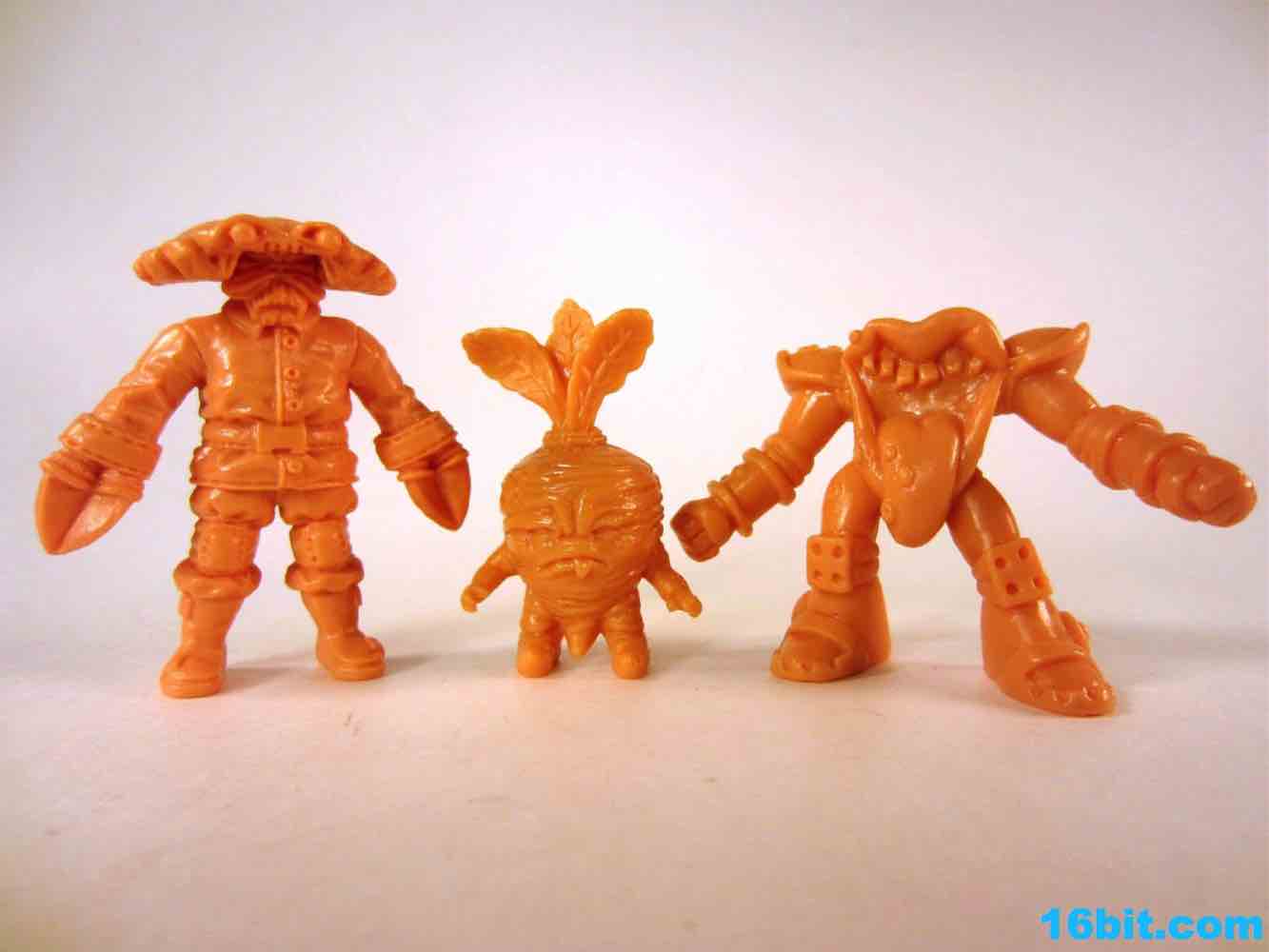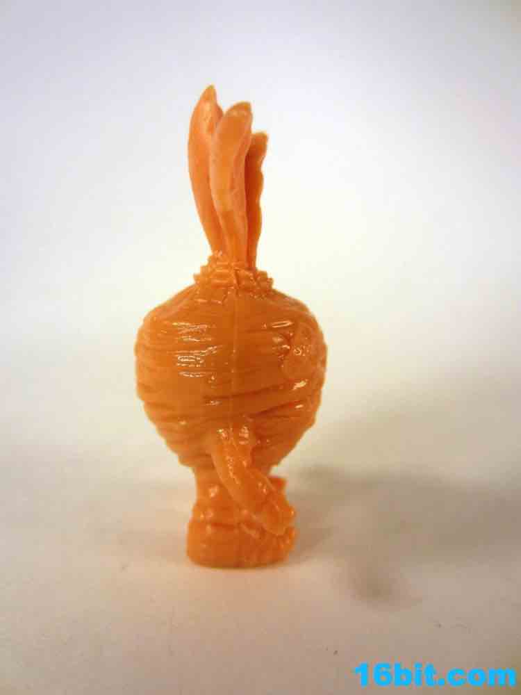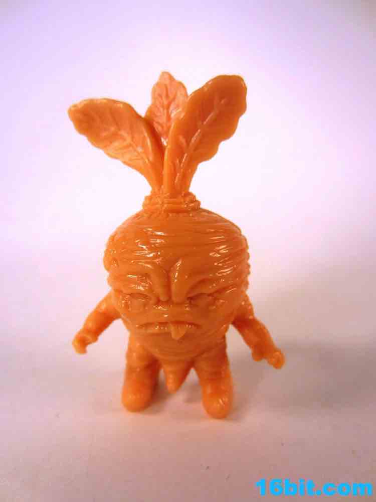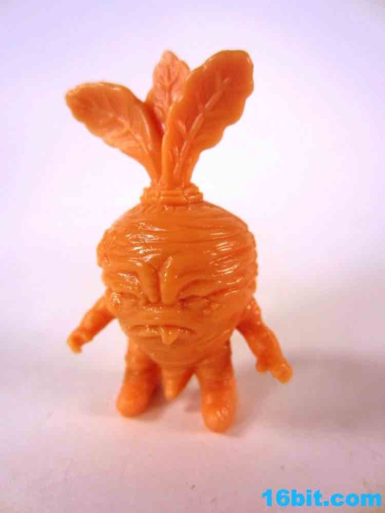 For some reason, recent toys have eschewed traditional copyright markings where you get a year plus the name of the studio, or licensor, or toy company. The young Baby Deadbeet is brimming with sculpted detail but has absolutely no identifying marks, so if a future collector finds this figure and has no idea what it is, I suspect they will have some degree of difficulty locating a name. (Heck, the same is true for all of OMFG.) Standing about 1.6-inches tall, the figure has two beady little eyes, a tongue sticking out, a pair of crossed bandages on its head, plus a generous helping of wrinkles and warts. He stands just fine on tiny legs, and has some of the smallest sculpted plastic hands I've seen on a collectible figure. Even more fascinating, the tiny vegetable has what appears to be a cleft in its butt region, down the back of the tail. It's a small detail, but along with the wrinkles and changing textures near the stem and leaves it's appreciated.