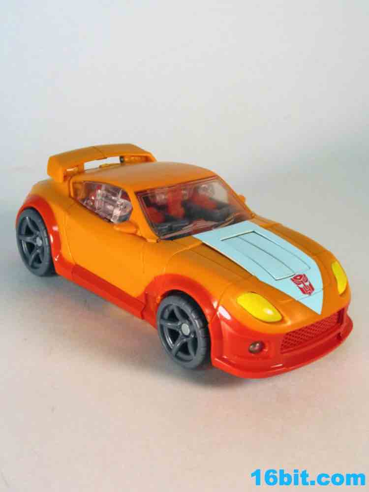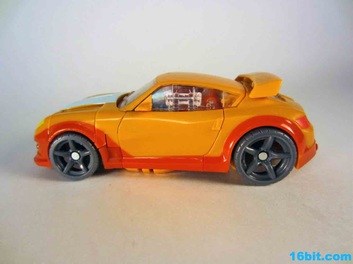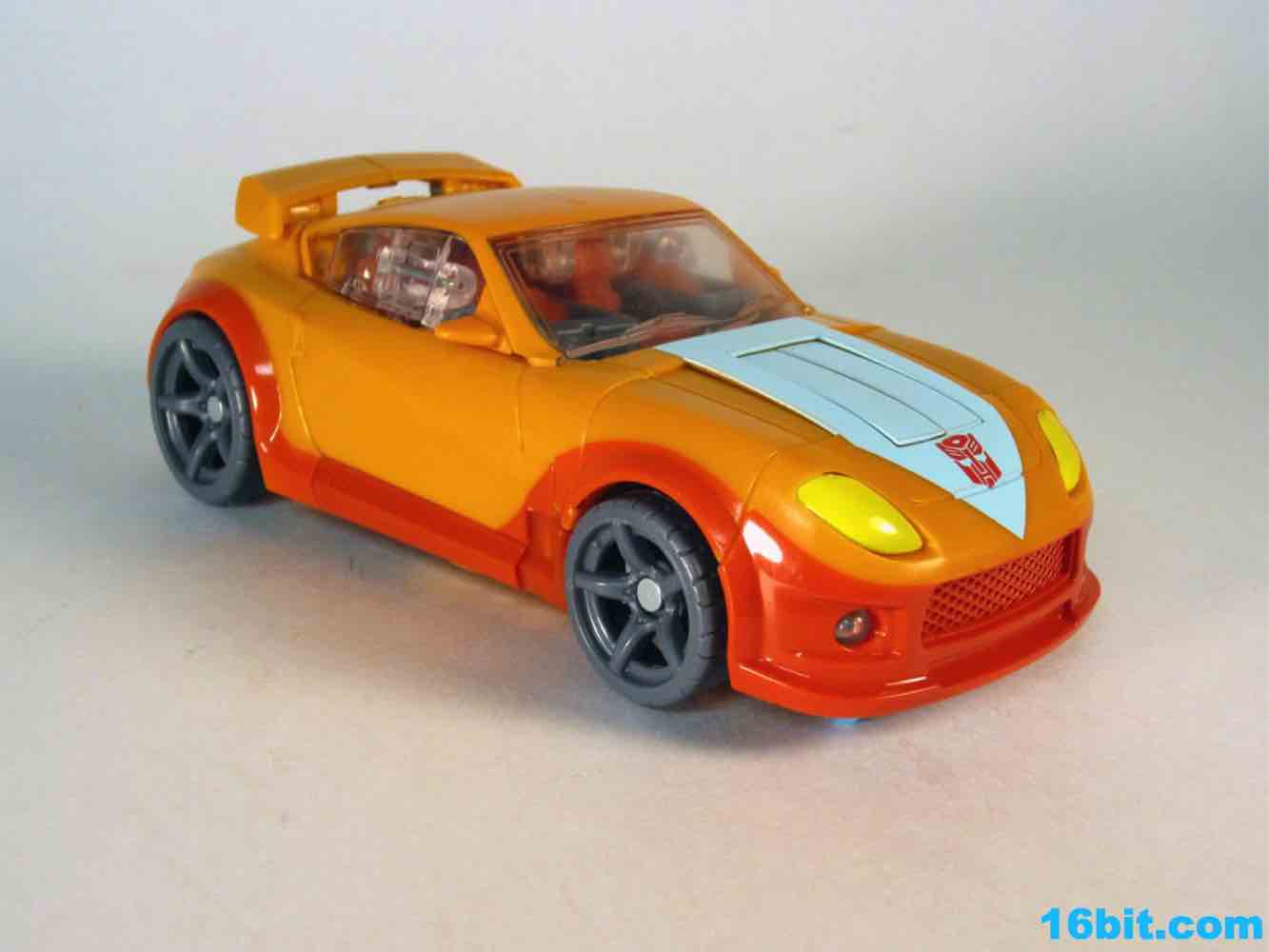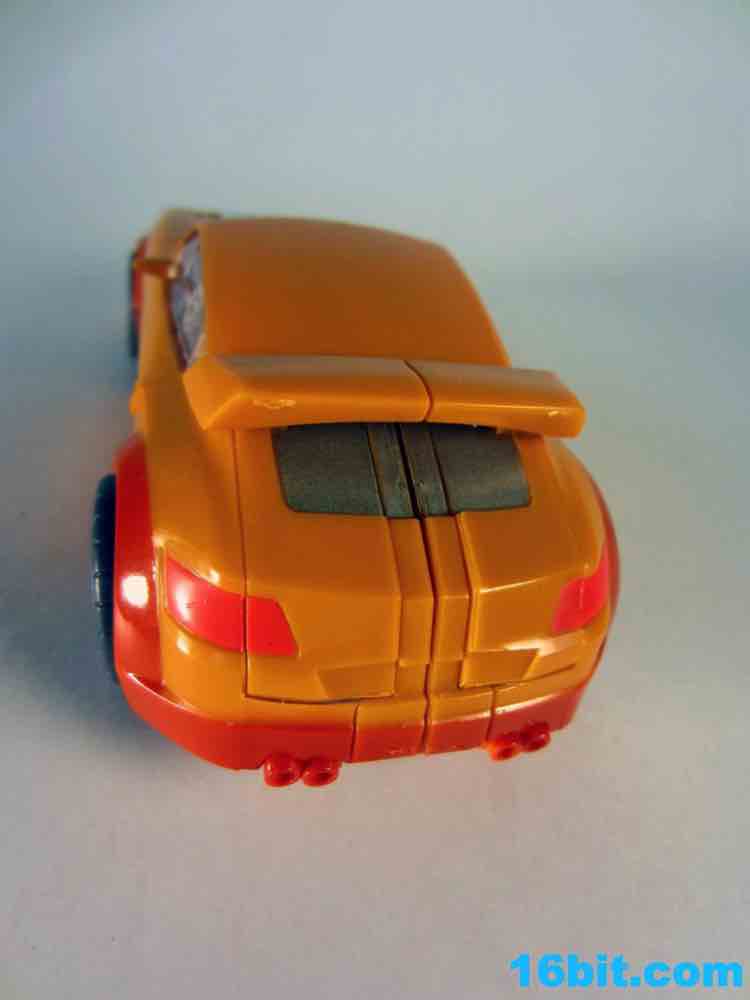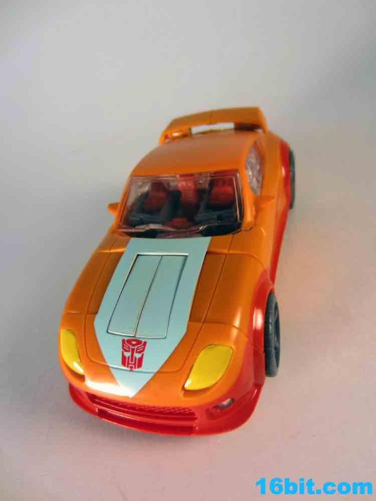 The car is on par with other uses of the mold. Since the only real changes are the robot mode's head and weapon, it just looks like Jazz in orange. The wheels spin (more or less) and it looks pretty slick.