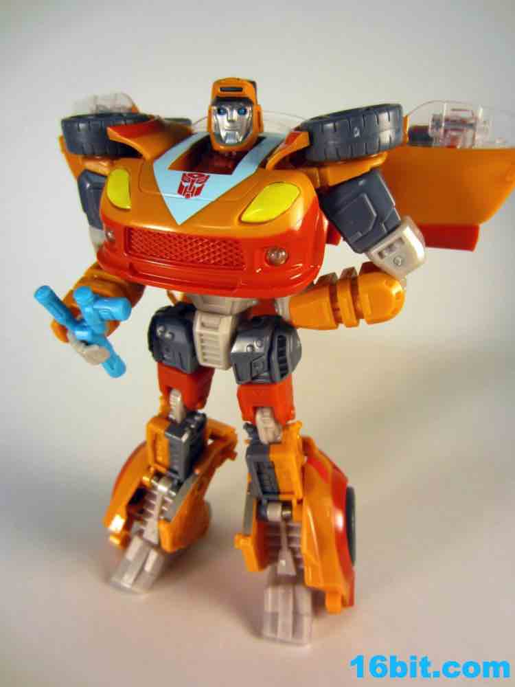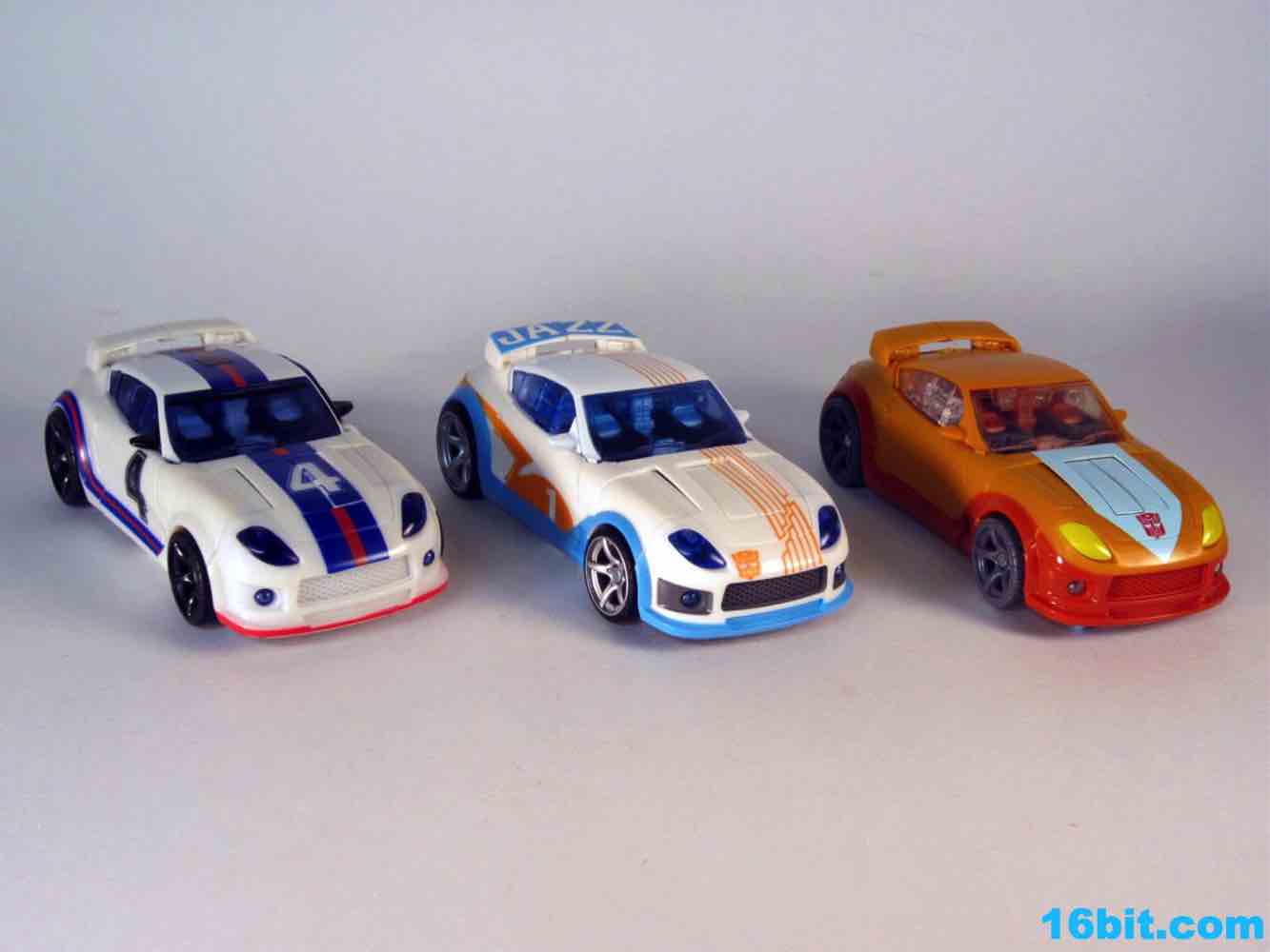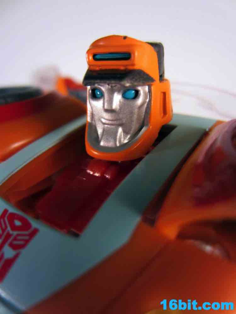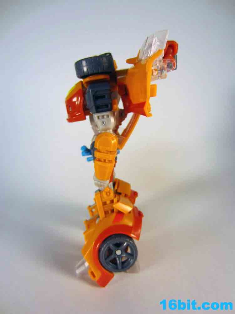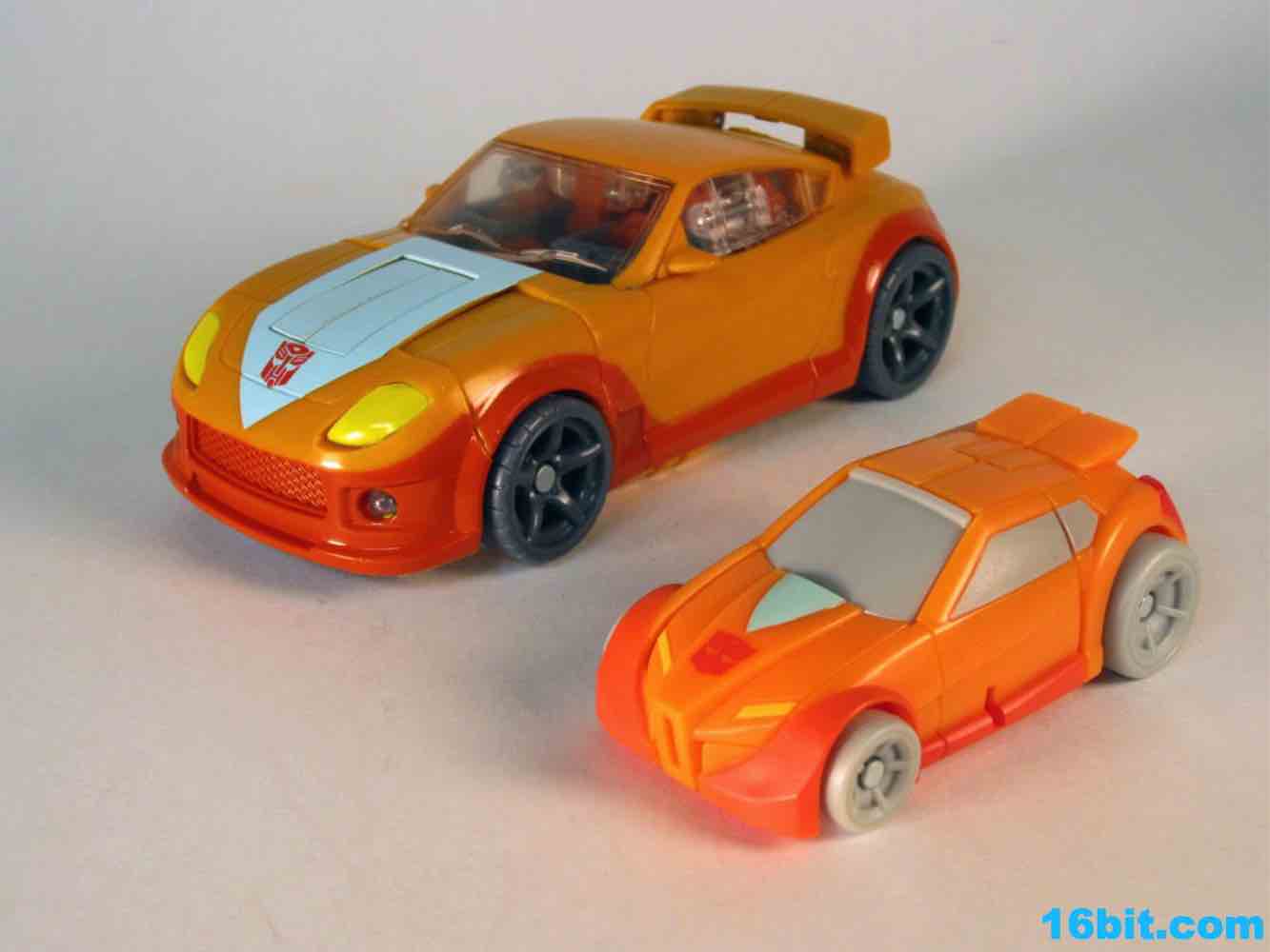 The car is on par with other uses of the mold. Since the only real changes are the robot mode's head and weapon, it just looks like Jazz in orange. The wheels spin (more or less) and it looks pretty slick.