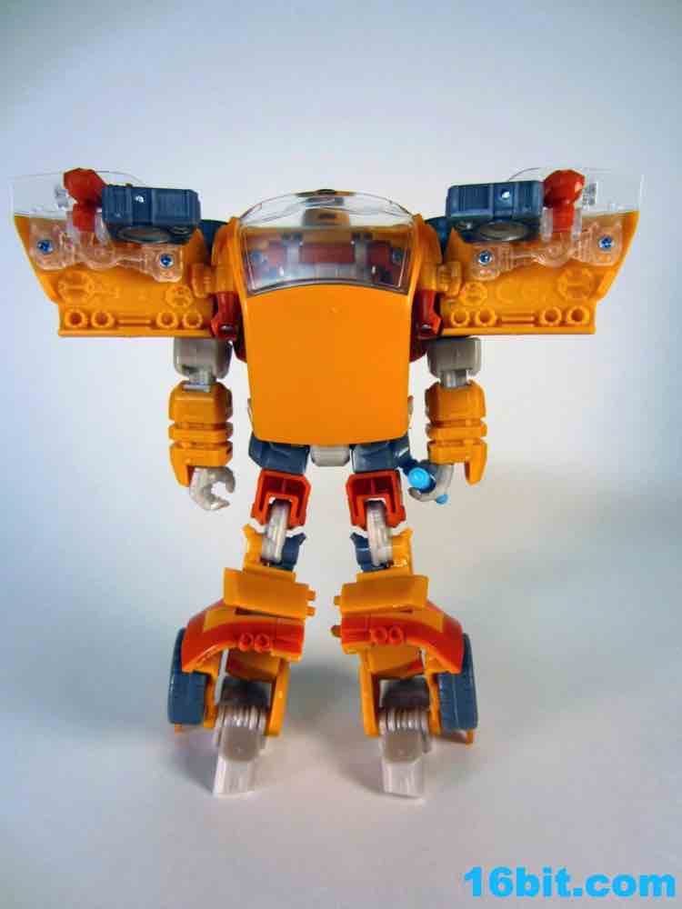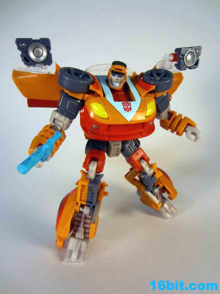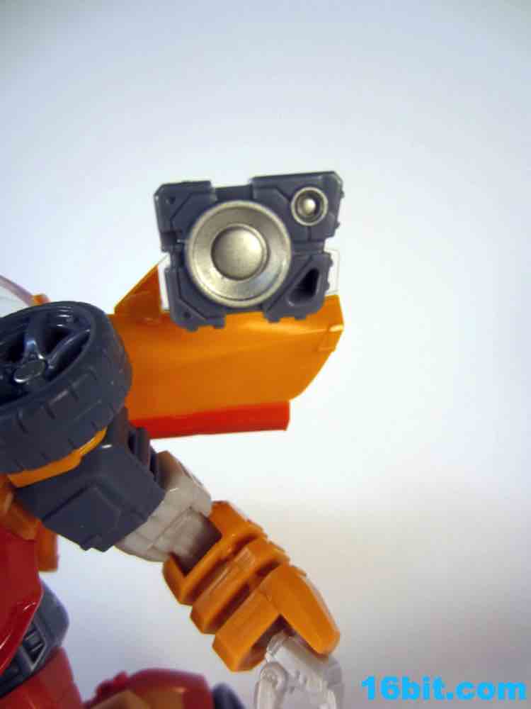 The orange robot has a lot of great highlights, with blue/gray highlights on his chest, a bright blue slingshot which doubles as a gun, clip-on speakers, and tons of articulation.