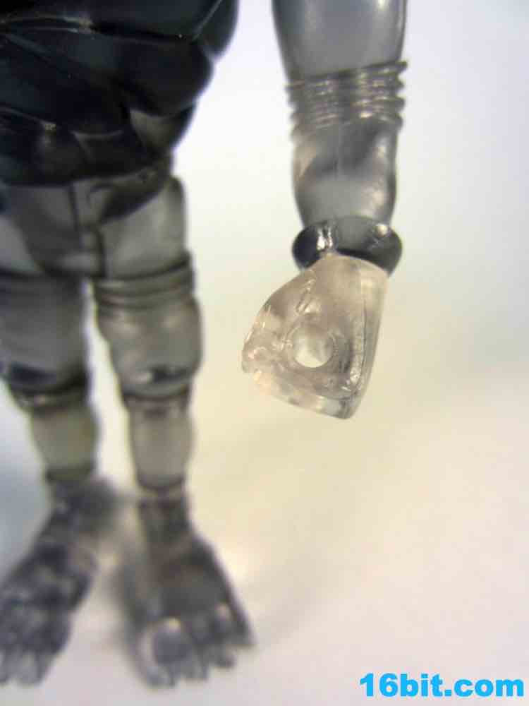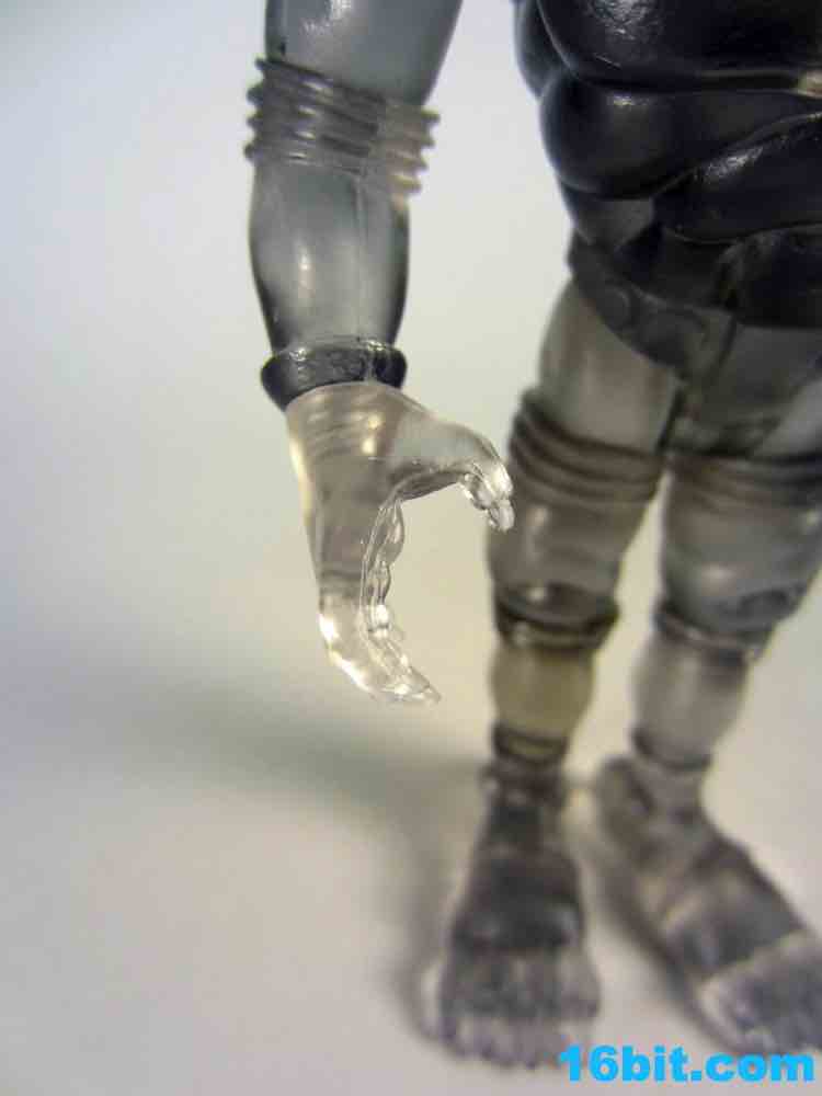 This figure has more "action figure functionality" than the rest, incorporating some clever design.shtmlects surrounding his twin ray guns. The yellow blasters may be stored in holsters in the armor's belt, or in the closed fists. And if you don't like the closed fists, you get opened, clawed hands. They fit pretty well in either place, although I should note that it seems the smoke Cyclops can hold his guns in the holster more easily than the blue version. The blue version, at least on my sample, is a smidgen looser.