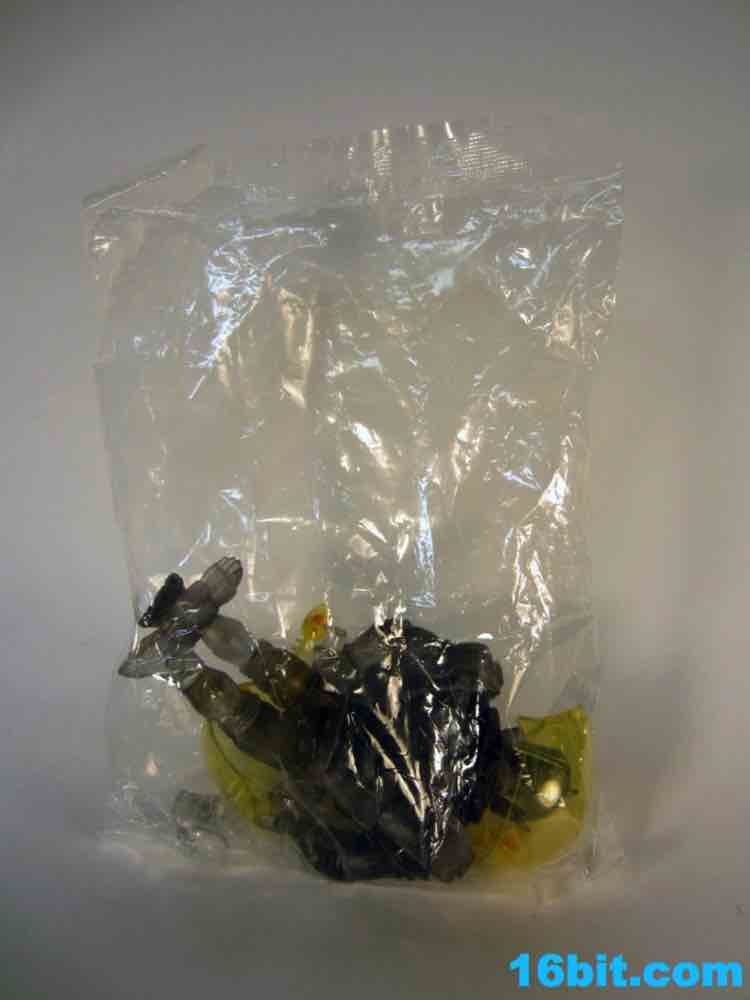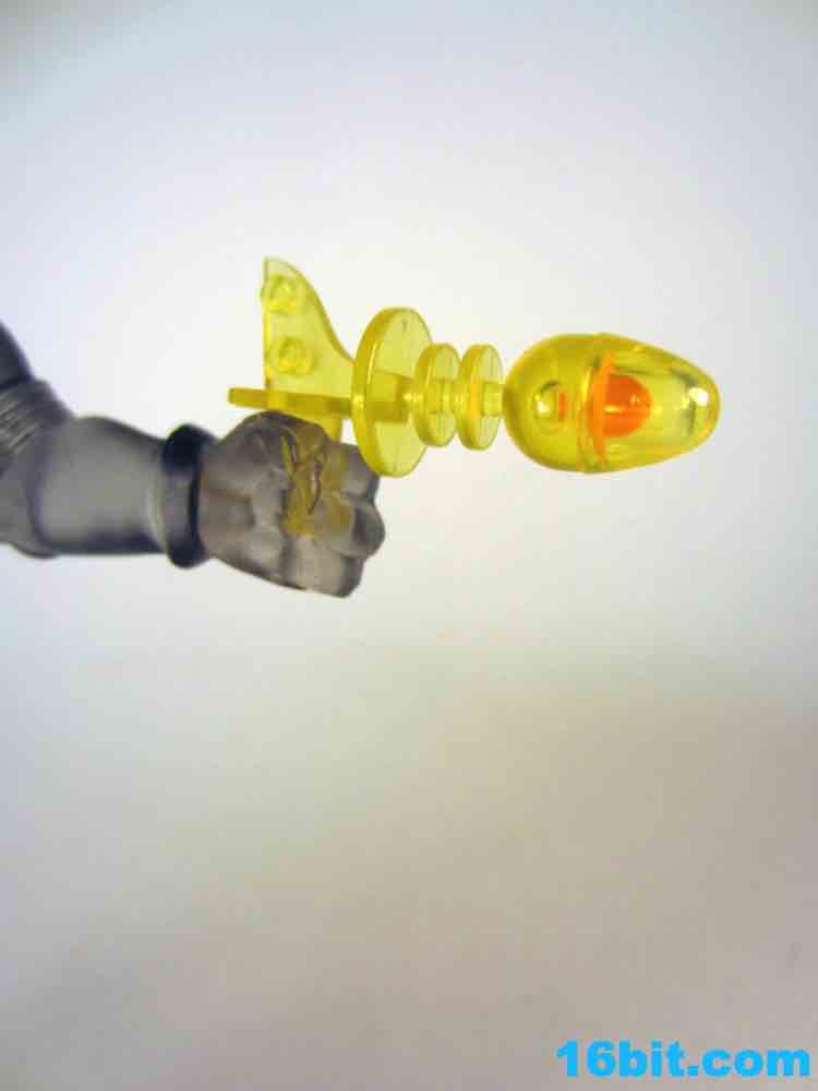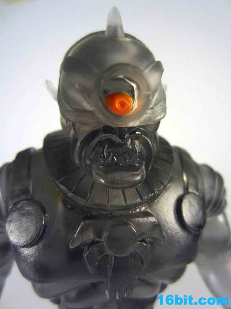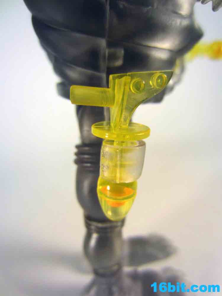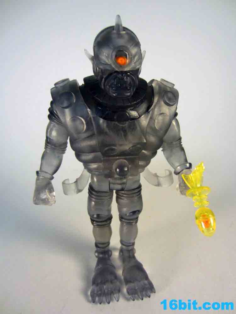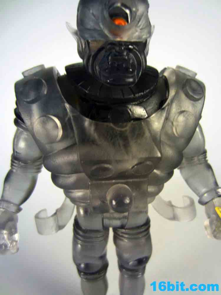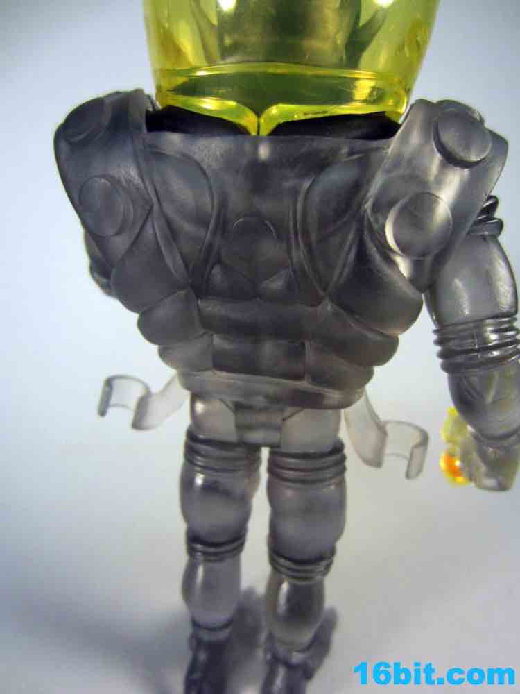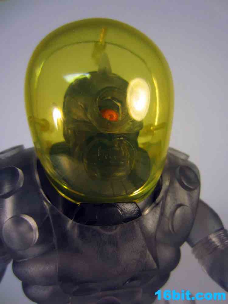 This is one beefy figure. It's huge-- it towers above the other figures in the line and it feels like there must be twice as much plastic as an average figure in here. Largely unpainted, the figure is cast in clear smoke plastic with a single orange eye. He gets a little more color from his yellow helmet, but wait there's more! He has a clear helmet under his 2-piece helmet, plus removable 2-piece armor with working holsters for his guns. If this were a $20 figure by itself, I don't think I could complain in the slightest. (But for $65 with the other two, well, complaining is easy.)
