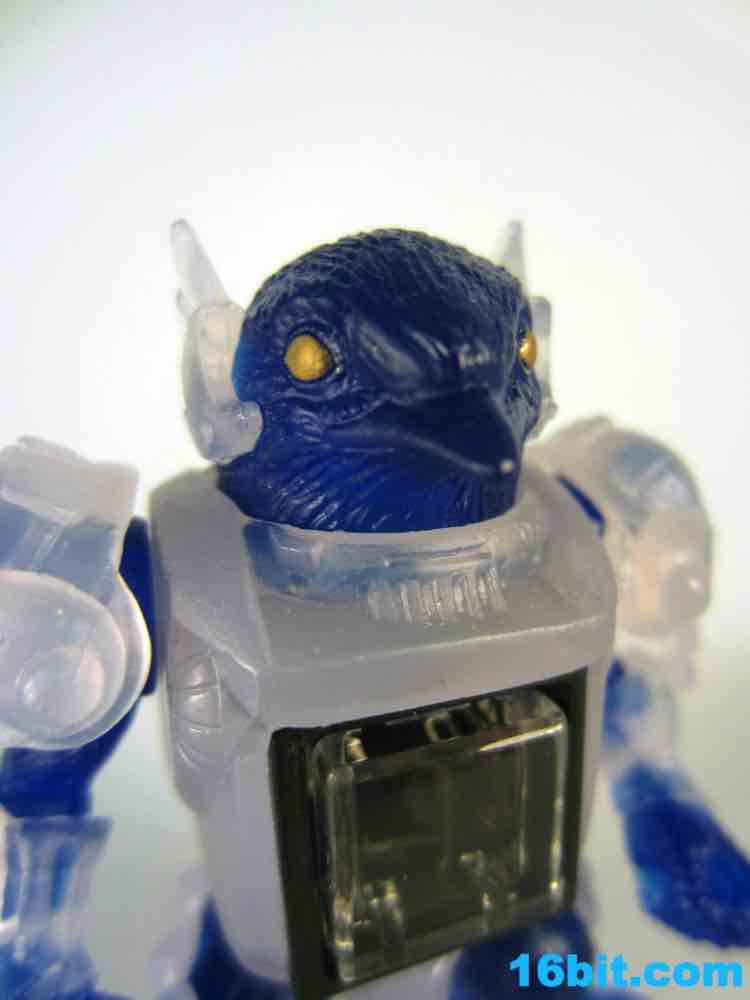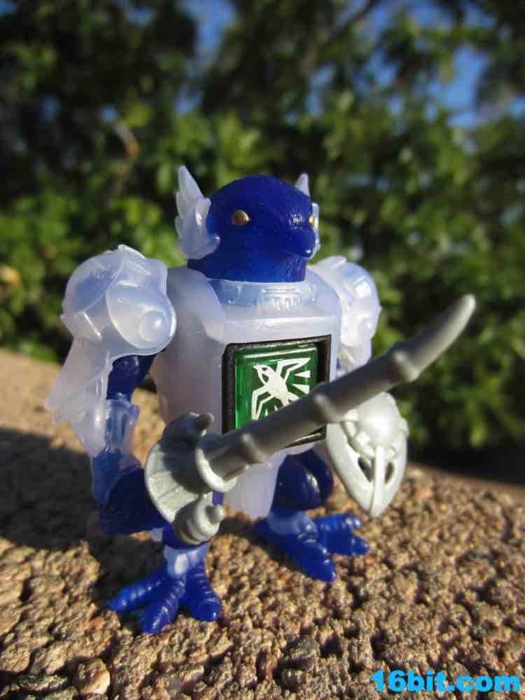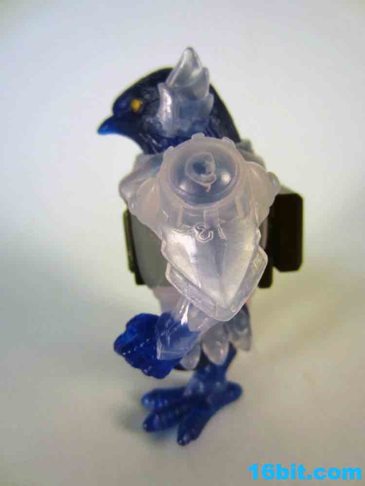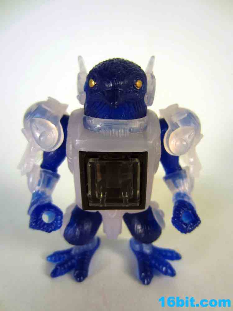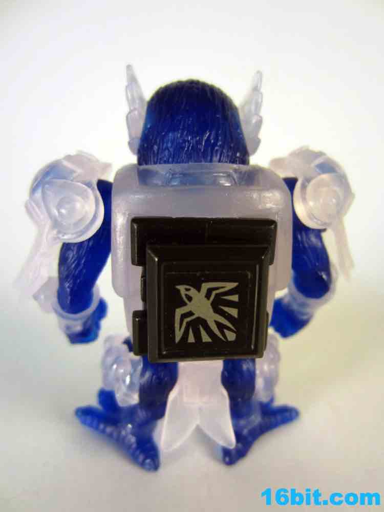 The figure has 4 points of articulation and is is pretty clear. The jewel-like look is really nicely done here, as the clear, sort of colorless plastic is set of by a rich, deep clear blue. Devoid of paint save for his gold eyes, the figure looks really weird. And great. The sculpt is wonderful, but the color combination feels like a product which fell out of a time warp. This is like the negative-universe version of another real toy.