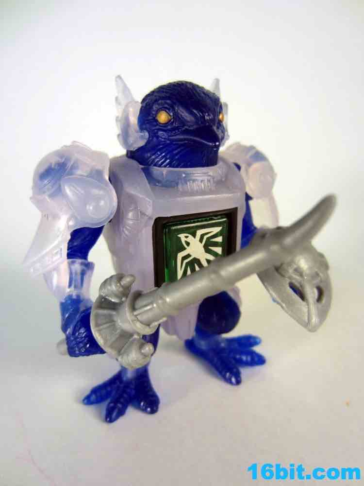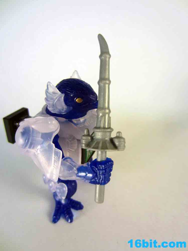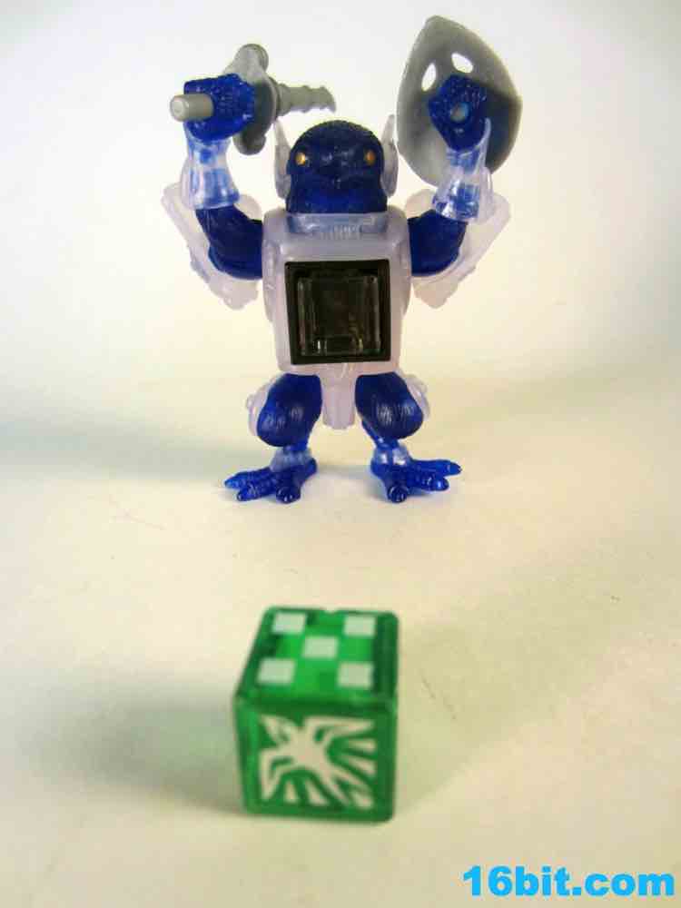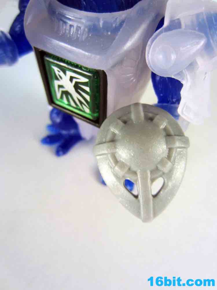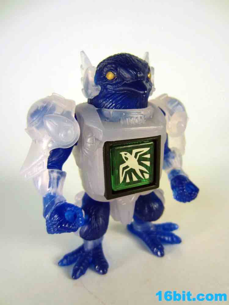 The figure has 4 points of articulation and is is pretty clear. The jewel-like look is really nicely done here, as the clear, sort of colorless plastic is set of by a rich, deep clear blue. Devoid of paint save for his gold eyes, the figure looks really weird. And great. The sculpt is wonderful, but the color combination feels like a product which fell out of a time warp. This is like the negative-universe version of another real toy.
