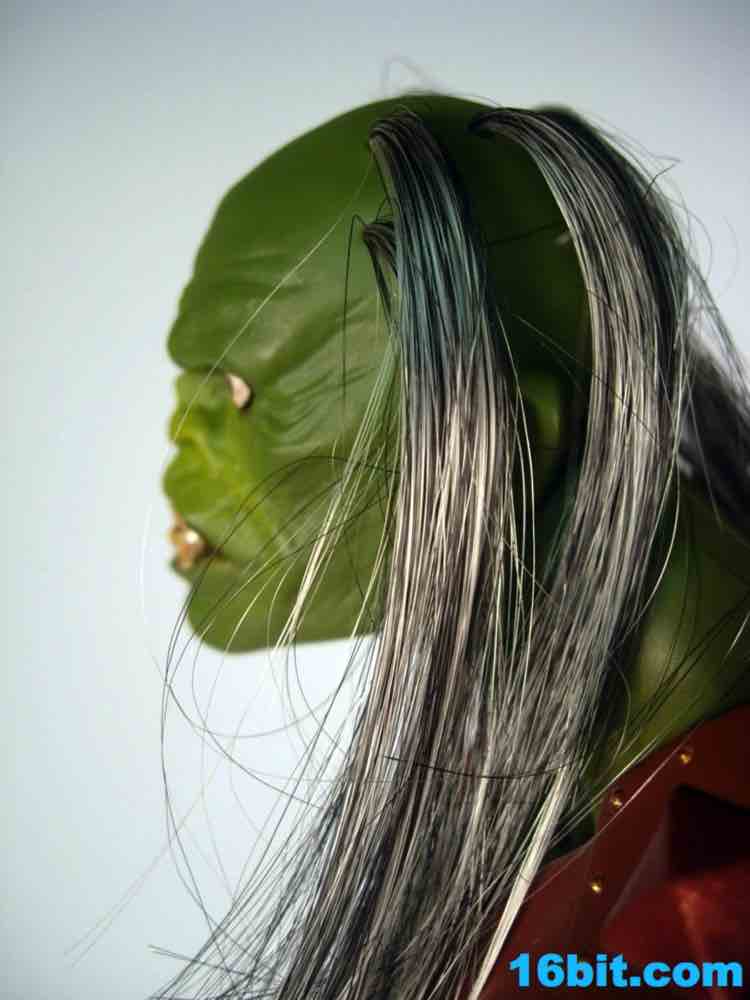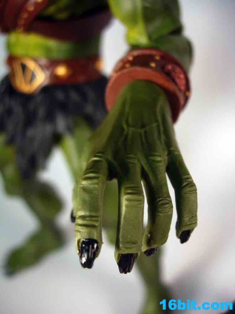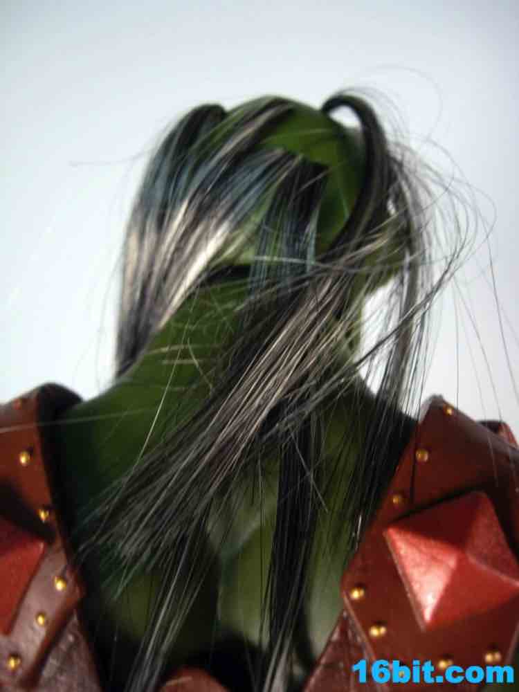 The head is nicely done, and there's an alternate "zombie" head as a bonus. At the time it was meant to be a mystery accessory, which was sort of confusing to me as I don't get surprises in toys I've bought. Of course, this entire line is really one big surprise when you get down to it. Either head is exquisitely painted with great deco on the eyes and teeth, plus the zombie head has rooted hair if you're in to such things. The default head has black plastic hair, which hangs rather well.