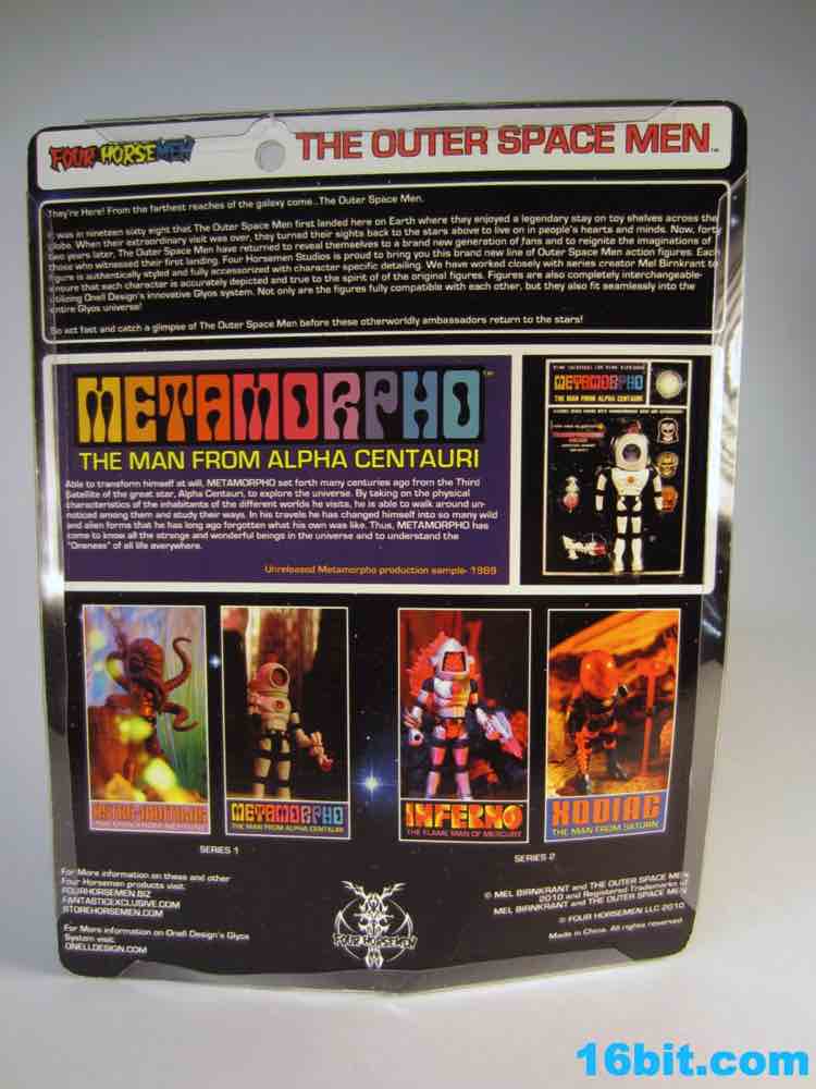 Four Horsemen Outer Space Men 2.0 Metamorpho Action FigureThousands of years ago, series creator Mel Birnkrant posted on a forum that the original Metamorpho did not quite meet his expectations. He was hoping the figure's helmet would be cast in a translucent white color and suggested you swap the painted figure's helm with a glow-in-the-dark one to achieve the desired effect to allow more light in to help the face glow while inside the helmet. A tricky innovation, to be sure, but Mr. Birnkrant is quite the lightsmith when it comes to his toys. He knows what light can do to make them look better.